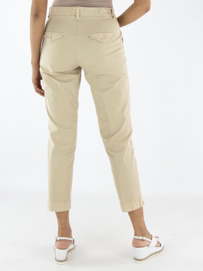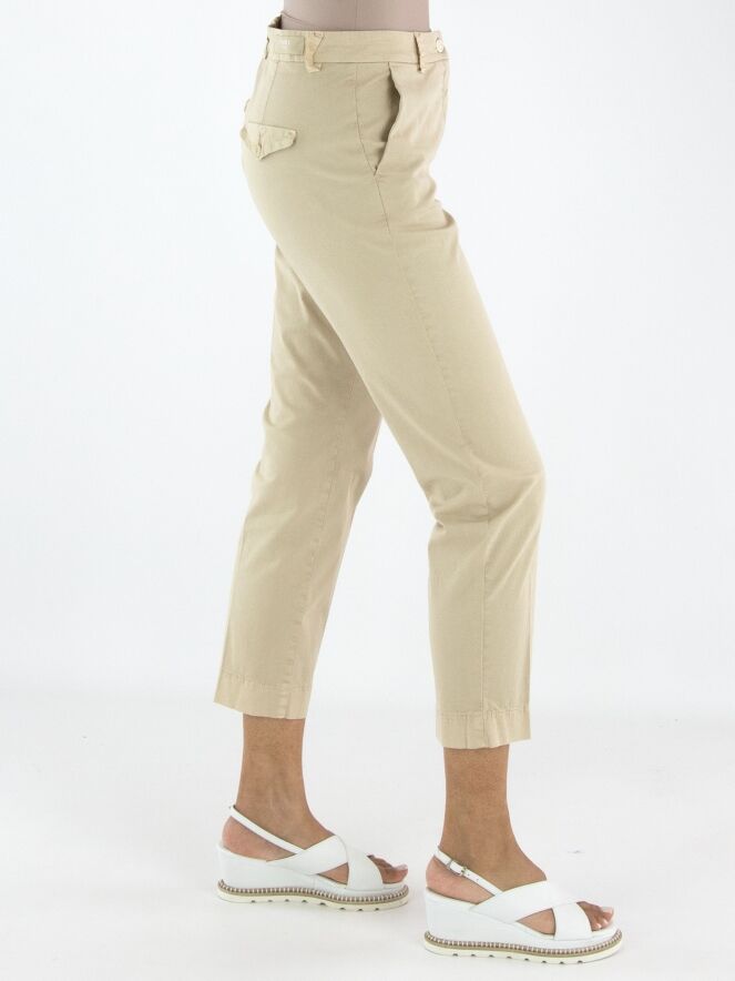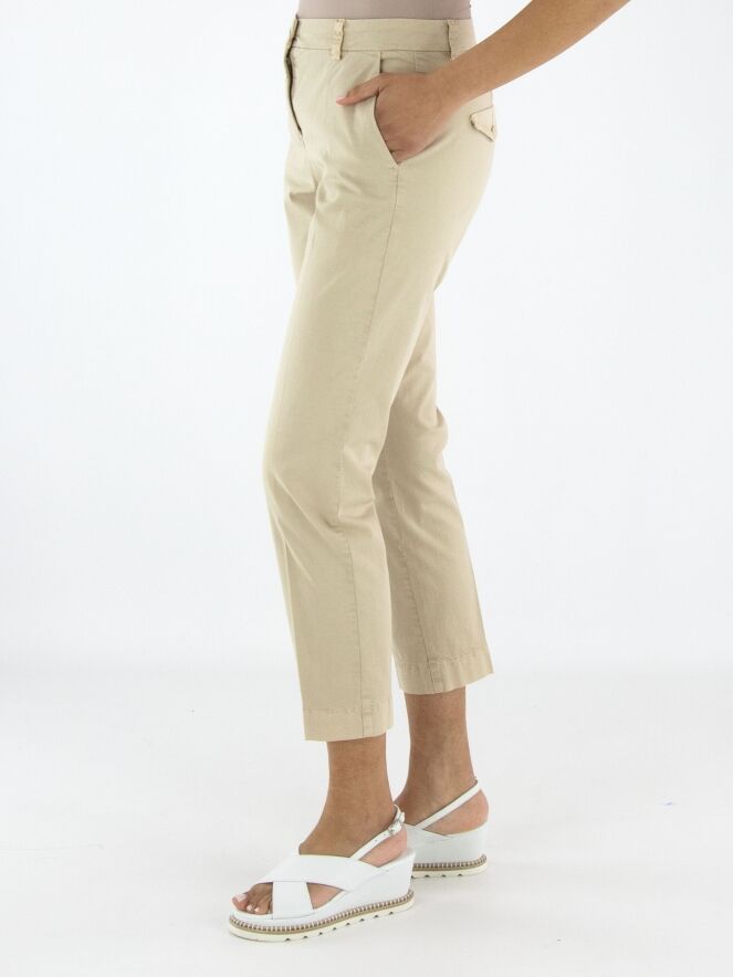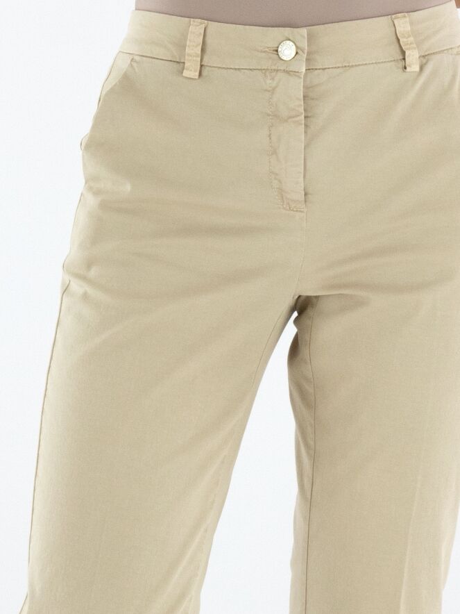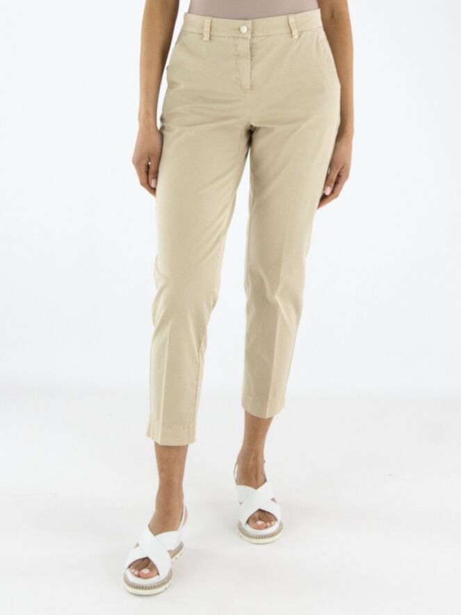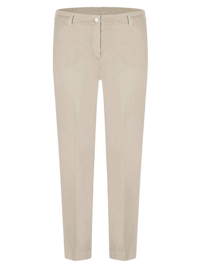 Een broek van Cambio in de kleur zand. De broek heeft steekzakken en een ingestreken plooi in het midden van de pijpen. Deze broek kan op 30 graden worden gewassen.