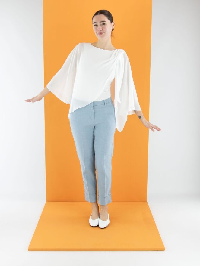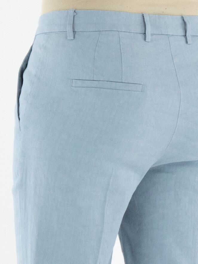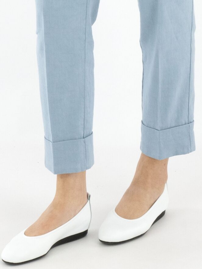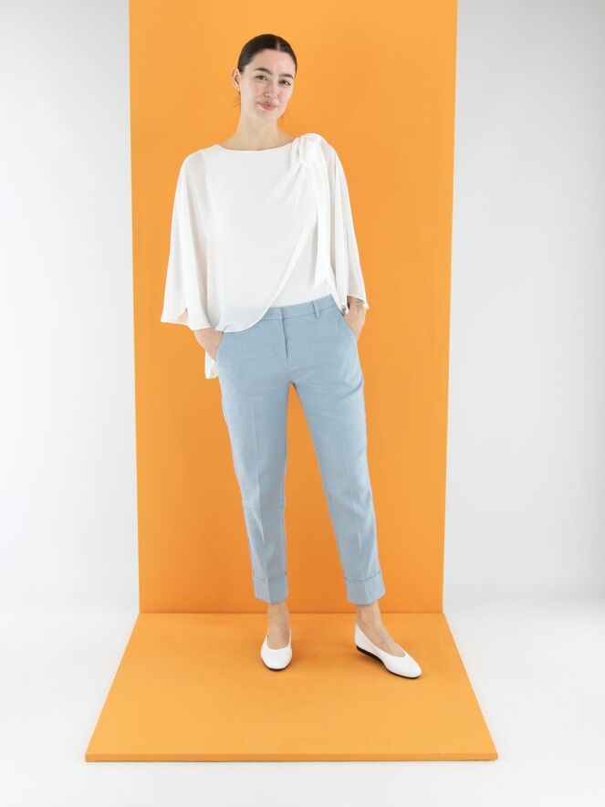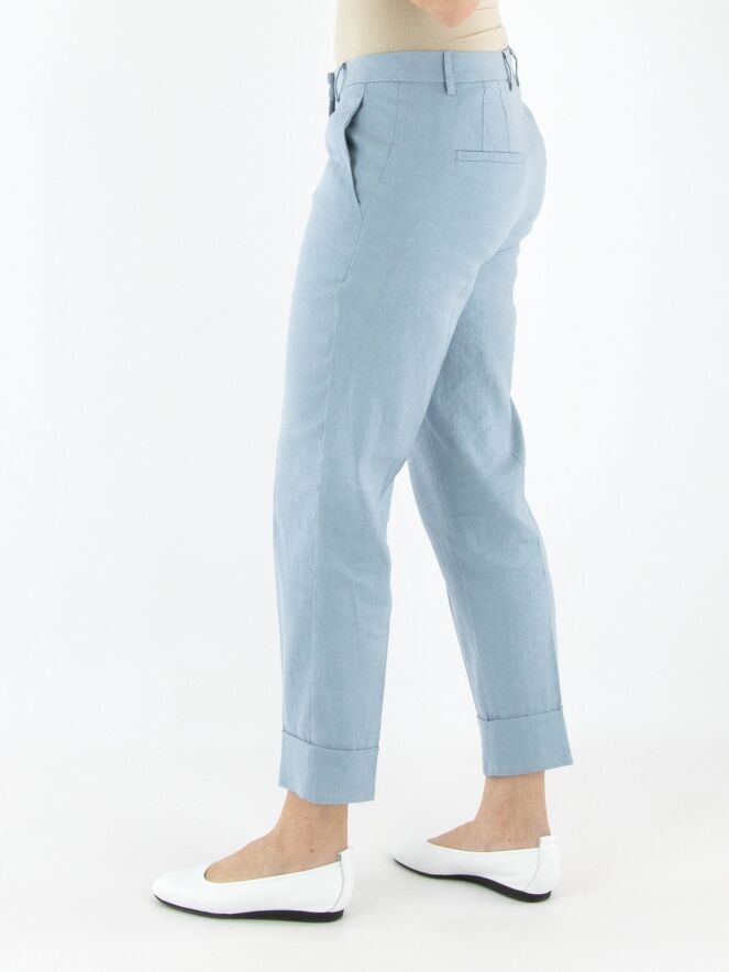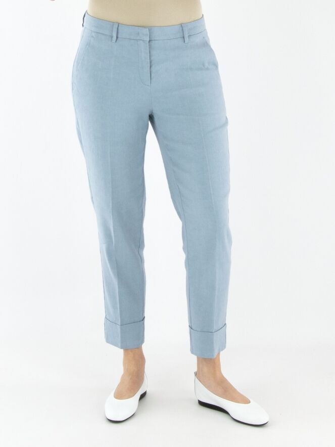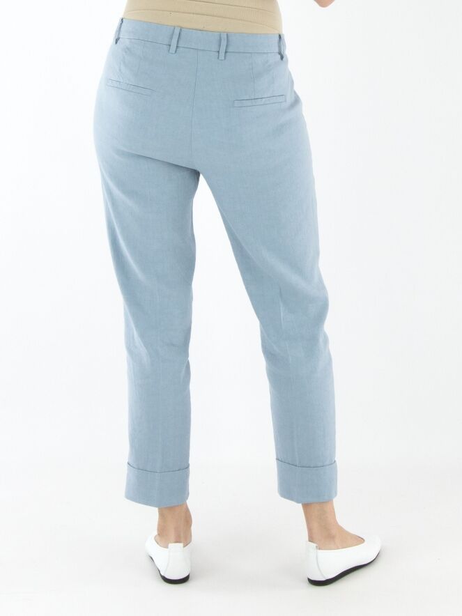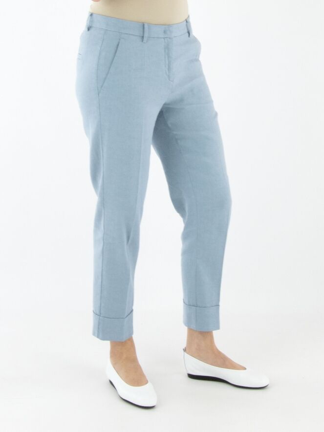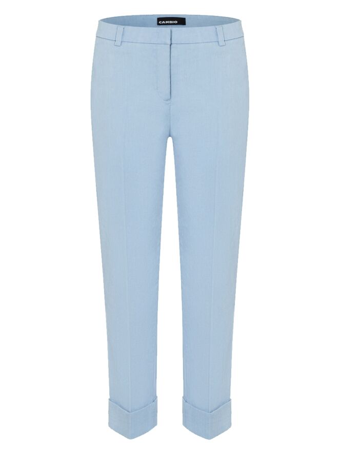 Een broek van Cambio in de kleur lichtblauw. Aan de onderkant van de pijpen bevindt zich een brede, dichtgestikte omslag. In het midden van zowel de voor- als achterkant is een ingestreken plooi verwerkt. De broek heeft steekzakken en dient met de hand te worden gewassen.