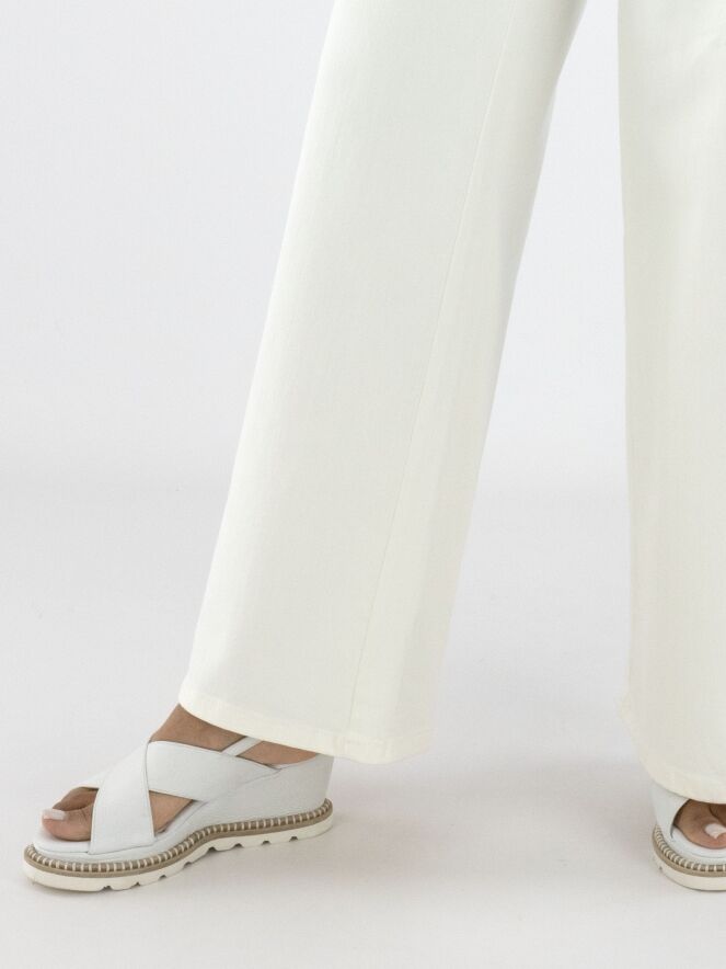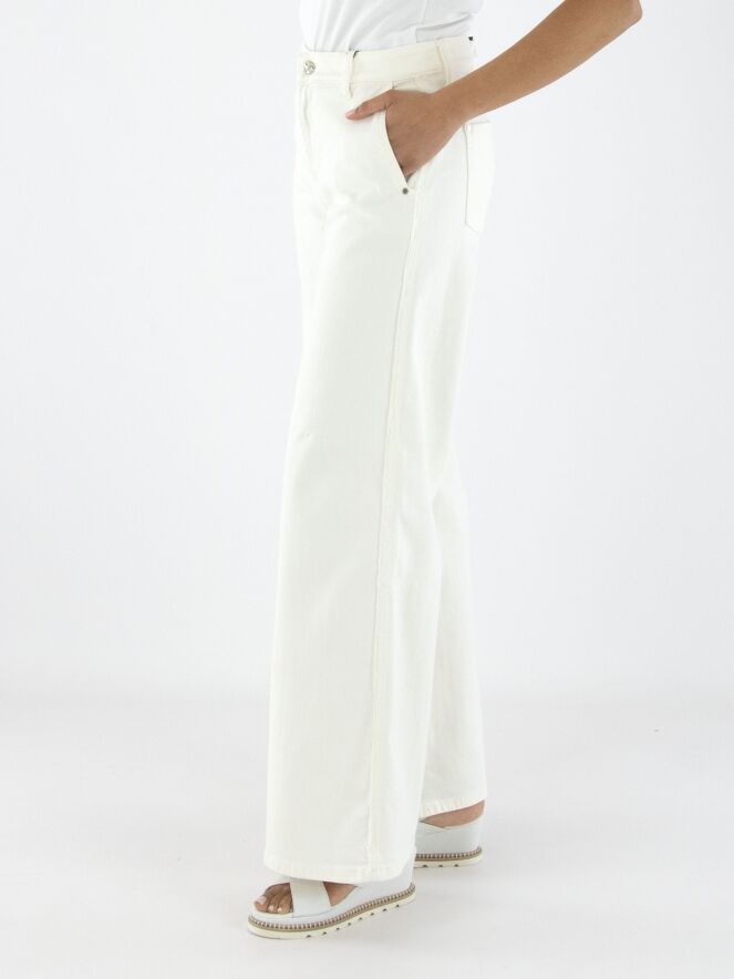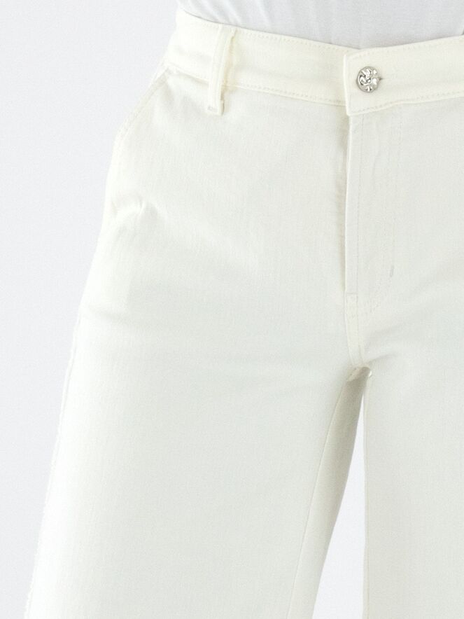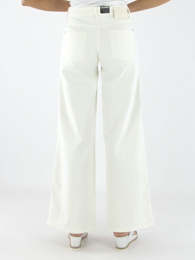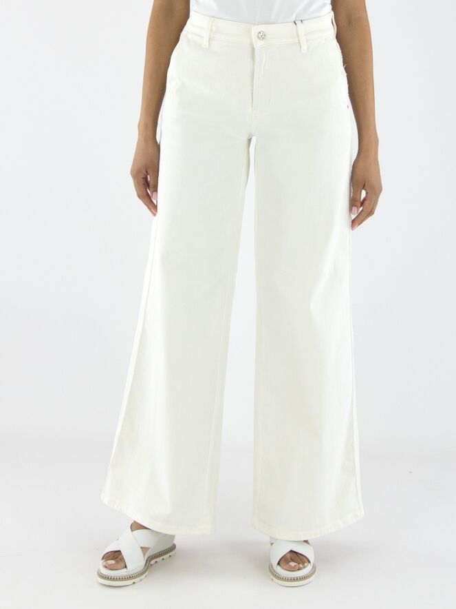 Een jeans met wijde pijpen van Cambio in een roomwitte kleur. De jeans heeft steekzakken en langs de rand van de stiknaad aan de zijkant is de stof fijn gerafeld. Deze jeans kan op 30 graden worden gewassen.