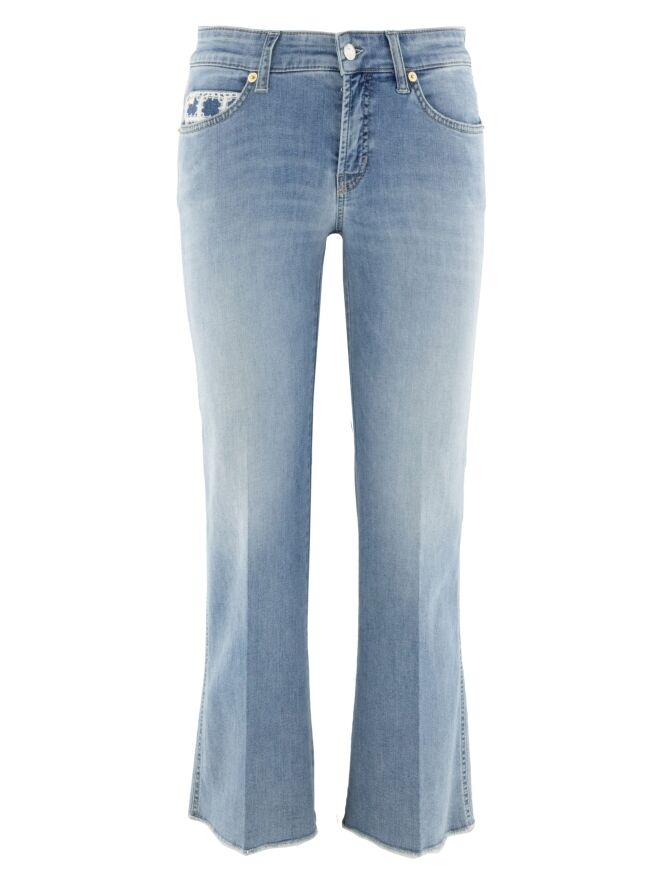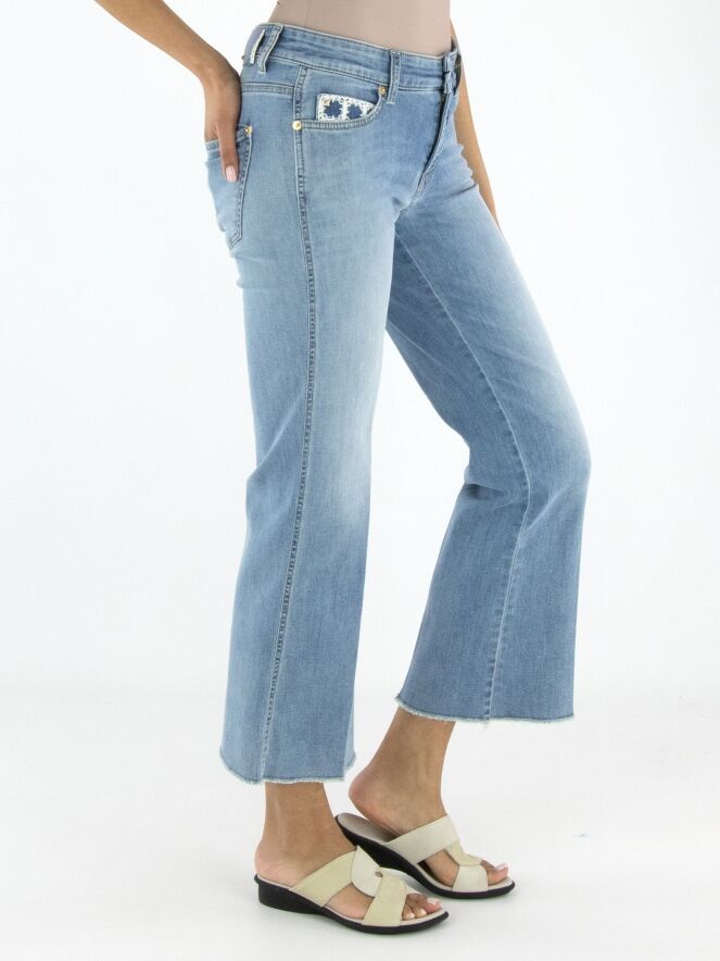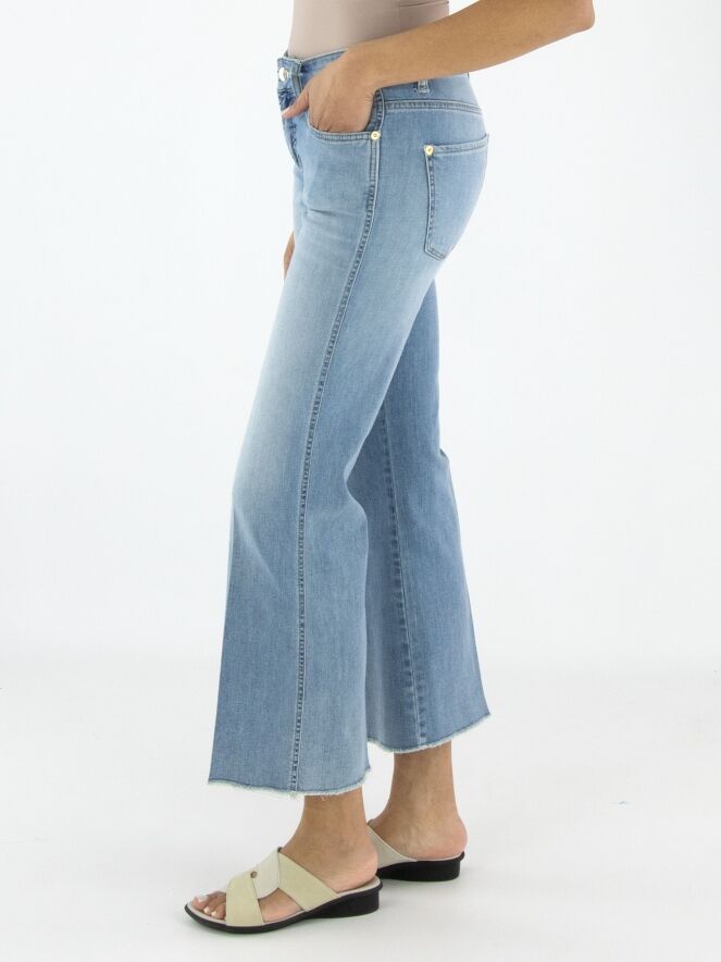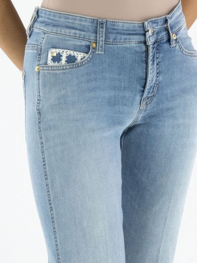 Een gewassen jeans van Cambio in een lichte jeanskleur. De broek heeft een 5-pocketmodel en de vijfde zak is voorzien van een decoratief wit gestikt blokpatroon. De rand aan de onderkant van de pijpen is subtiel gerafeld. Deze jeans mag op 30 graden worden gewassen.