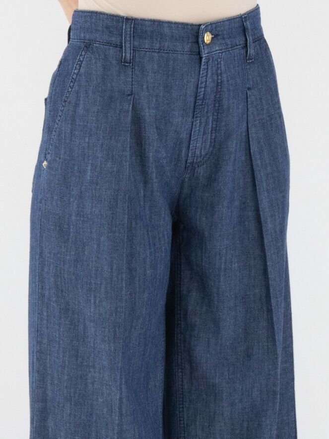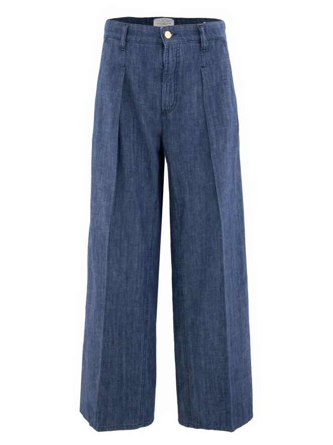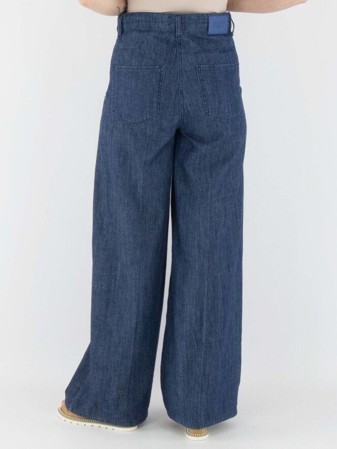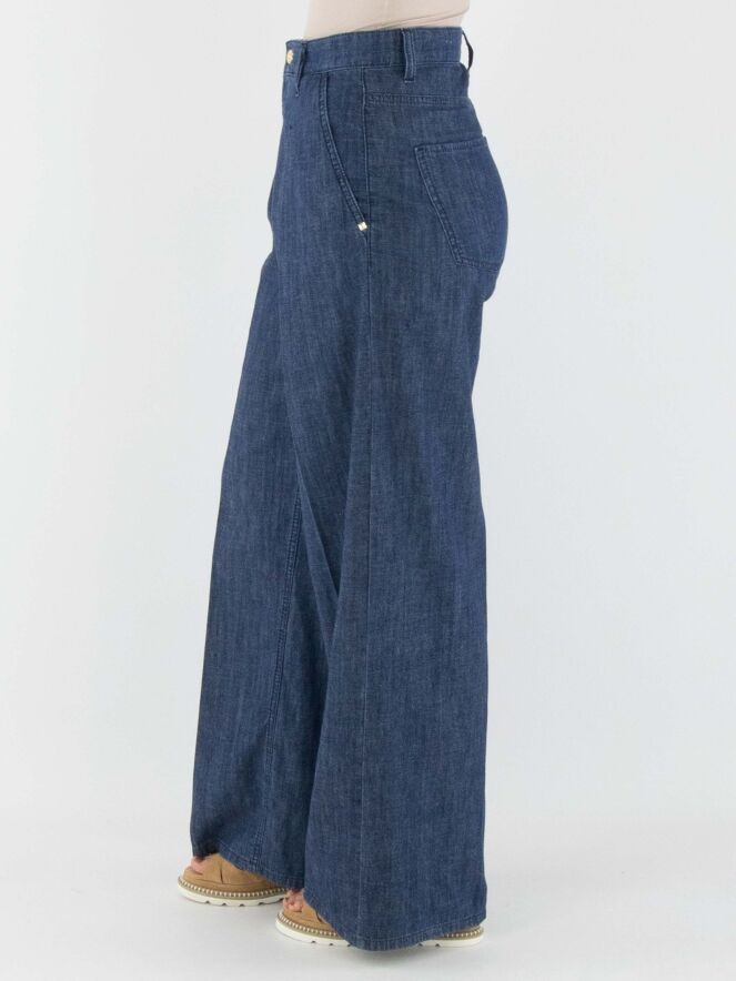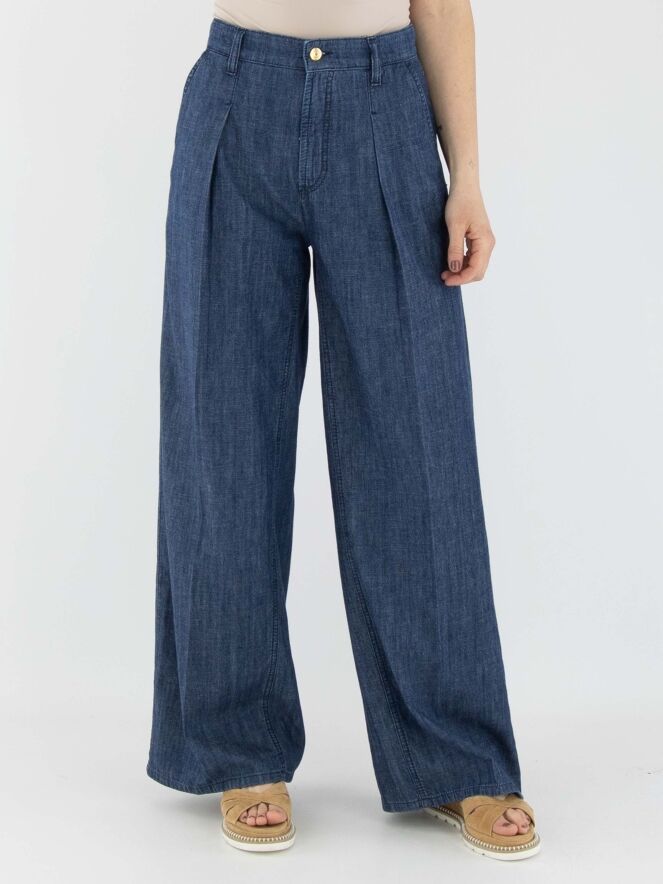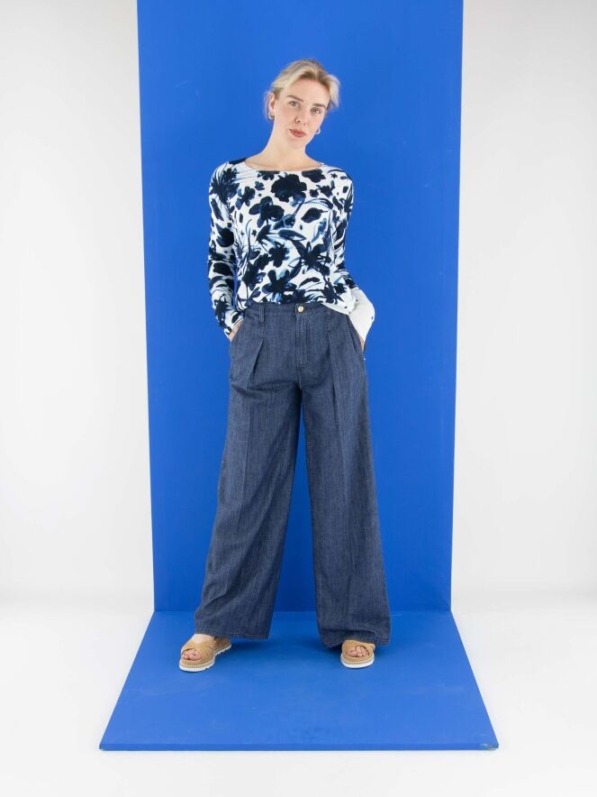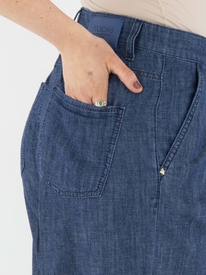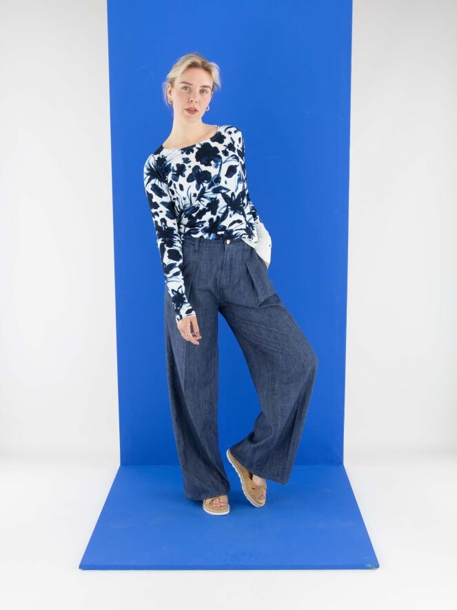 Een wijde, gemêleerde broek met een jeanslook in een jeanskleur. De broek heeft steekzakken en een ingestreken plooi in het midden van de pijpen. Deze broek mag op 30 graden worden gewassen.