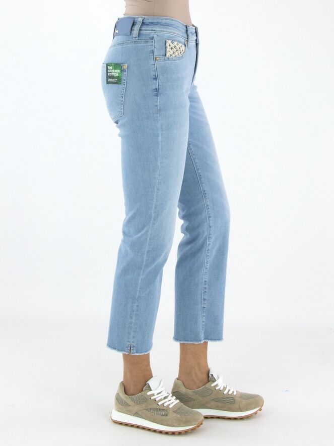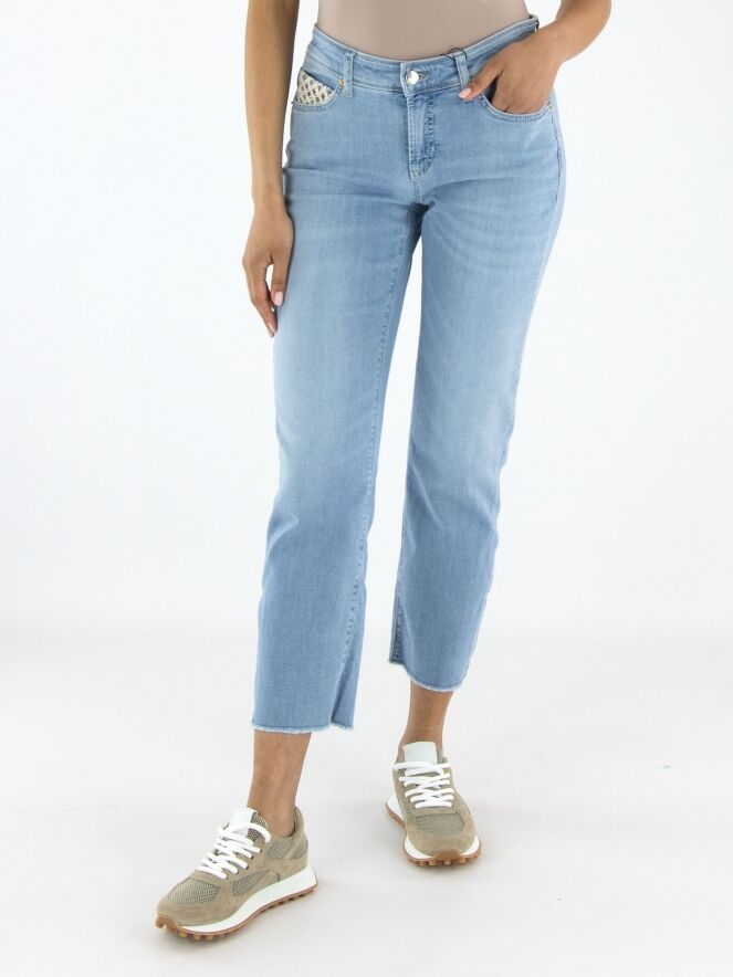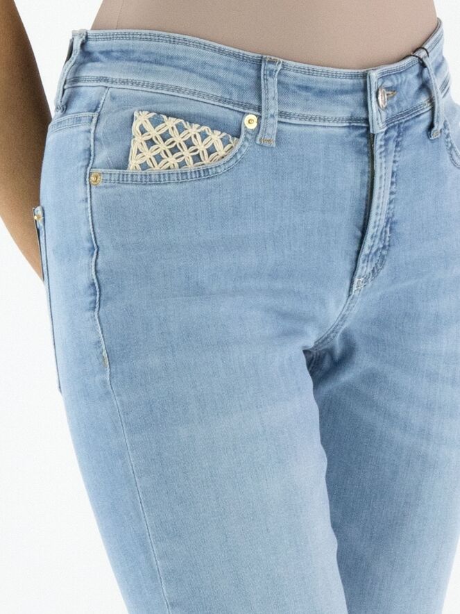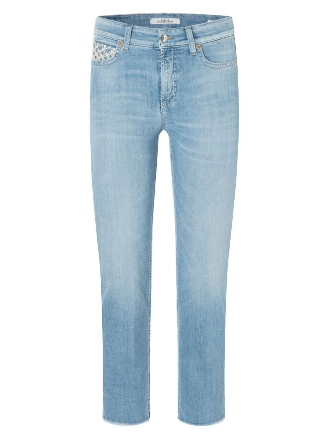 Een jeans van Cambio in een lichte jeanskleur. De jeans is uitgevoerd in een 5-pocketmodel, waarbij de vijfde pocket is gedecoreerd met een gekruist koord in de vorm van bloemetjes. Aan de onderkant van de pijpen bevindt zich een kort splitje en de rand is fijn gerafeld. Deze jeans kan op 30 graden worden gewassen.