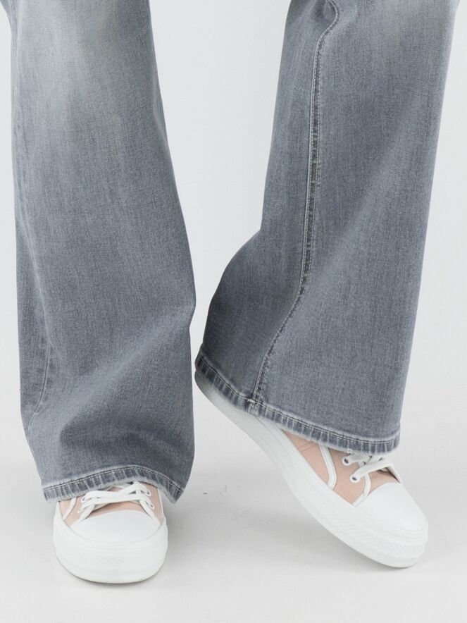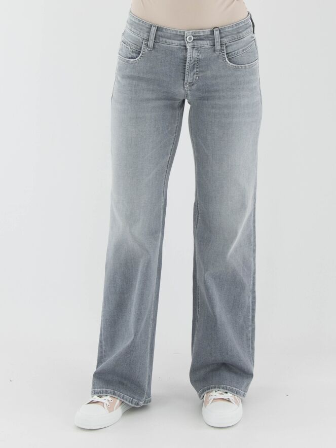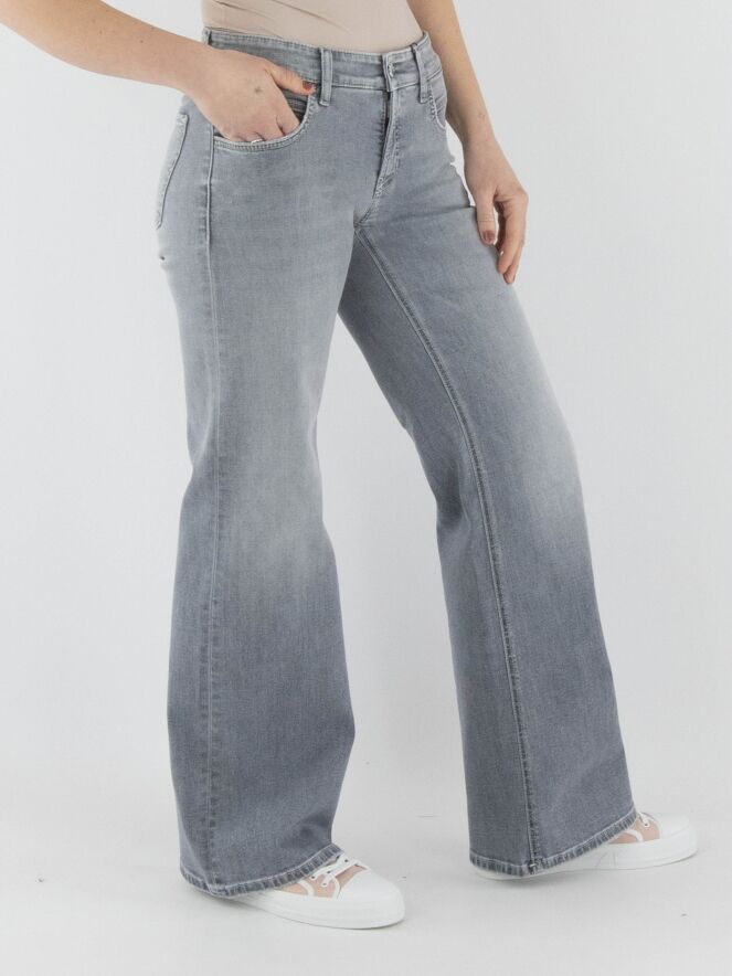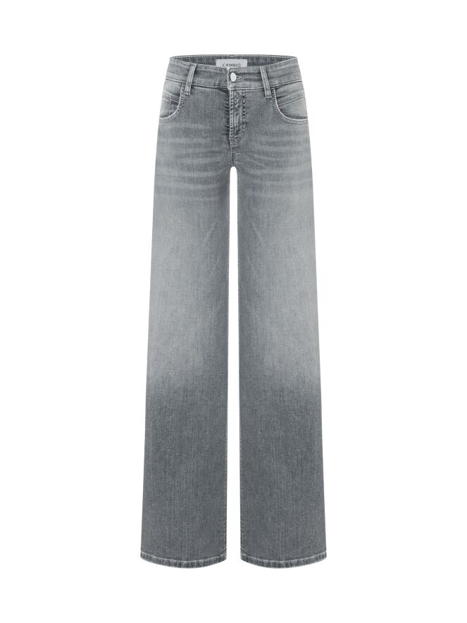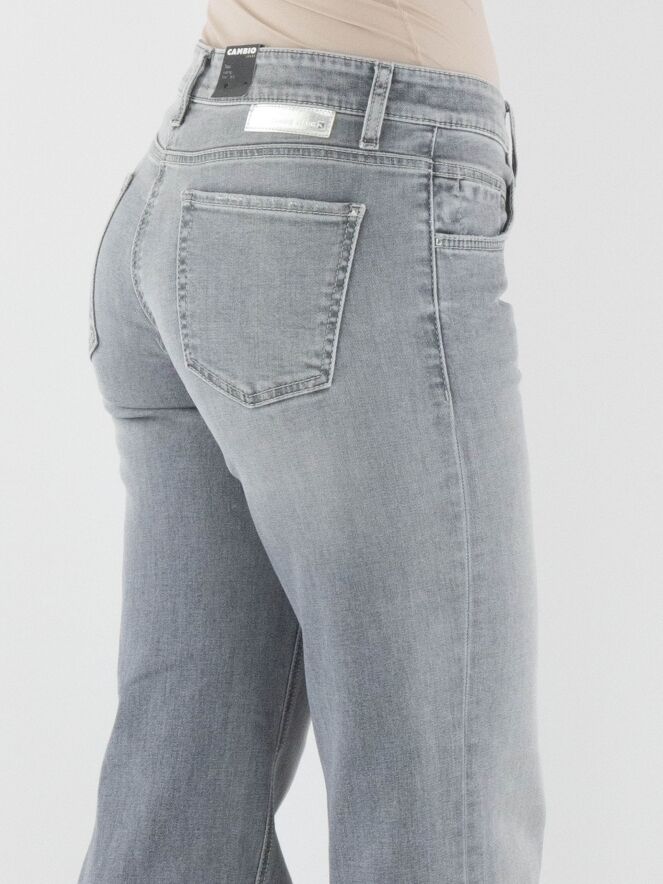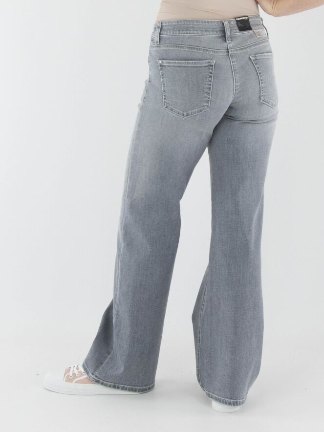 Een wijde jeans van Cambio in een lichtgrijze gewassen kleur. De jeans heeft een 5-pocketmodel. Deze jeans kan op 30 graden worden gewassen.