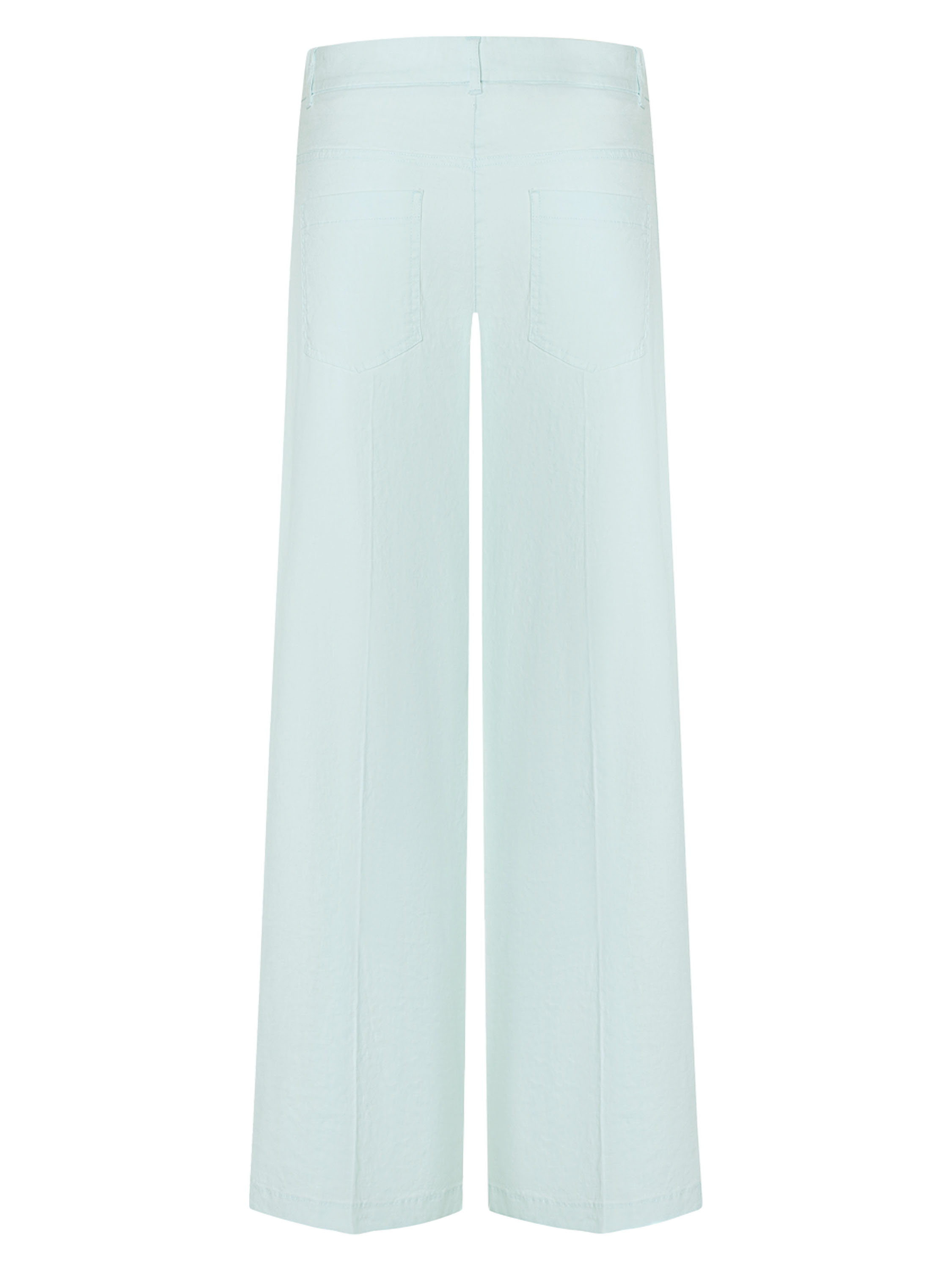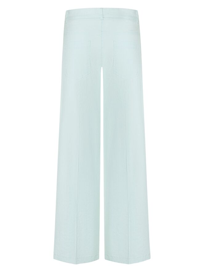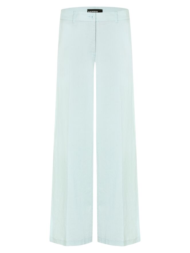 Een linnen broek van Cambio in een pastel lichtblauwe kleur. De broek heeft steekzakken en in het midden van de pijpen een ingestreken plooi. Deze broek mag op de hand worden gewassen.