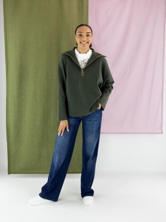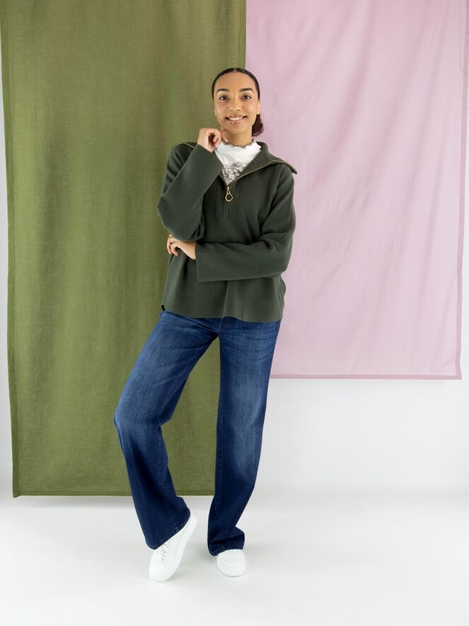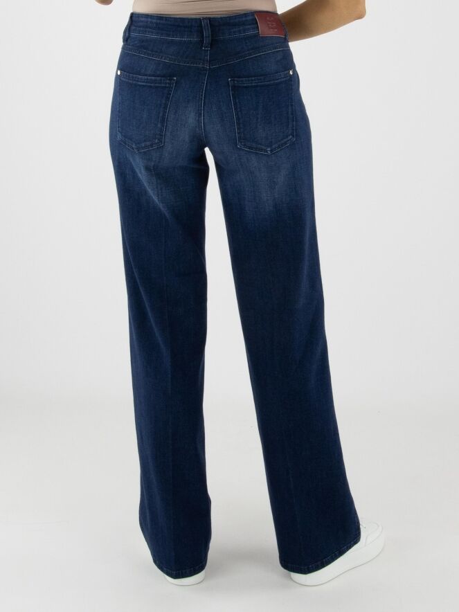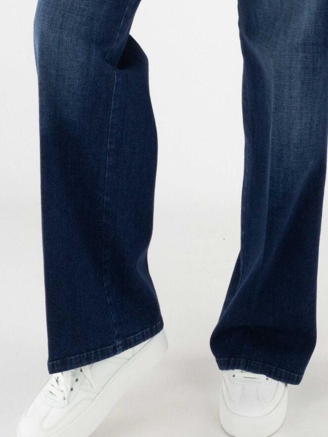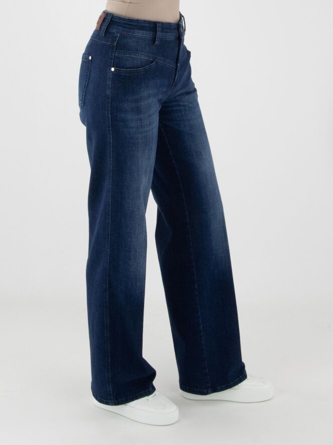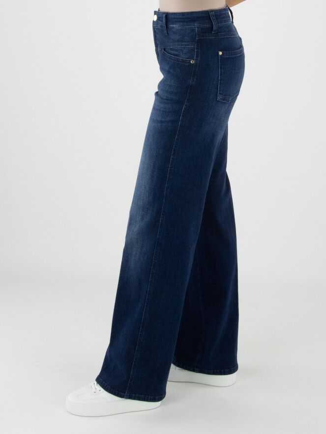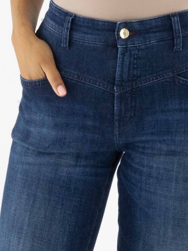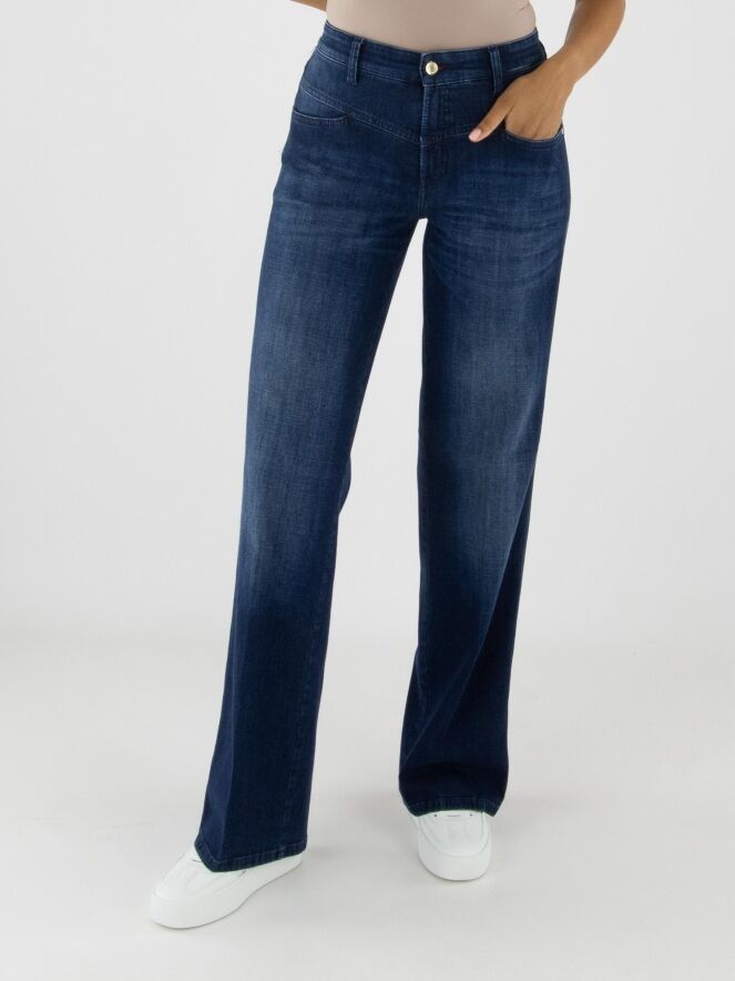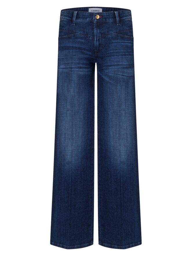 Een wijde, gewassen jeans van Cambio in een basic jeanskleur. De jeans heeft iets verlaagde zakken met een licht diagonale rand. In het midden van de pijpen is een ingestreken plooi. Deze jeans mag op 30 graden worden gewassen.