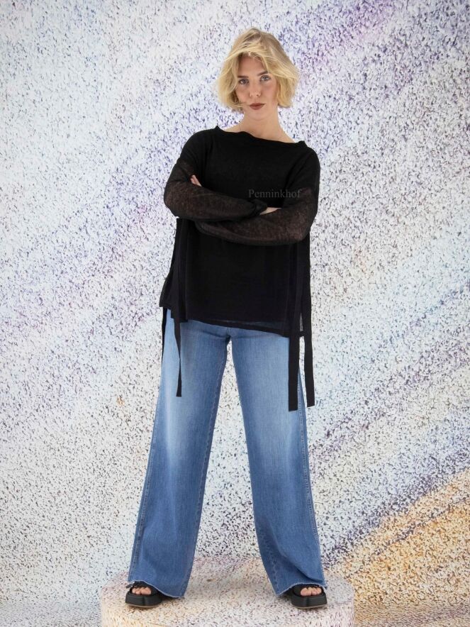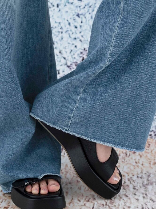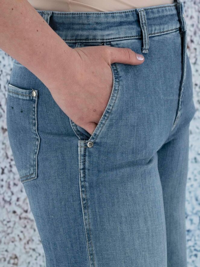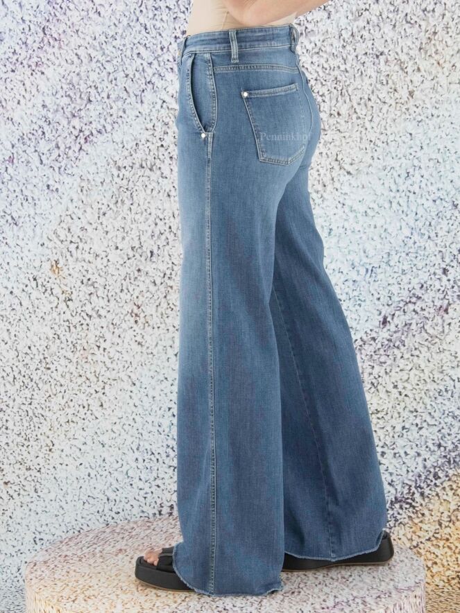 Een gewassen flared jeans van Cambio in een lichte jeansblauwe kleur. De onderkant van de wijde pijpen zijn fijn gerafeld. De jeans heeft steekzakken en mag op 30 graden worden gewassen.