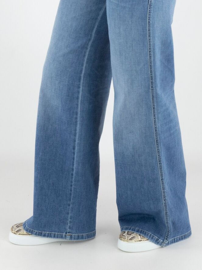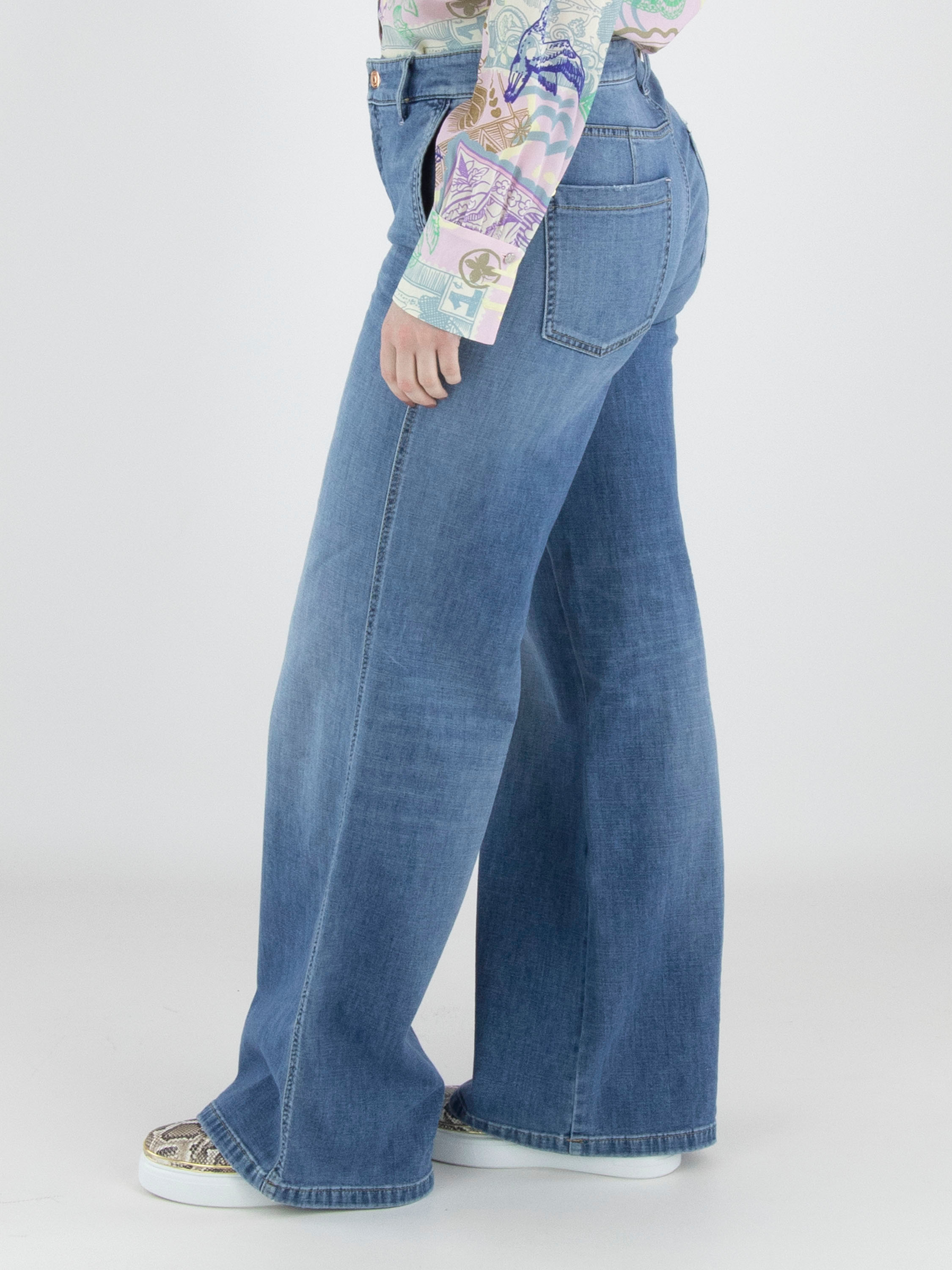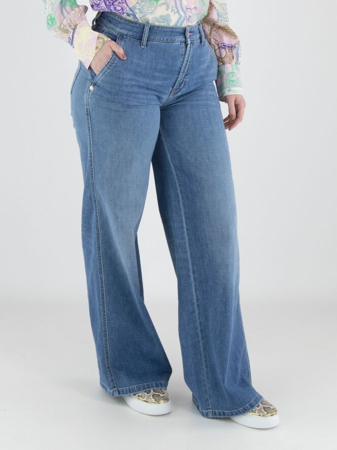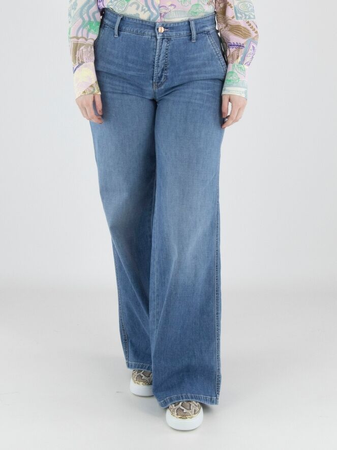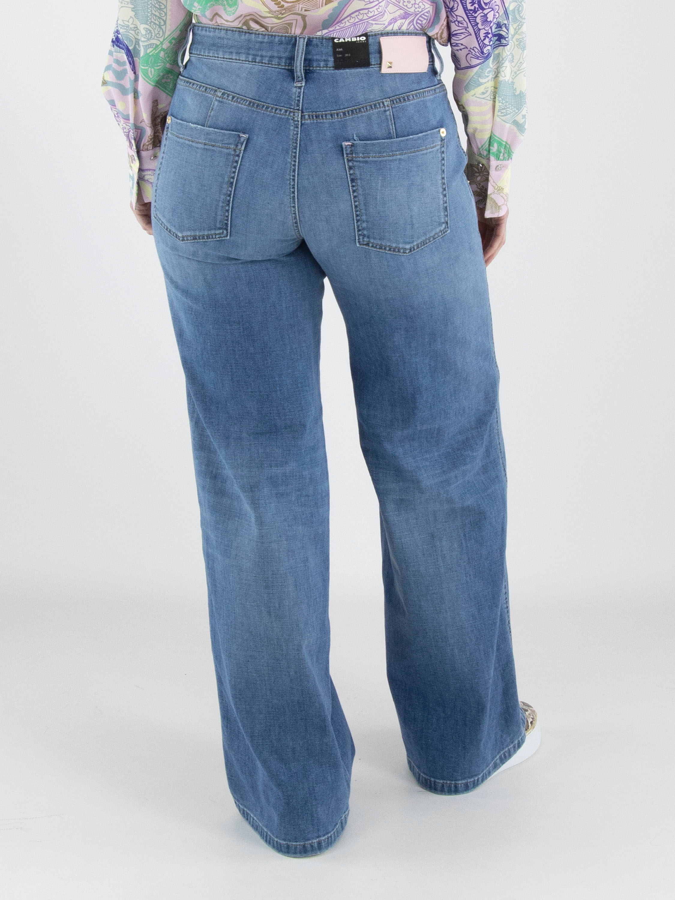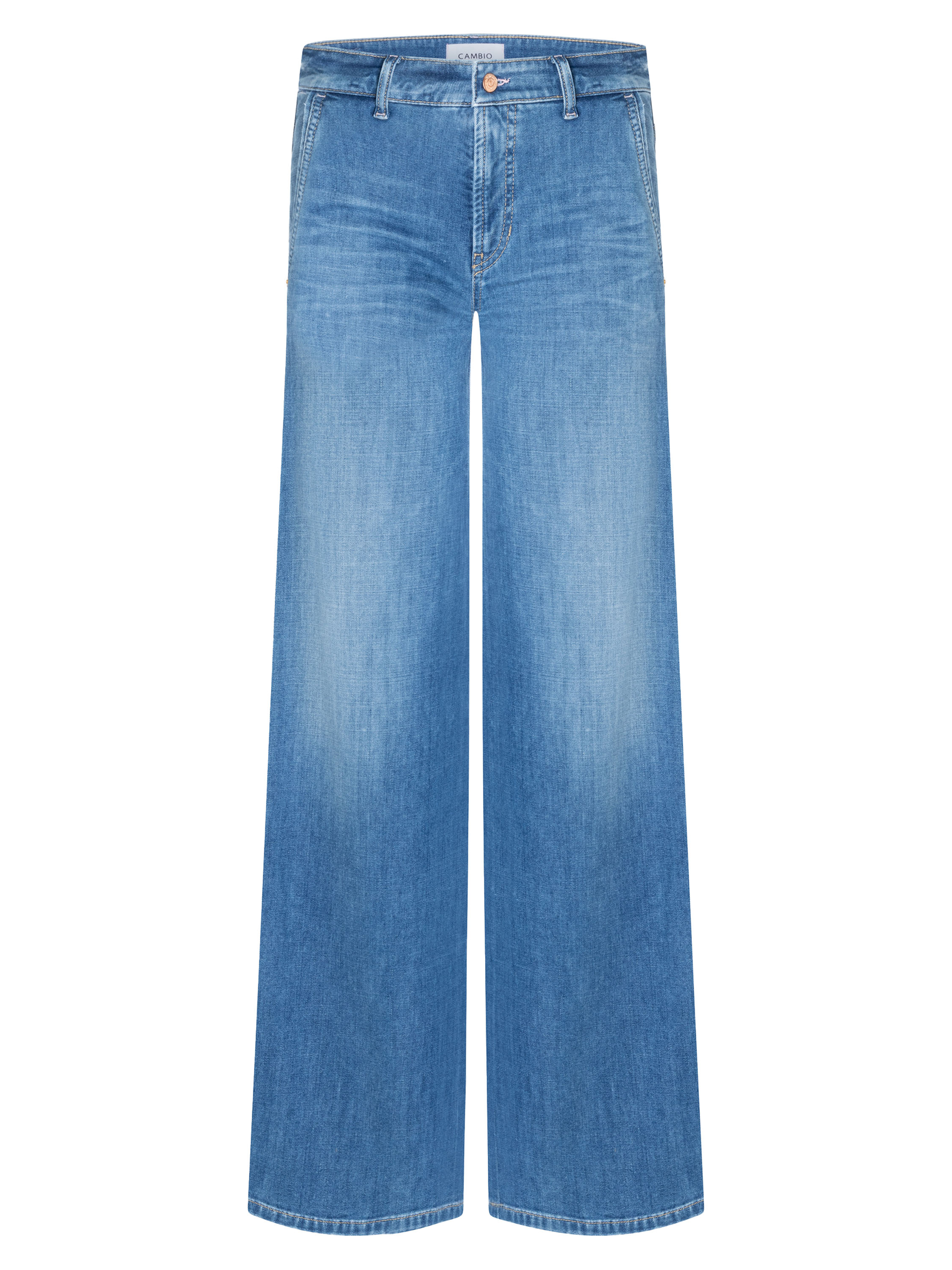 Een wijde jeans van Cambio in een lichte jeanskleur. De jeans heeft steekzakken en wijd gesneden pijpen. Deze jeans kan op 30 graden worden gewassen.