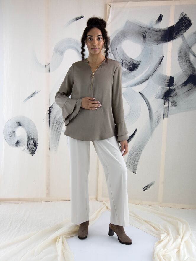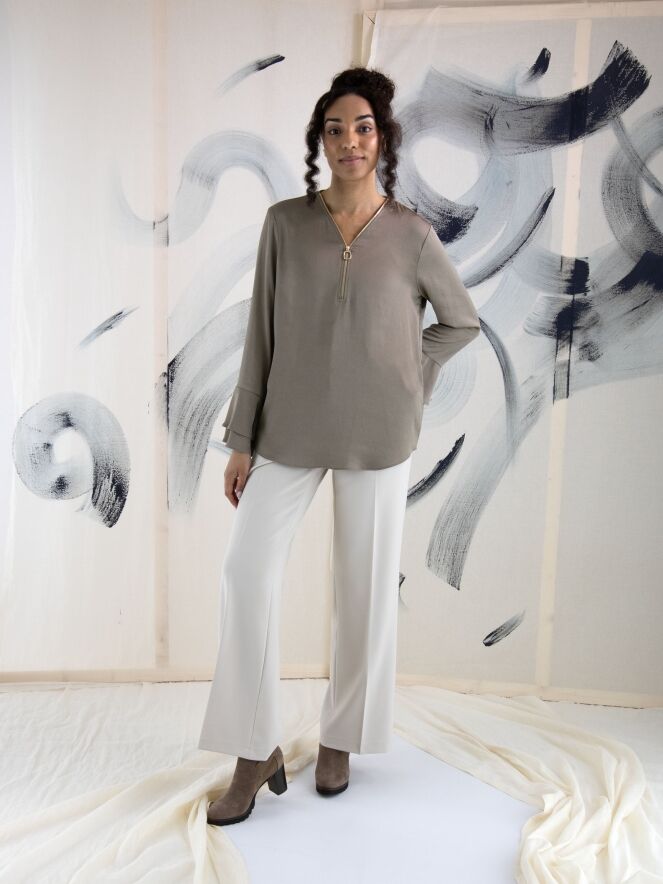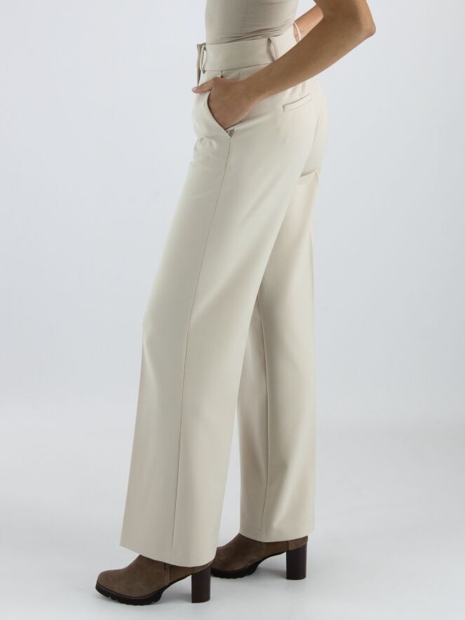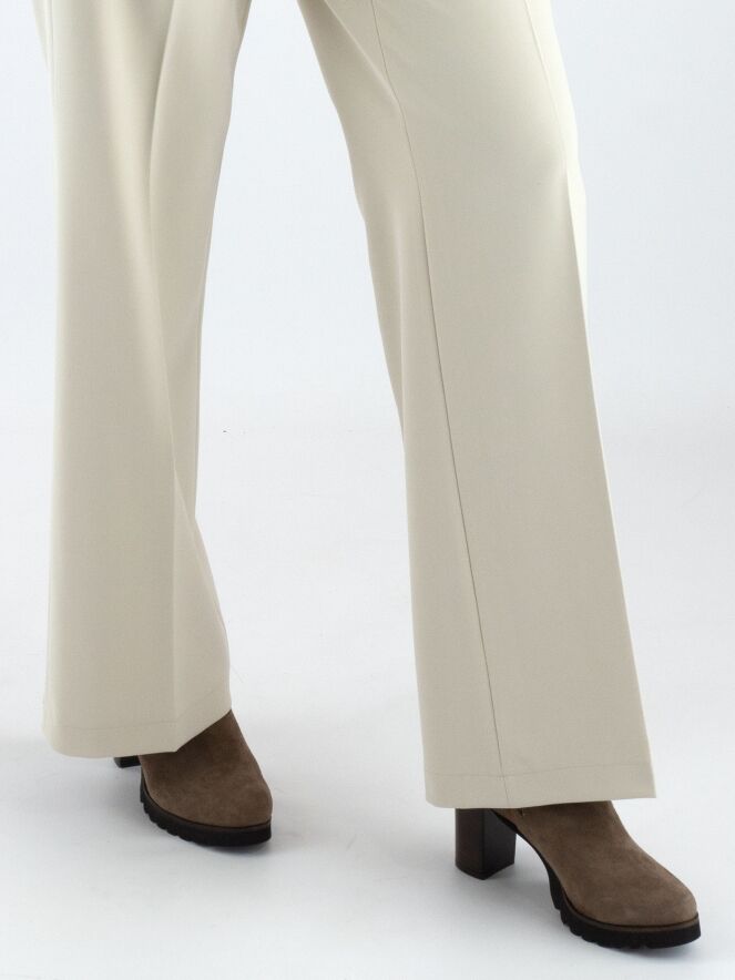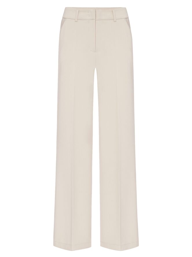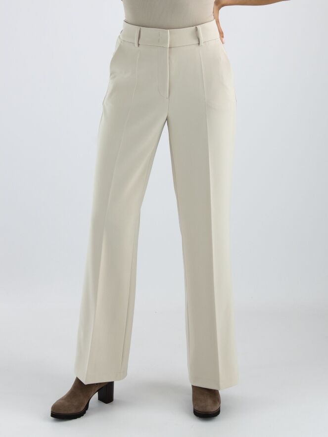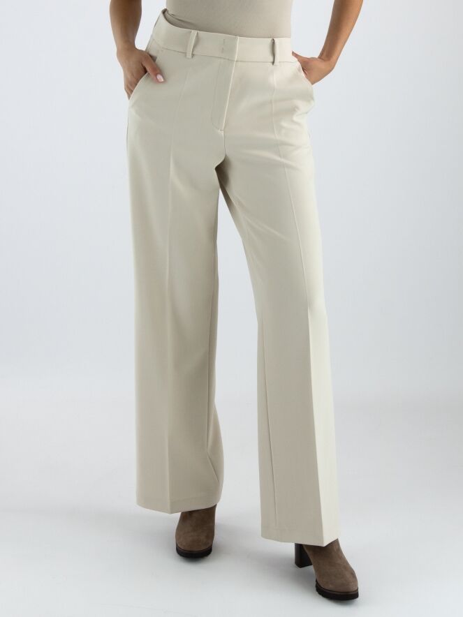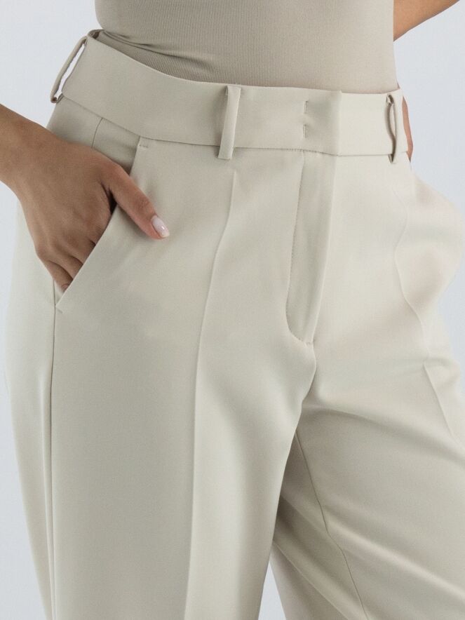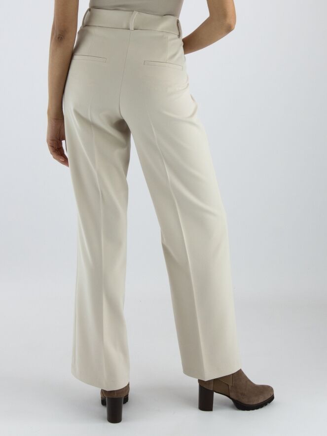 Een luxe rechtgesneden broek van Cambio in een zandkleur. In het midden van de pijpen is een ingestreken plooi. De broek heeft steekzakken en mag met de hand worden gewassen.