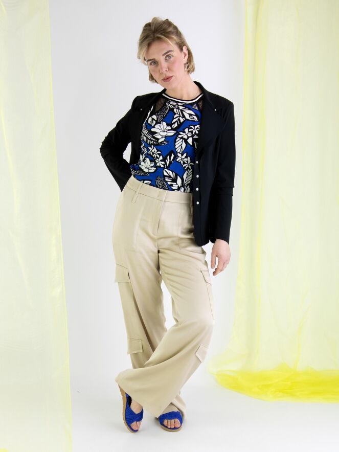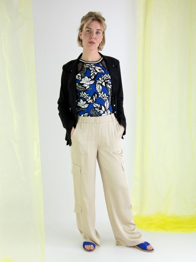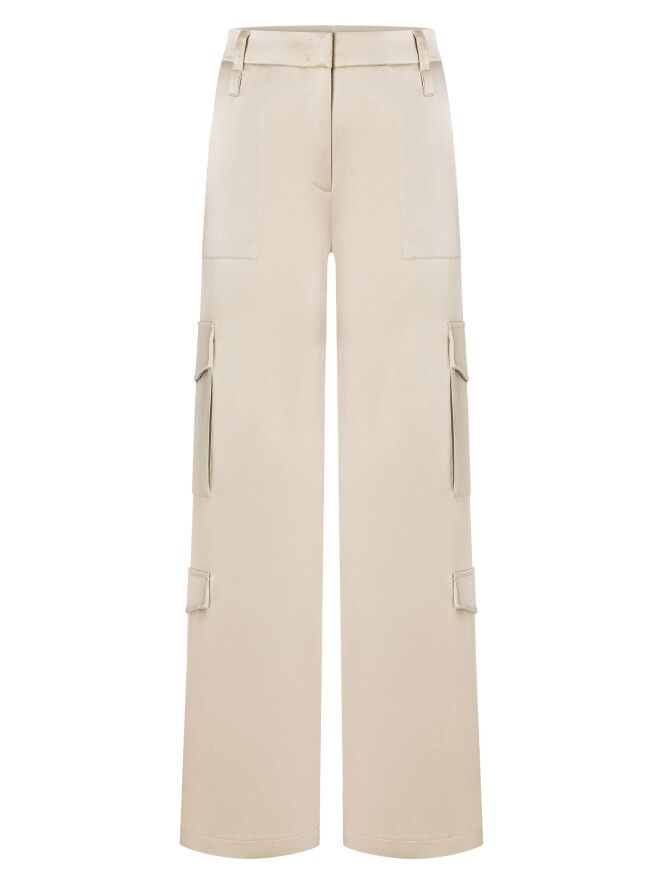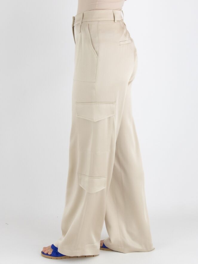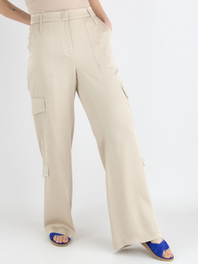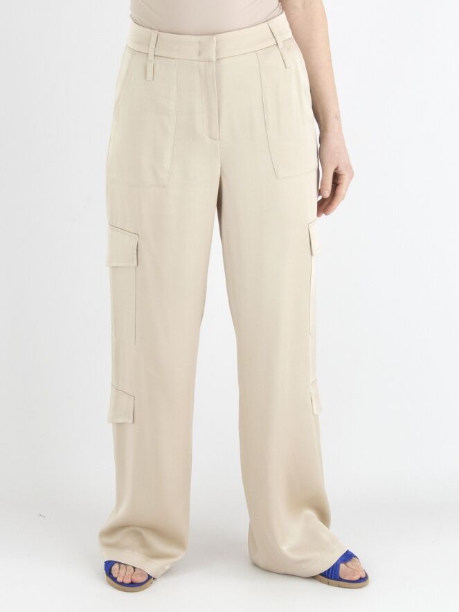 Een wijde mat satijnen cargo broek van Cambio in de kleur beige. De broek heeft op zowel het boven als ook het onderbeen zak omslagen. Onder de taille zijn steekzakken en deze broek mag op de hand worden gewassen.