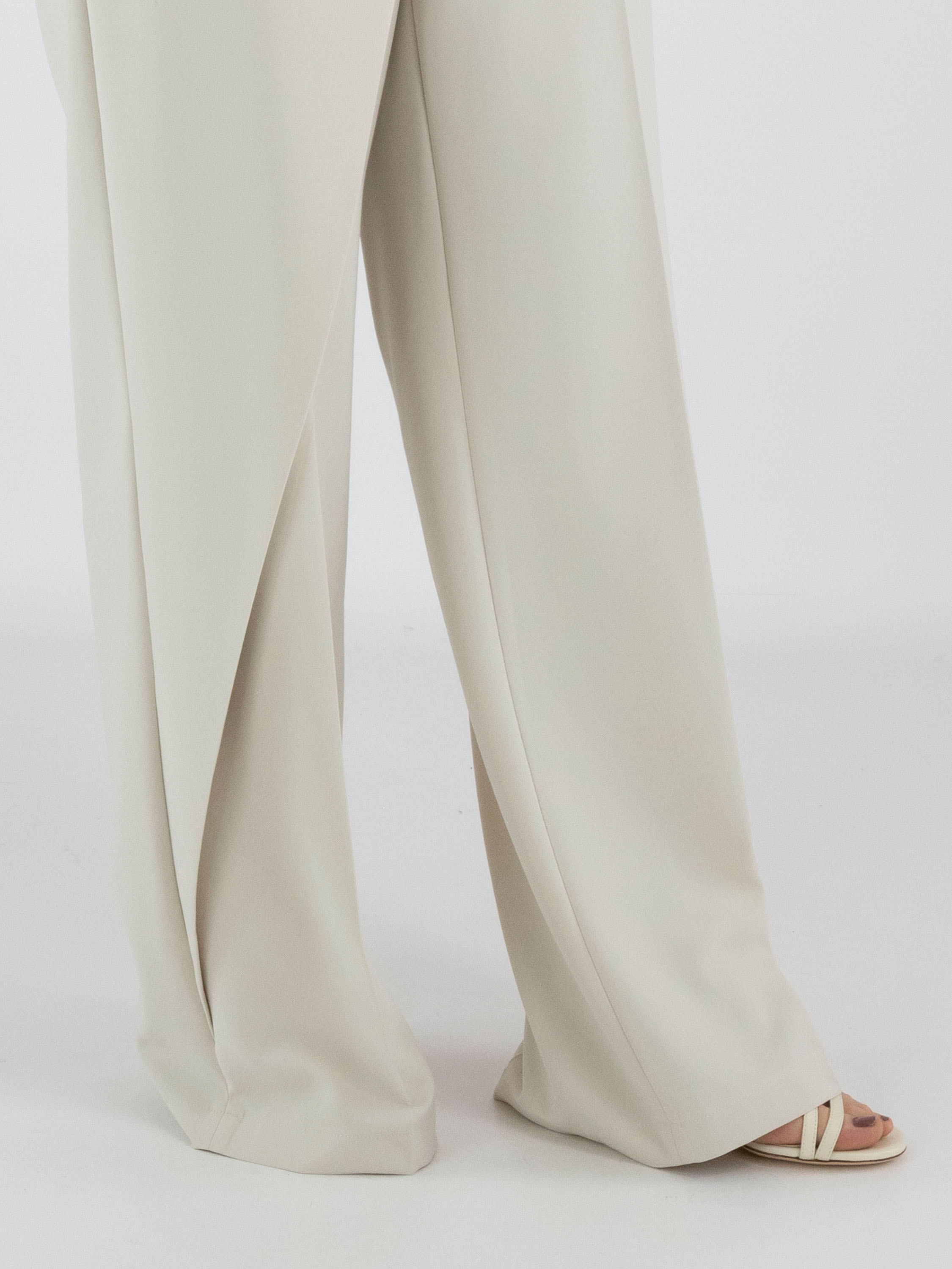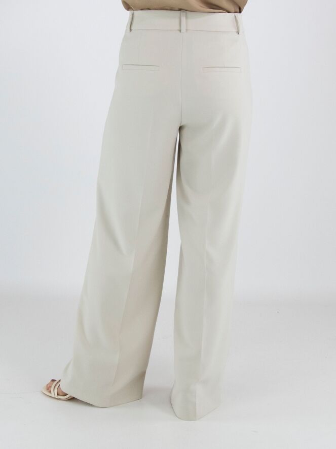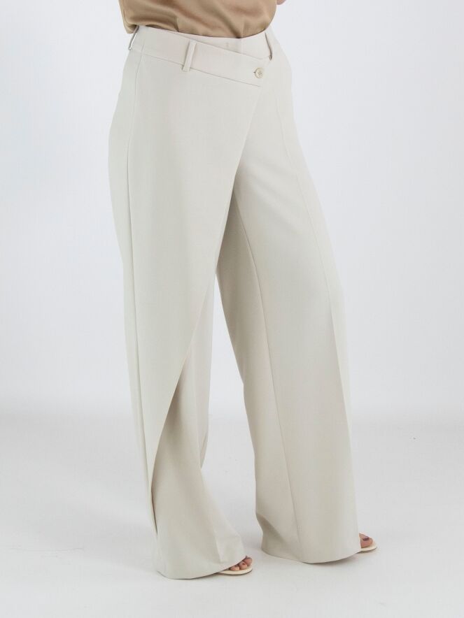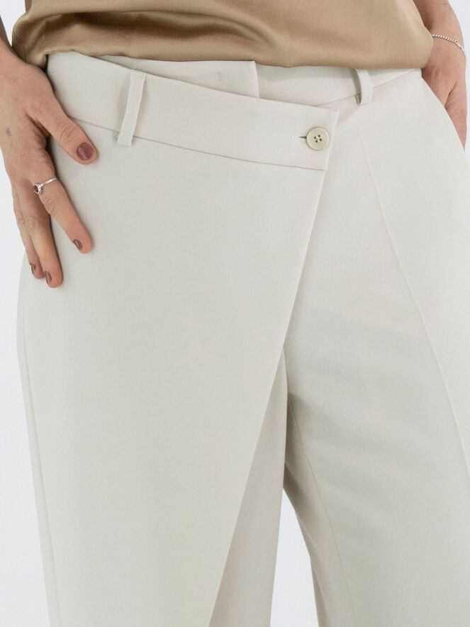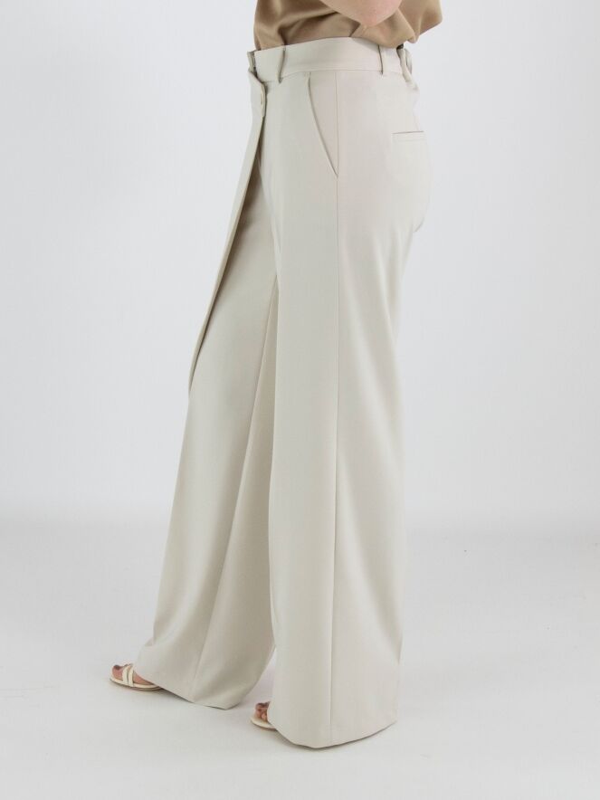 Een broek van Cambio in de kleur beige. Aan de rechterkant bevindt zich een overslag vanuit de zijnaad die in de taille is vastgezet. In het midden van de pijpen is een ingestreken plooi. De broek heeft steekzakken en mag met de hand worden gewassen.