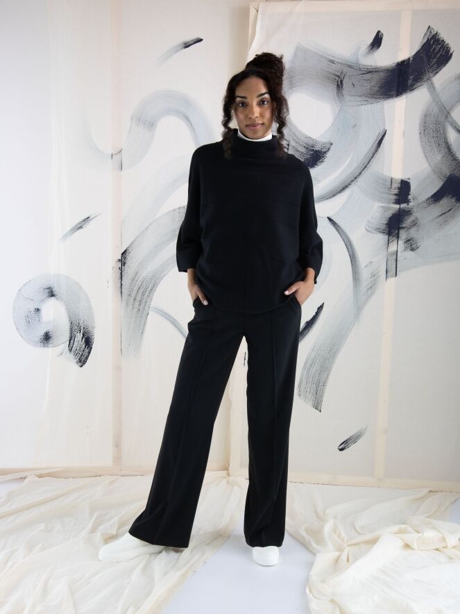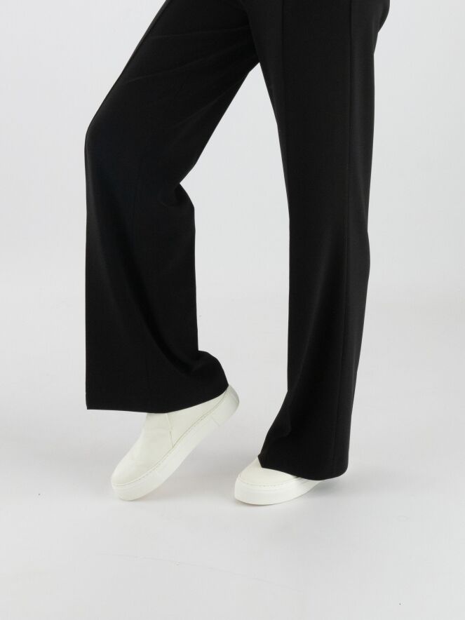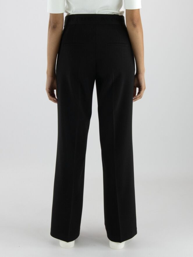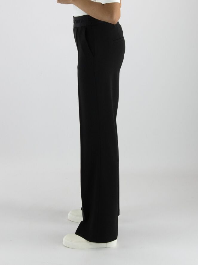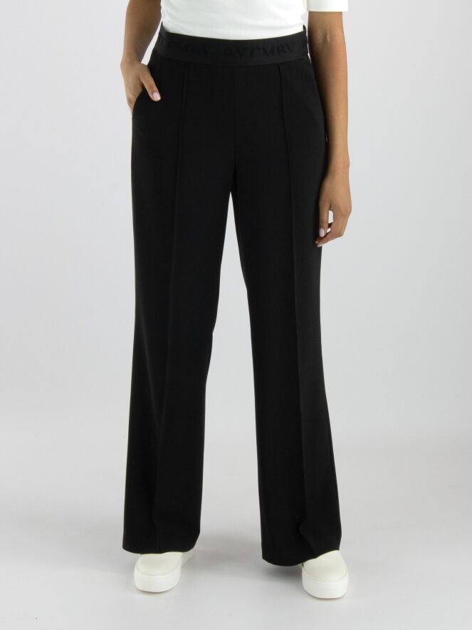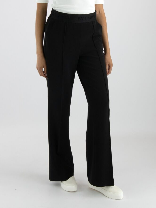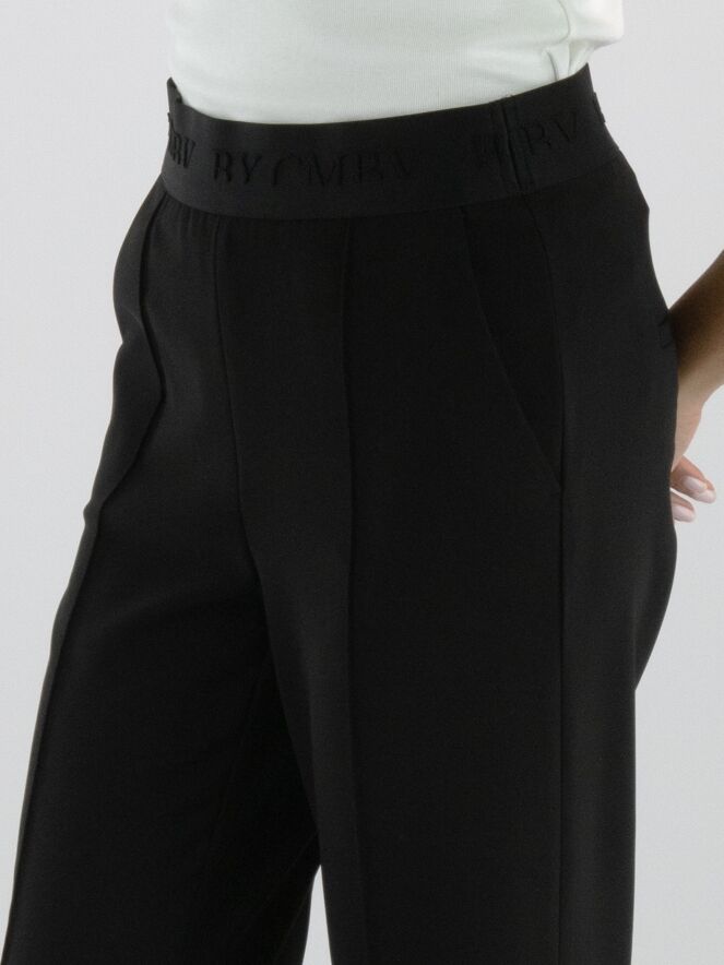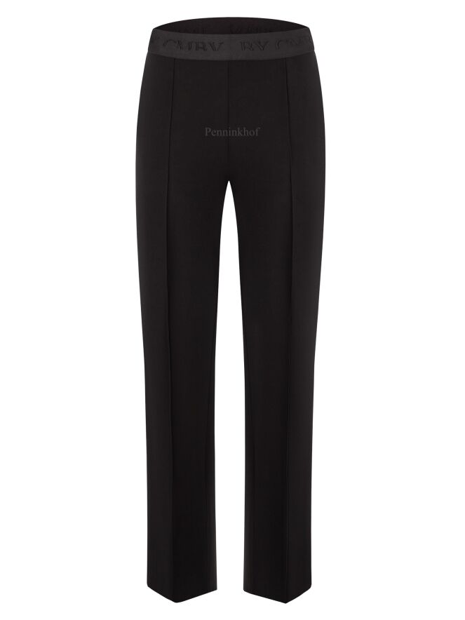Een broek van Cambio in de kleur zwart. In de taille is een elastieken band. De broek heeft een recht gesneden pijp en in het midden van de pijpen is een doorgestikte naad. De broek heeft steekzakken en mag op 30 graden worden gewassen.