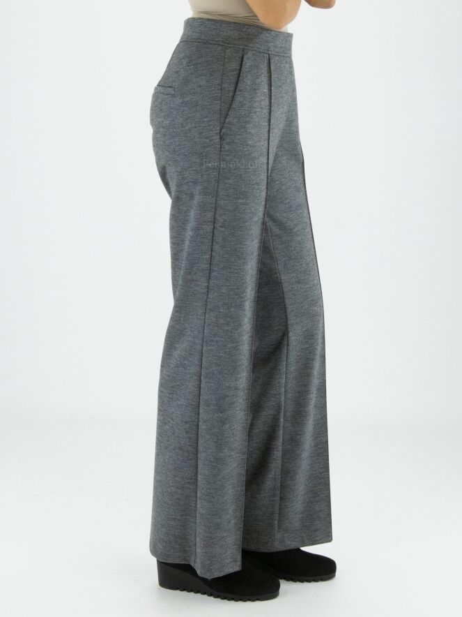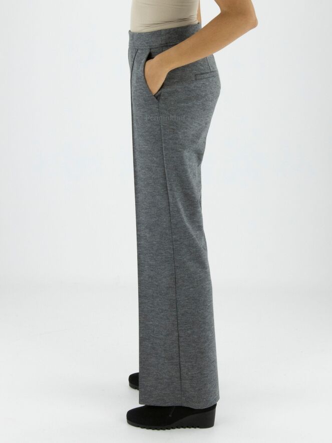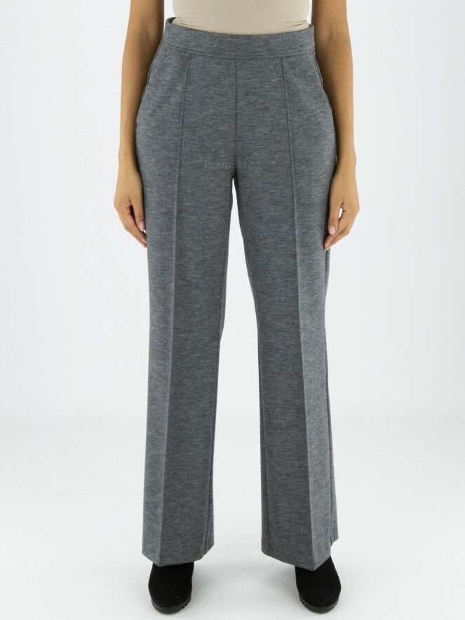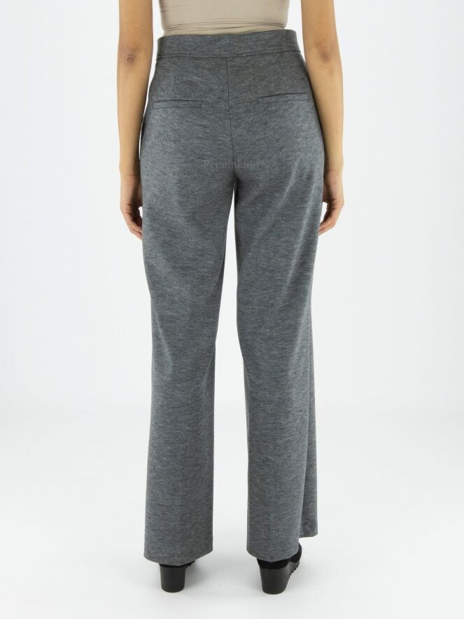 Een broek van Cambio in een gemêleerde grijze kleur. In het midden van de pijpen is een omgekeerde stiknaad. De broek heeft steekzakken en en mag op de hand worden gewassen.
