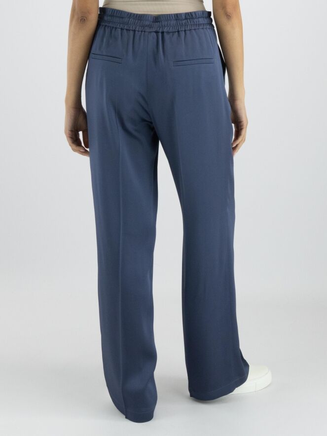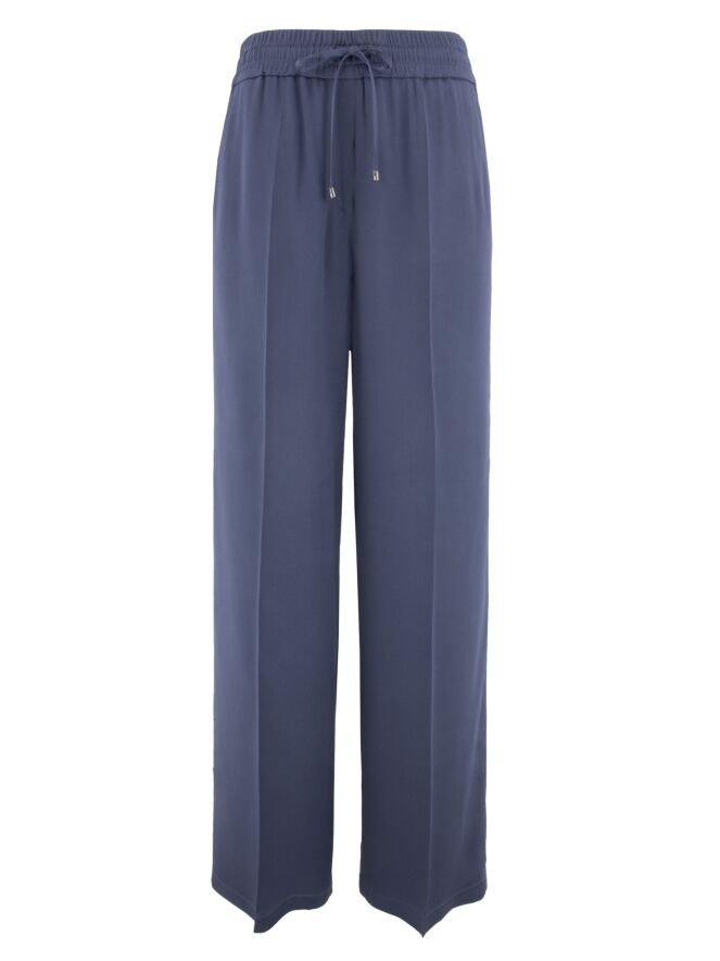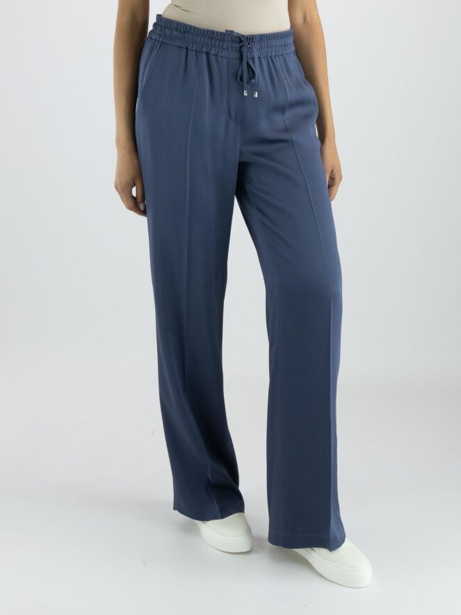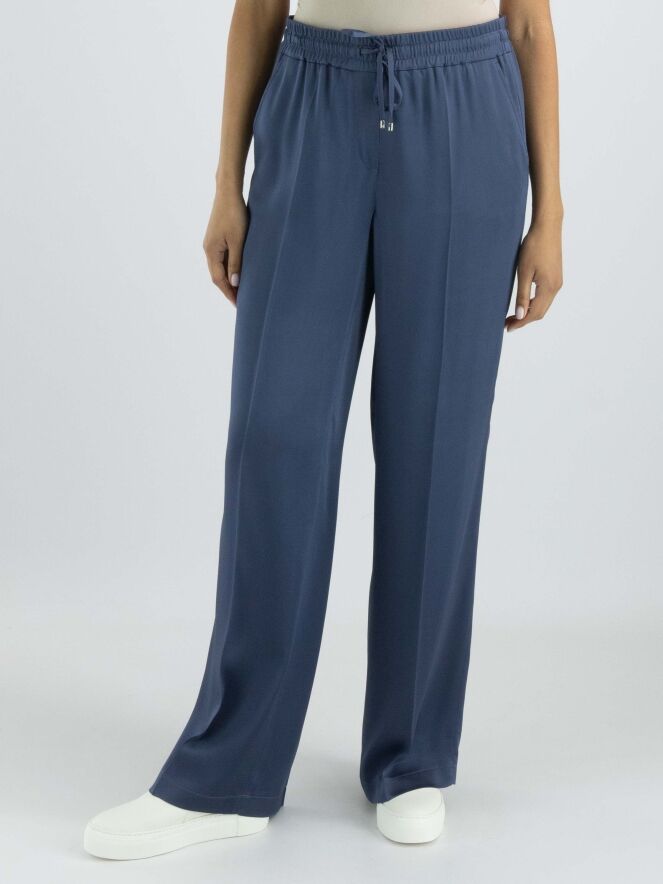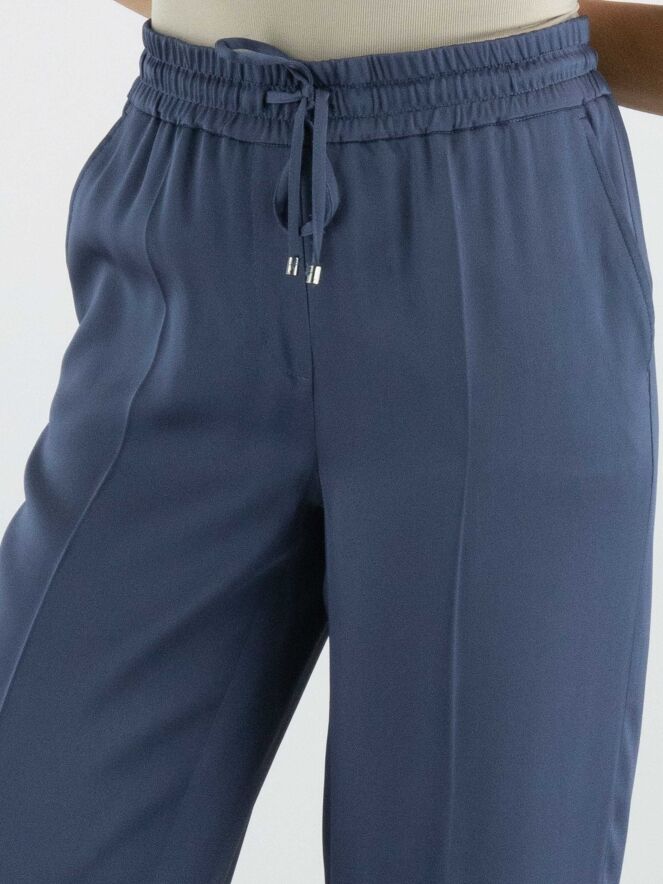 Een luxe mat satijnen broek van Cambio in de kleur petrolblauw. In de taille is een fijn geribbelde elastieken band met een lint in een tunnelverwerking. De broek heeft steekzakken en in het midden van de pijpen is een ingestreken plooi. Deze broek mag op de hand worden gewassen.