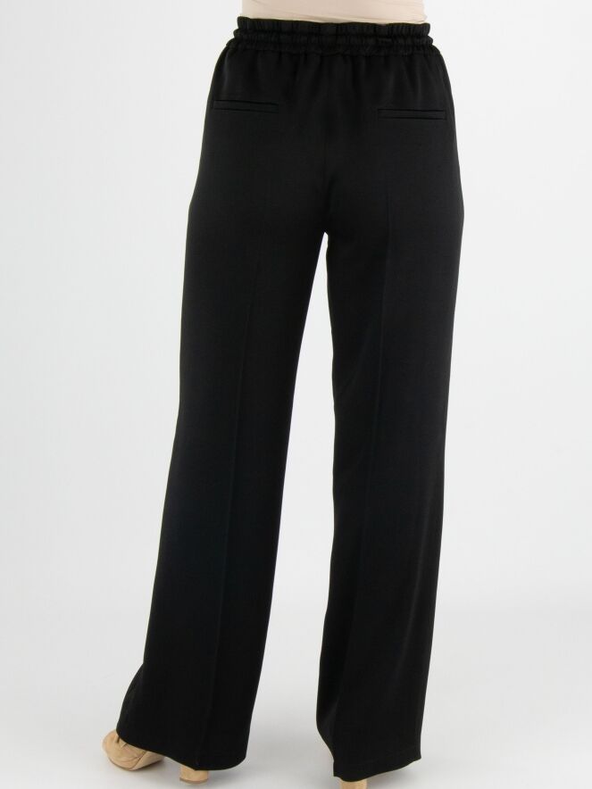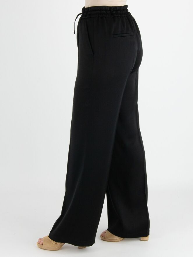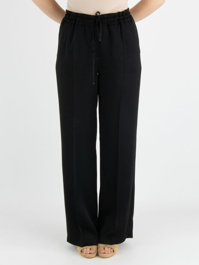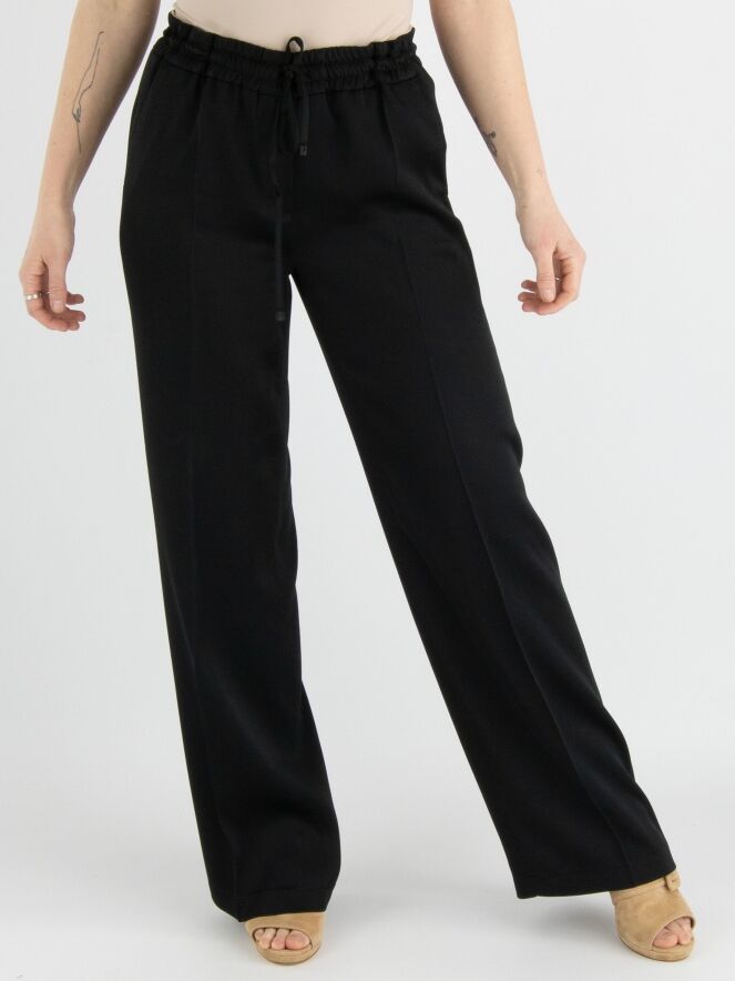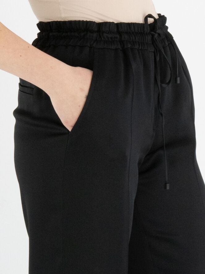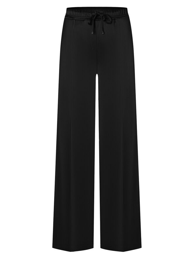 Een mat satijnen broek van Cambio in de kleur zwart. In de taille is een fijn geplooide elastieken band met een koord in een tunnel verwerking. In het midden van de pijpen is een ingestreken plooi. Deze broek mag op de hand worden gewassen.