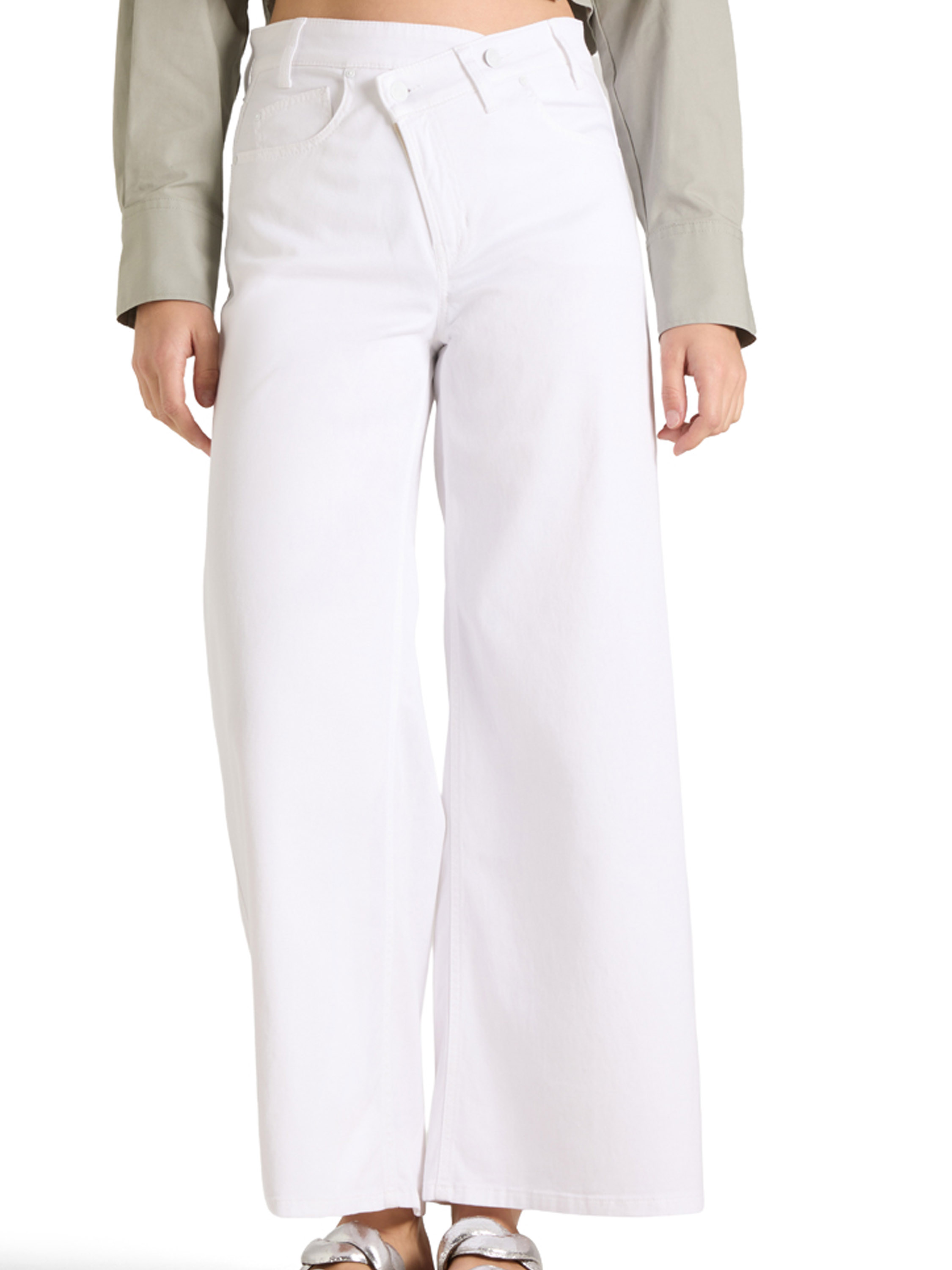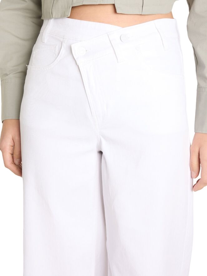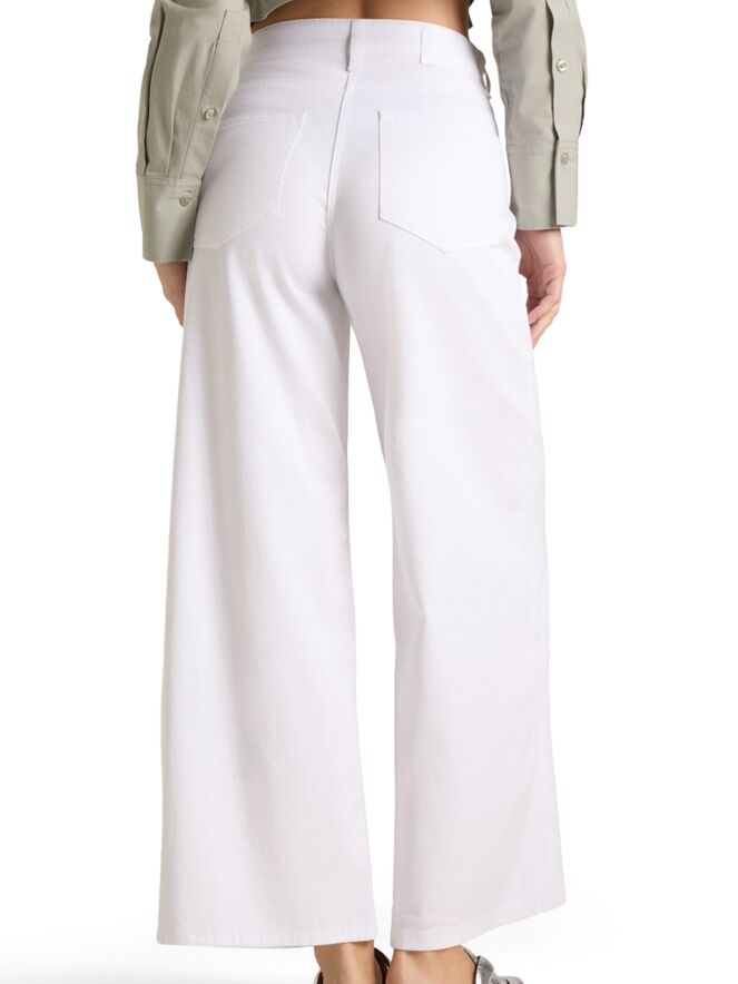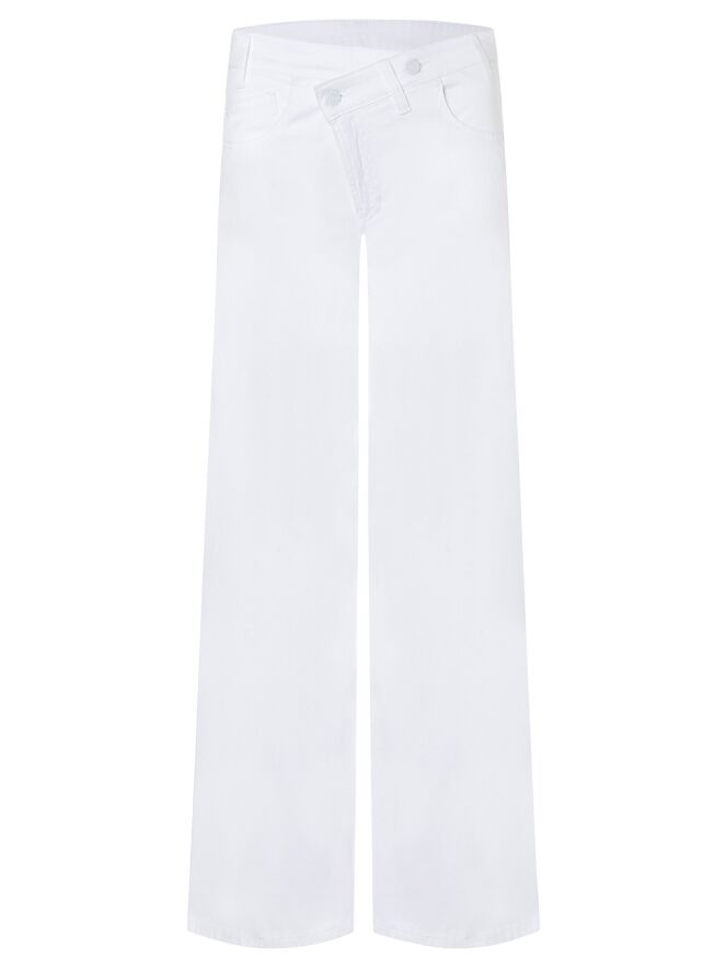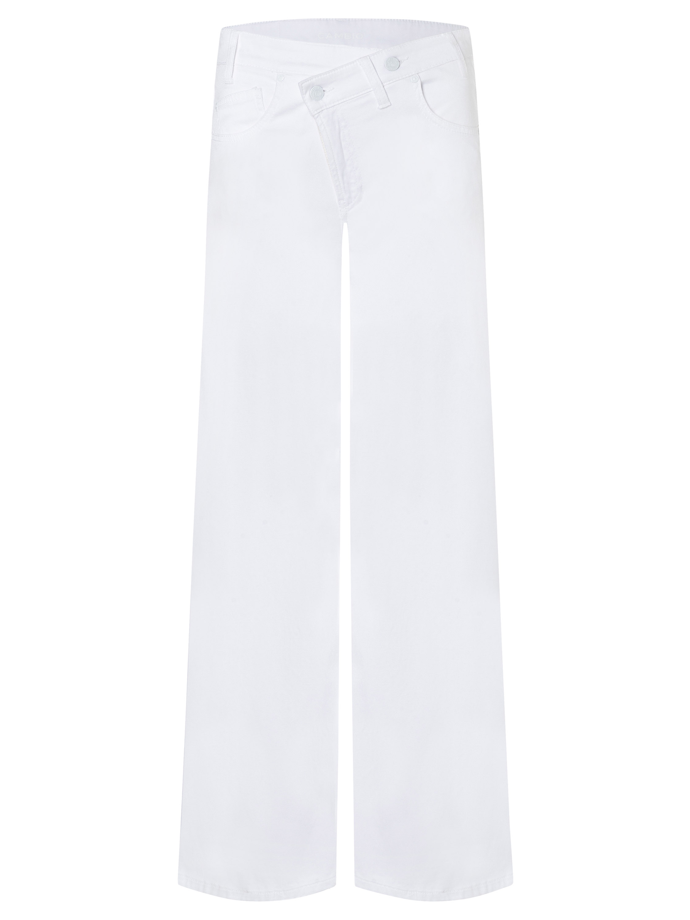 Een jeans van Cambio in de kleur wit. De jeans is uitgevoerd in een 5-pocketmodel met een asymmetrische diagonale sluiting. De pijpen zijn recht gesneden. Deze jeans kan op 30 graden worden gewassen.