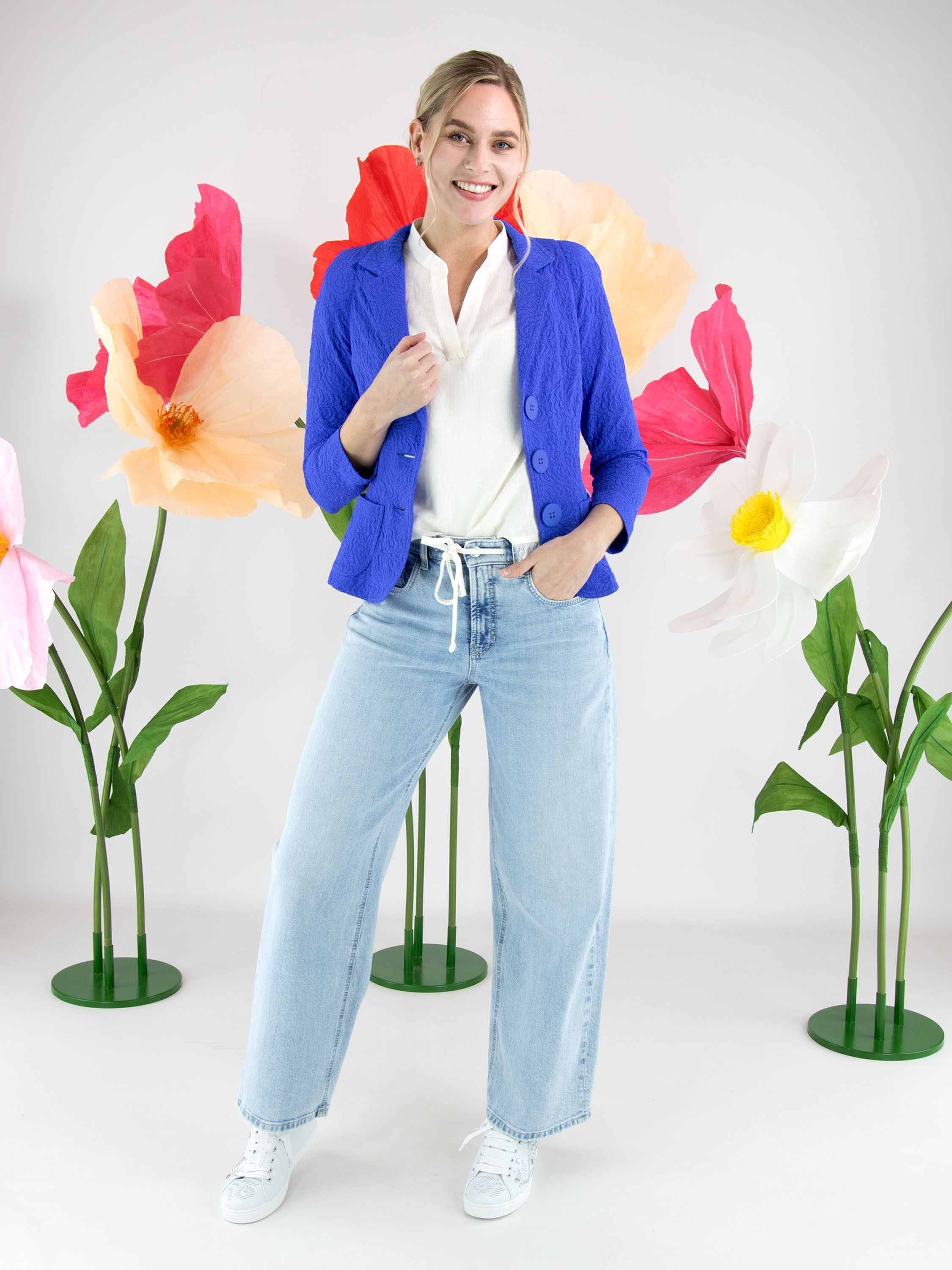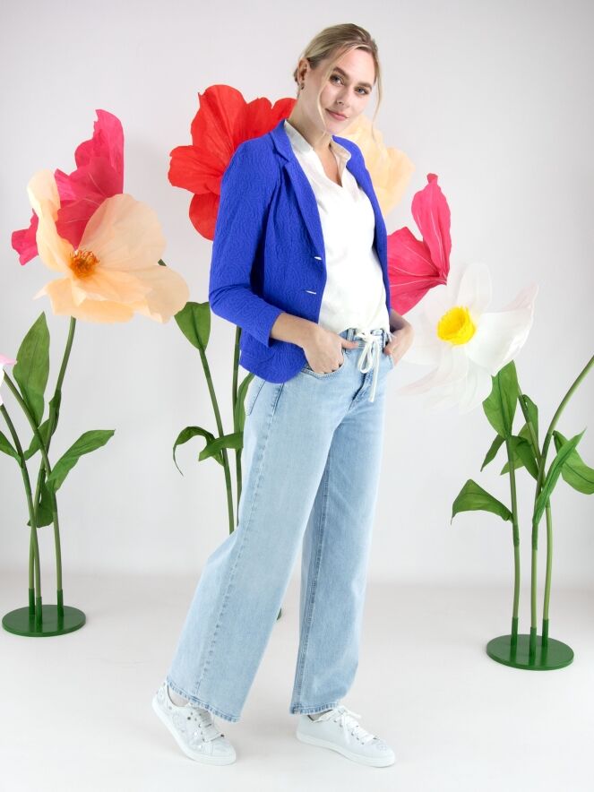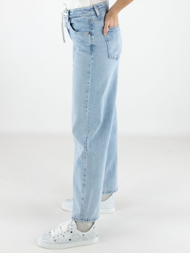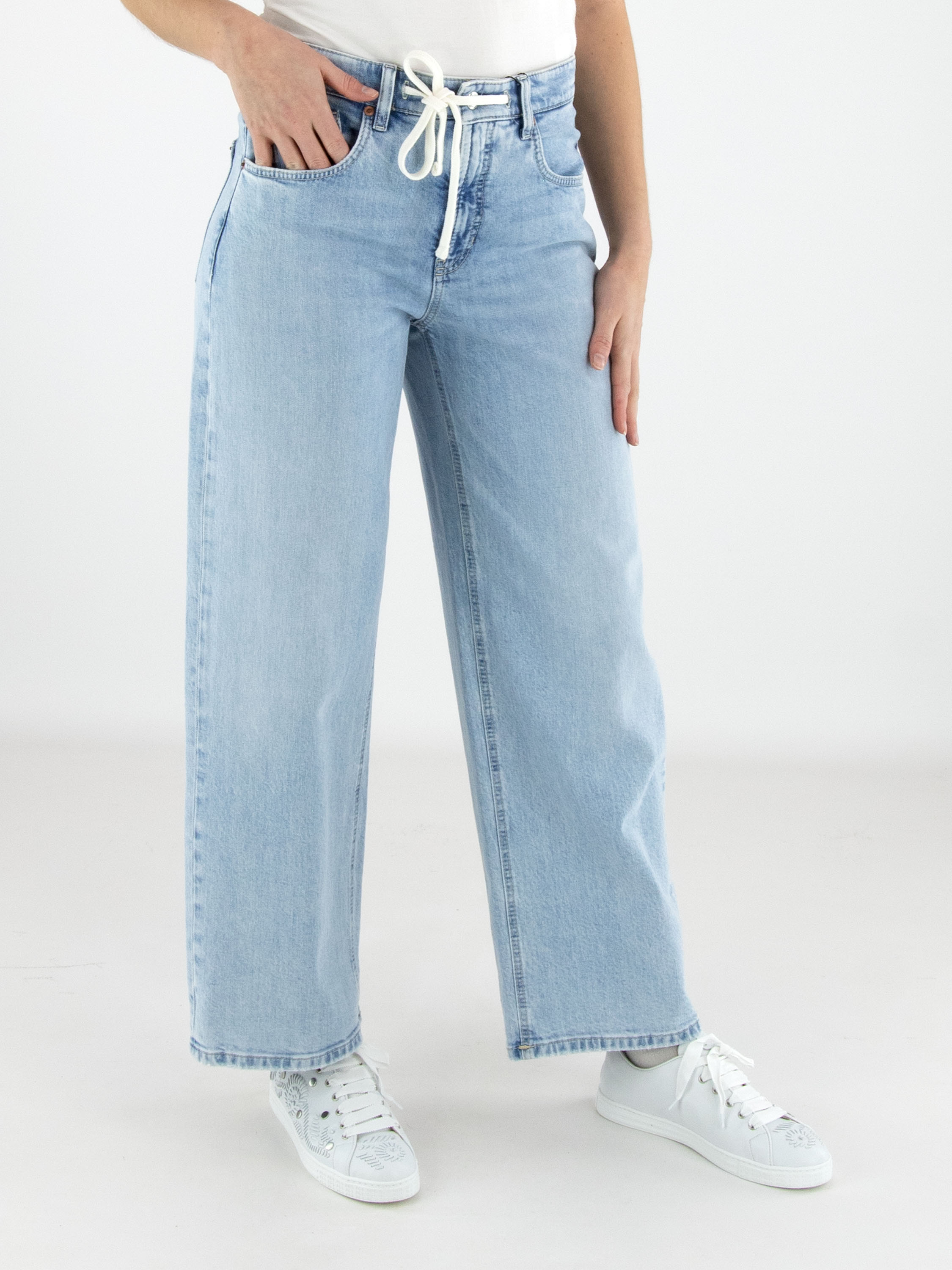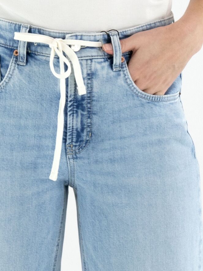Lichtblauw gewassen jeans van Cambio in een modern 5-pocket model. In de tailleband is een wit koord verwerkt in een tunnel, wat zorgt voor een sportieve en comfortabele uitstraling. De zakken zijn rond uitgesneden, wat het ontwerp een verfijnd detail geeft. Deze designerjeans kan op 30 graden worden gewassen.