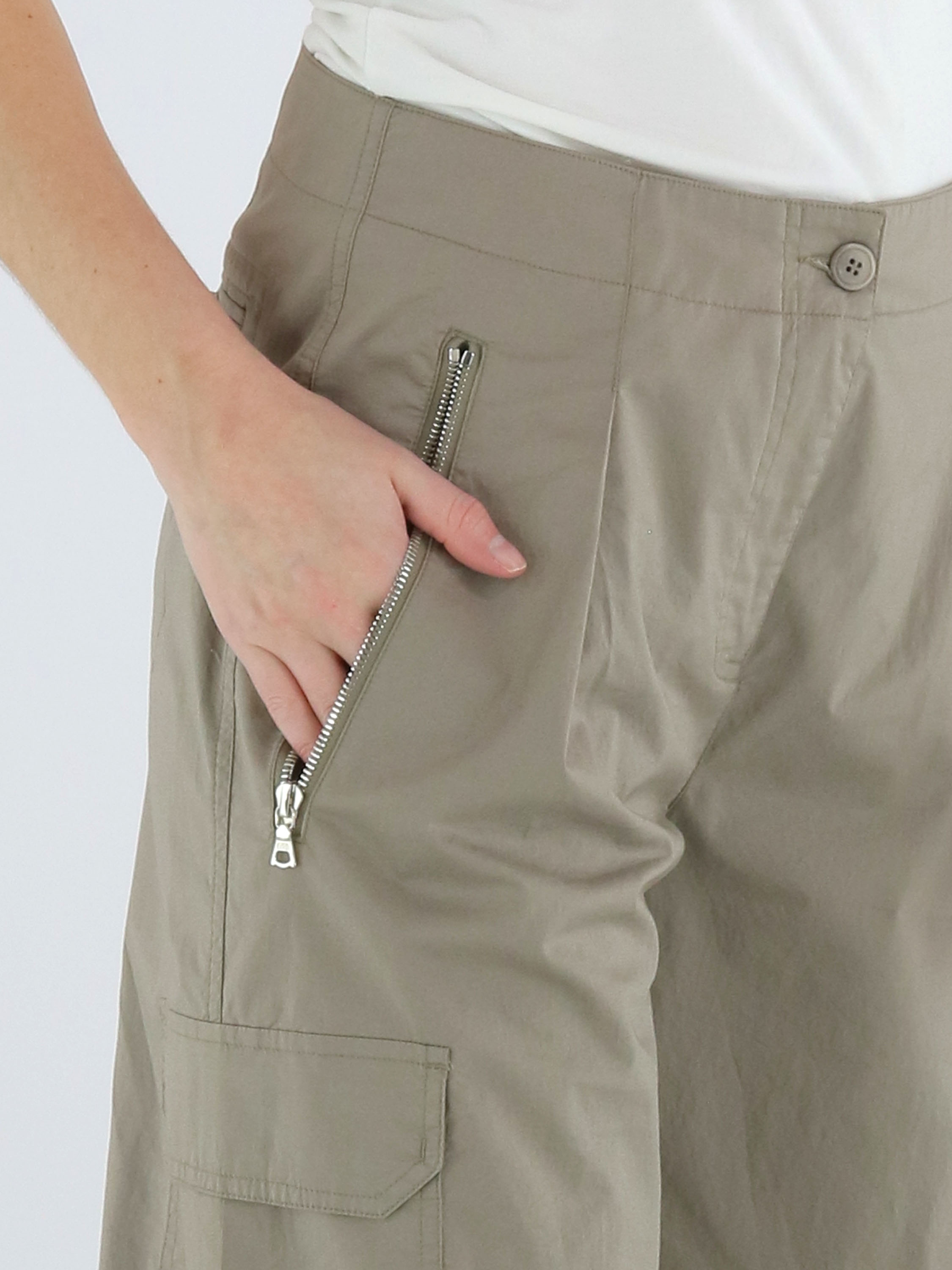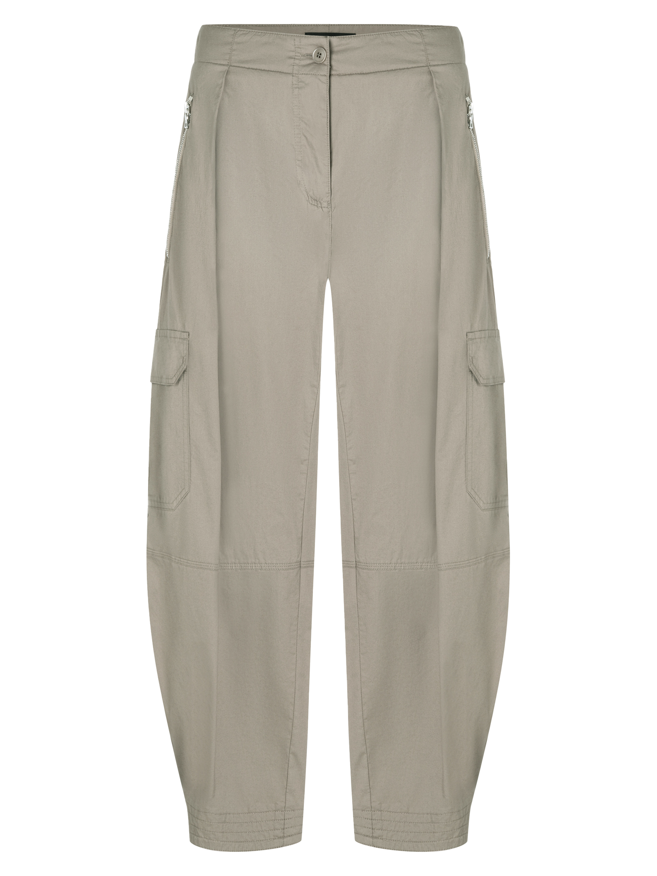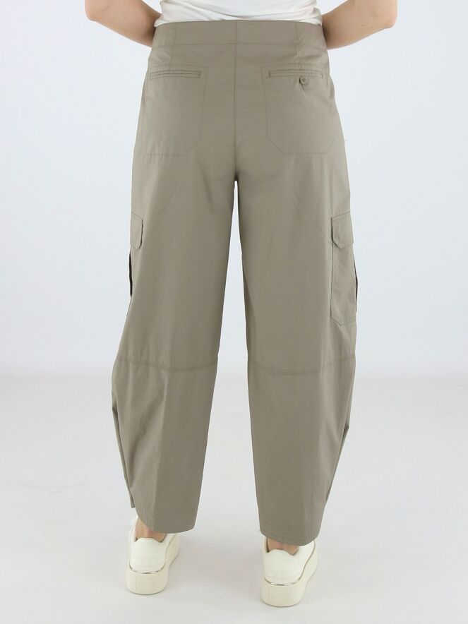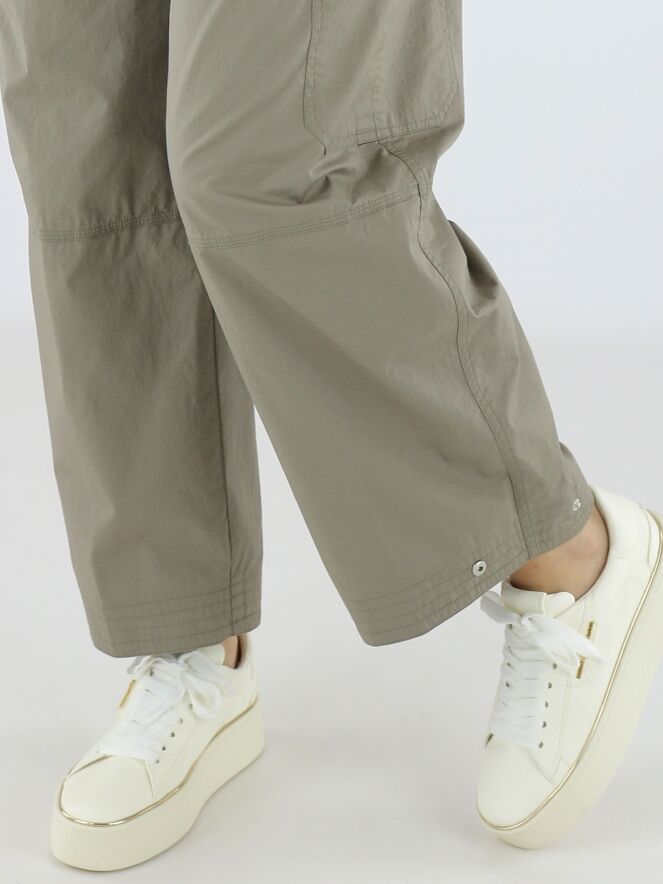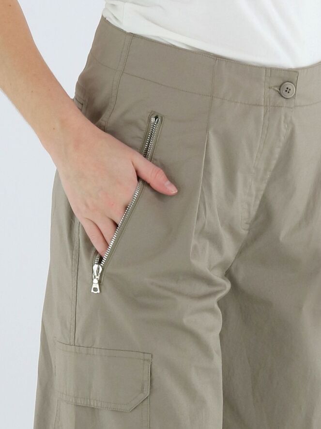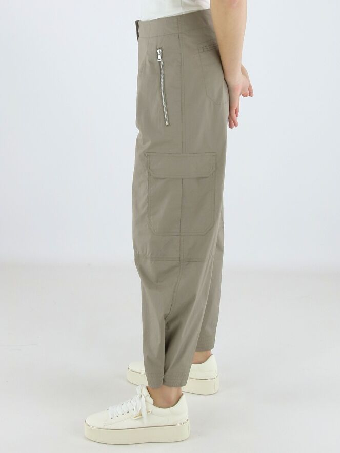 Een cargobroek van Cambio in een taupe kleur. De broek is uitgevoerd in een 5-pocket model metin het mideen van de pijpen een ingestreken plooi .Aan de onderkant heeft de broek een druk knoop om de pijpen iets smaller te kunnen maken. De broek heeft steekzakken en mag met de hand worden gewassen.