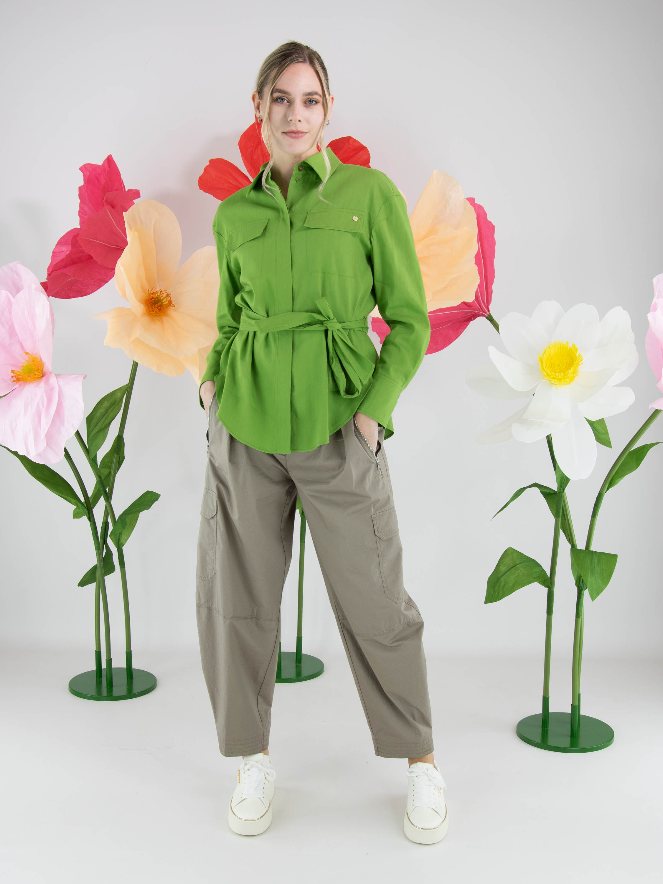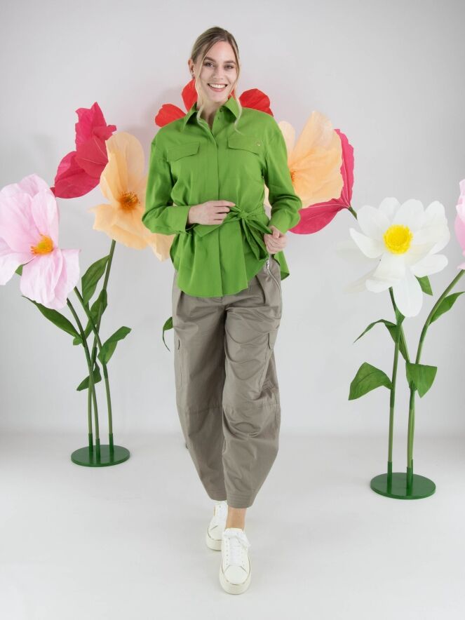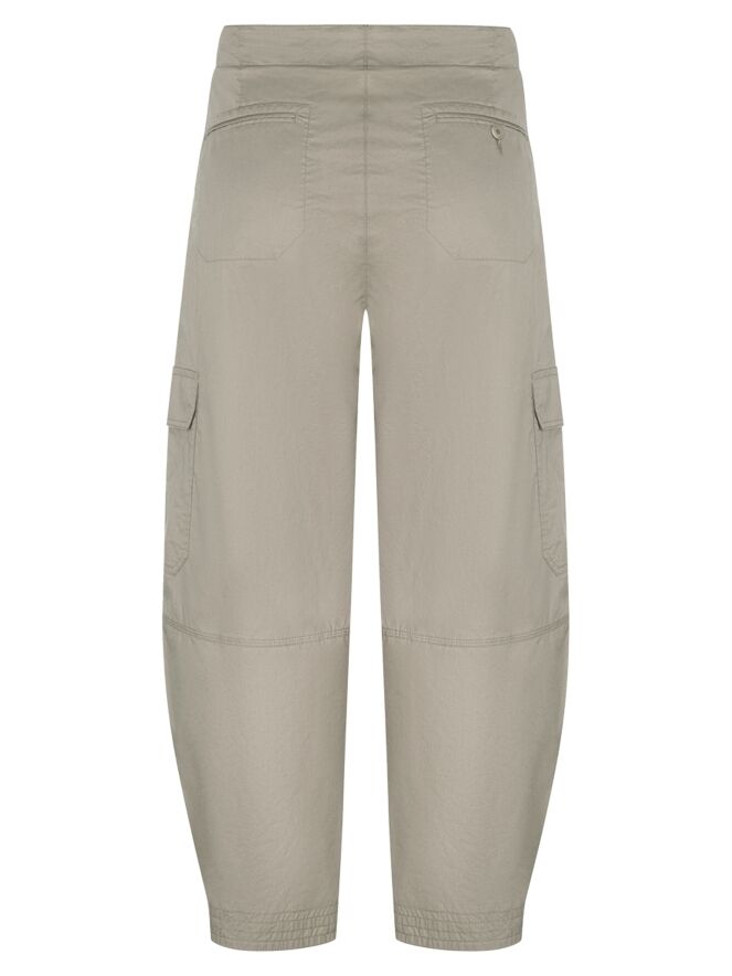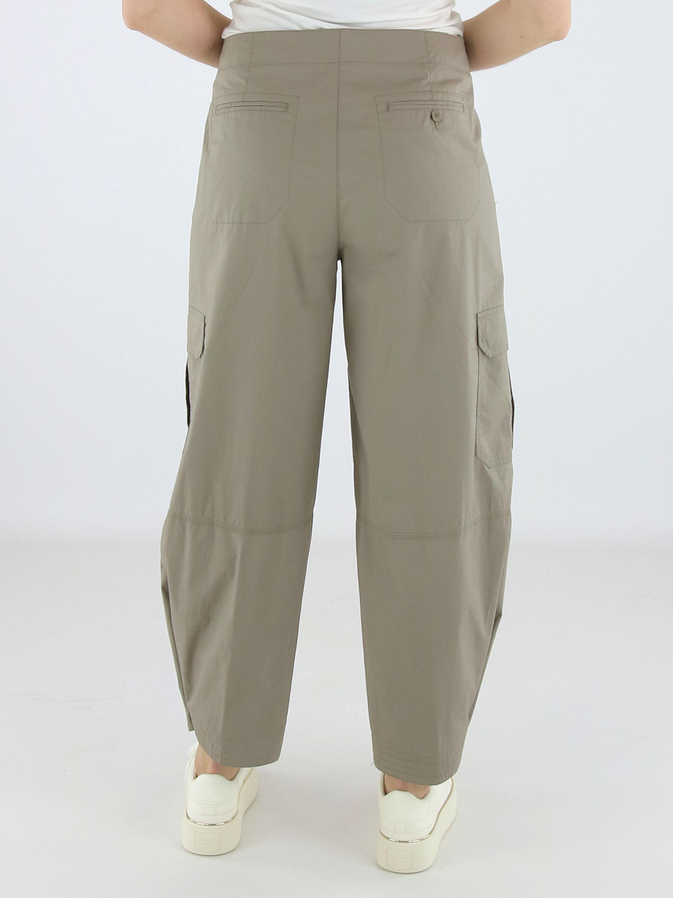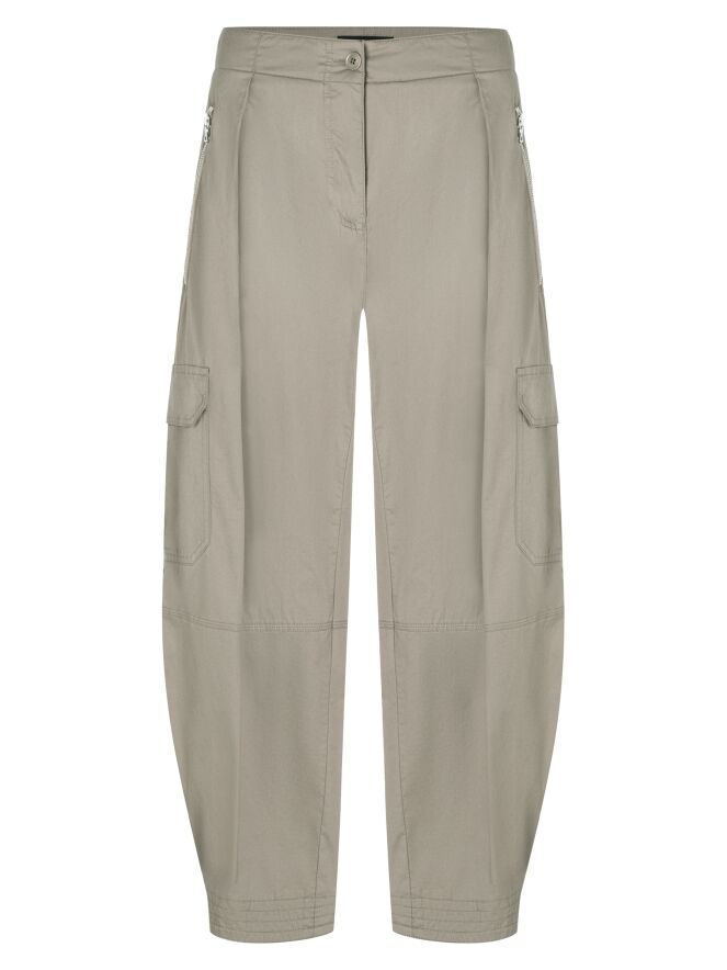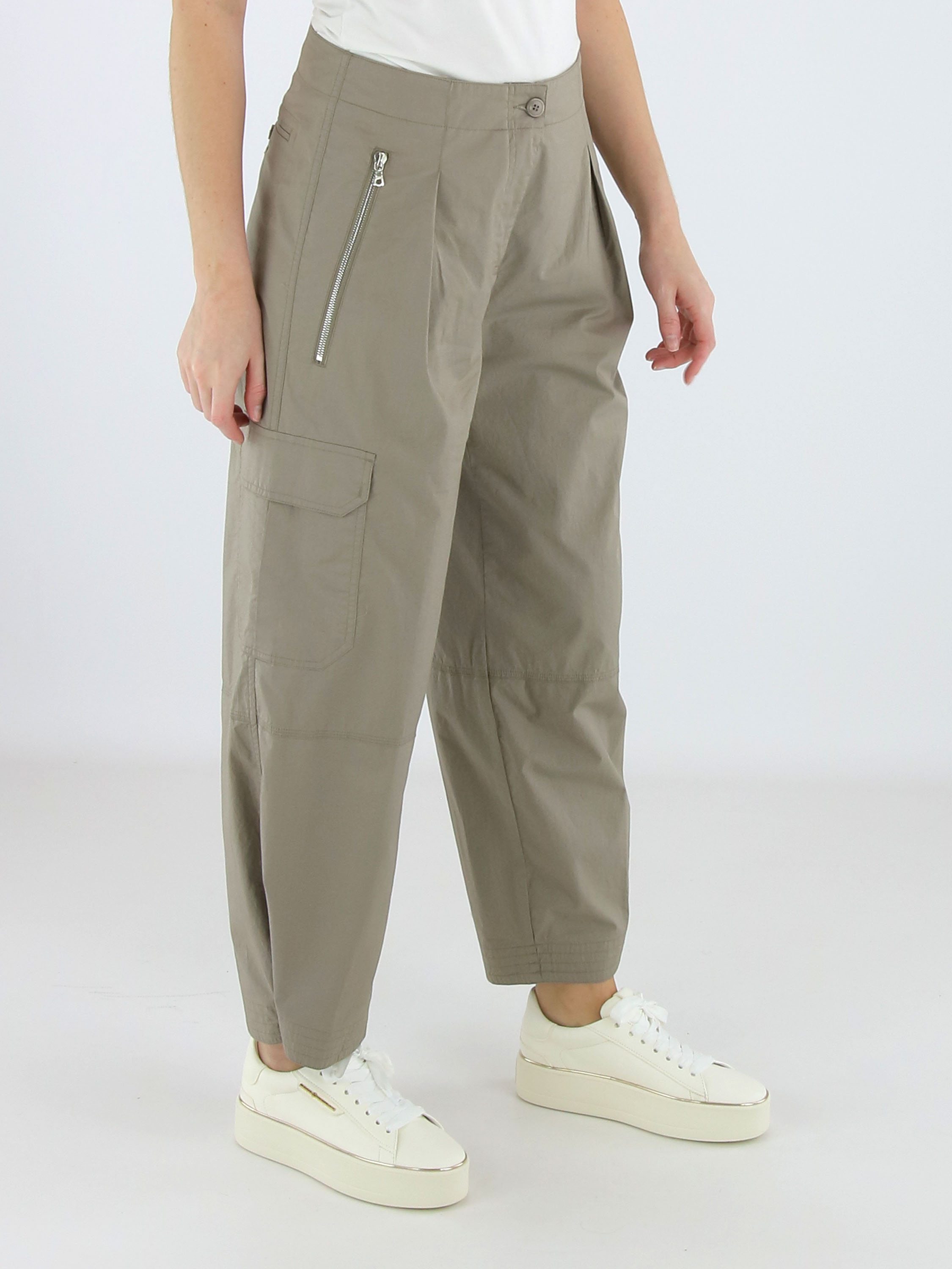 Een cargobroek van Cambio in een taupe kleur. De broek is uitgevoerd in een 5-pocket model metin het mideen van de pijpen een ingestreken plooi .Aan de onderkant heeft de broek een druk knoop om de pijpen iets smaller te kunnen maken. De broek heeft steekzakken en mag met de hand worden gewassen.