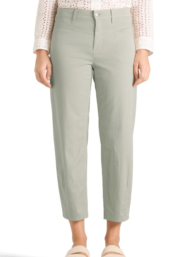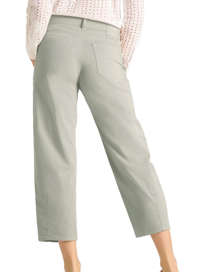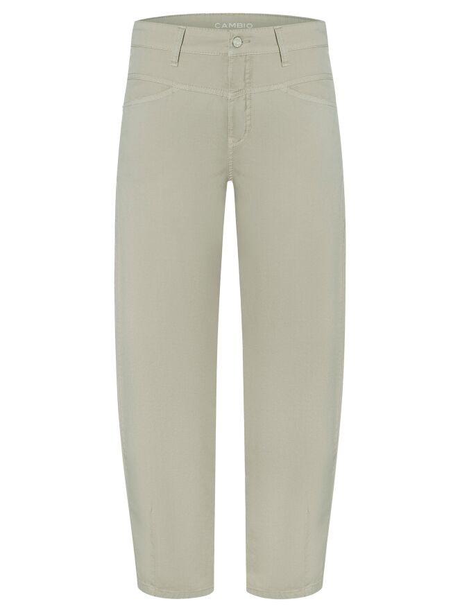 Een broek van Cambio in een zomerse katoenkwaliteit in een zachte olijfgroene kleur. De broek heeft licht verlaagde zakken aan de voorkant en kan op 30 graden worden gewassen.