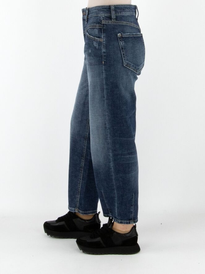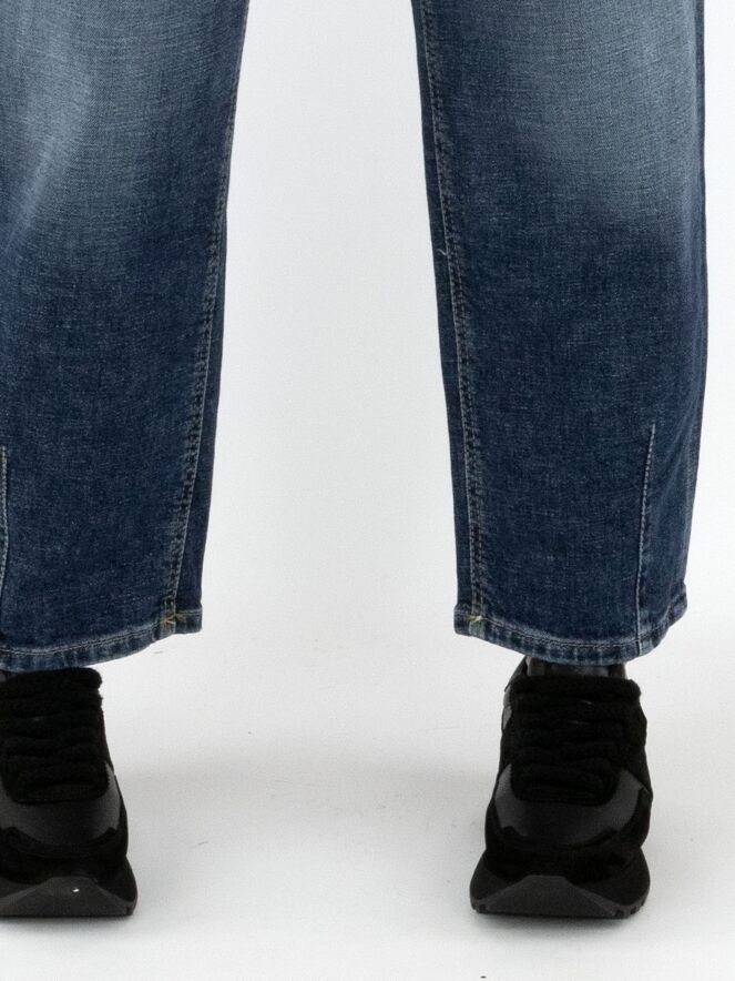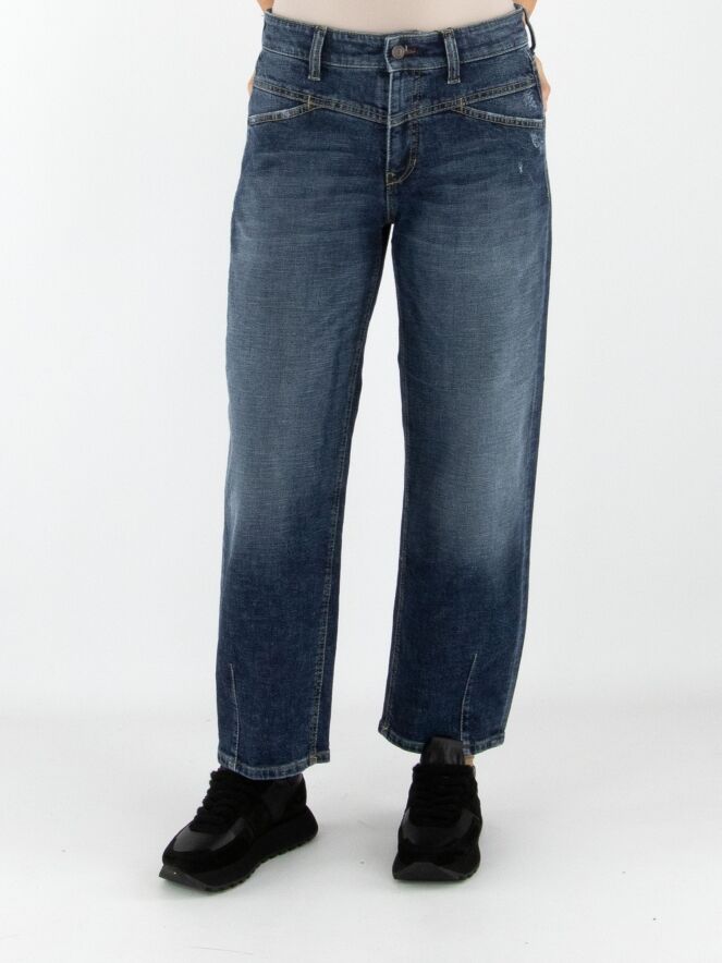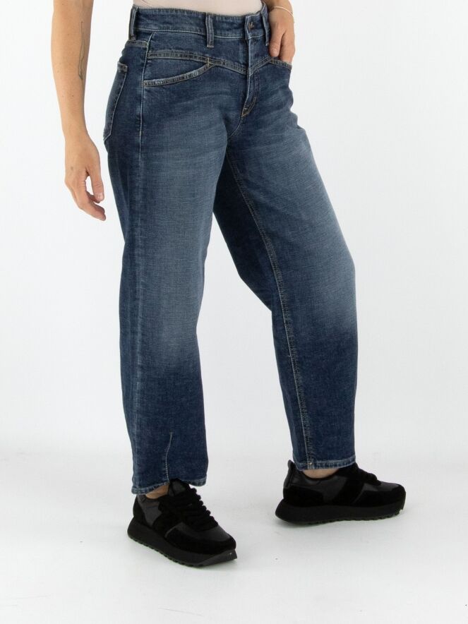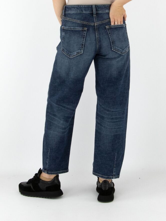 Een jeans van Cambio in een donkere denimkleur. De jeans is uitgevoerd met een verticale coupnaad aan de onderkant van de pijpen. De randen van de voorzakken zijn afgewerkt met een lichte diagonale lijn, wat de jeans een subtiele, elegante uitstraling geeft. Deze jeans mag op 30 graden worden gewassen.