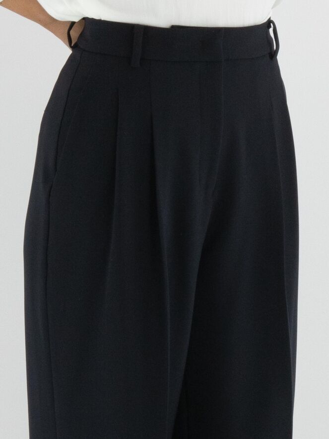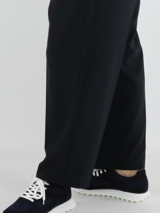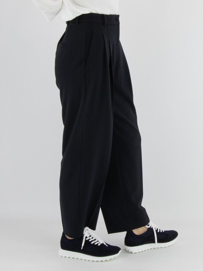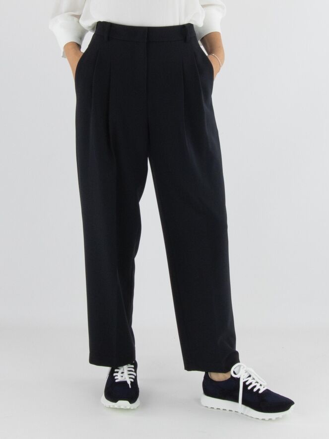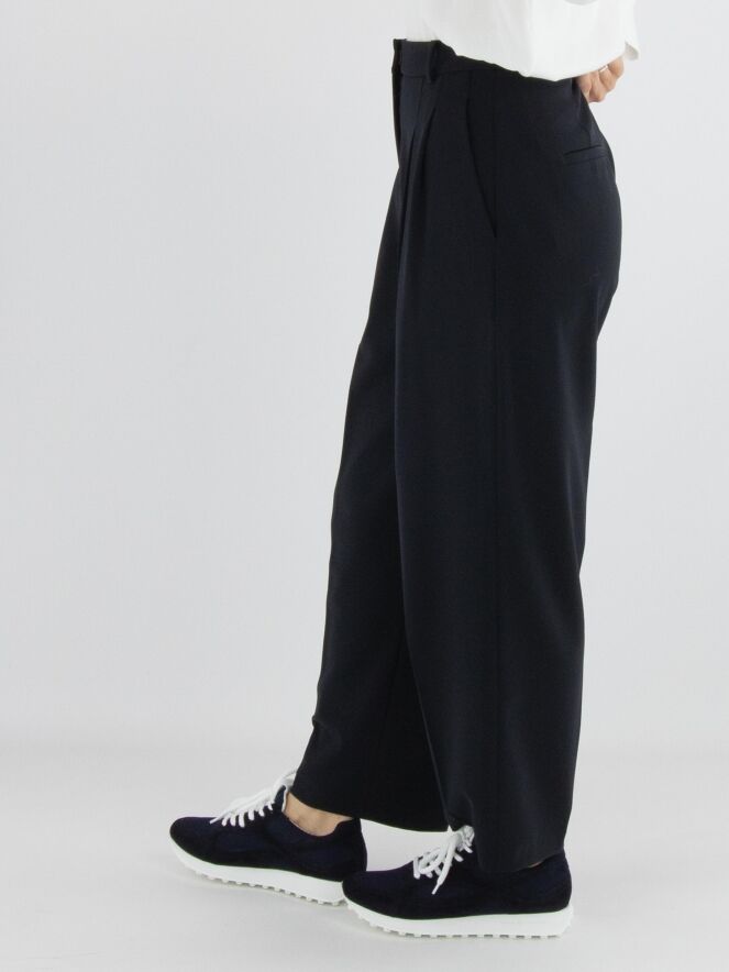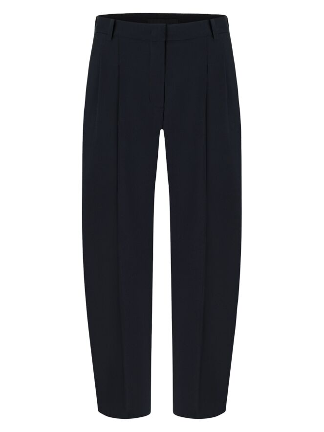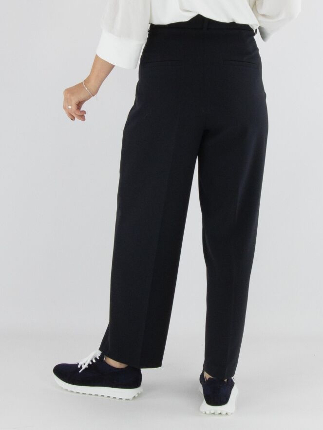 Een broek van Cambio in een marineblauwe kleur. In het midden van de pijpen is een ingestreken plooi aangebracht. De broek heeft bandplooien vanuit de taille en steekzakken. Deze broek mag met de hand worden gewassen.