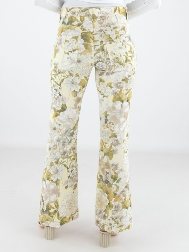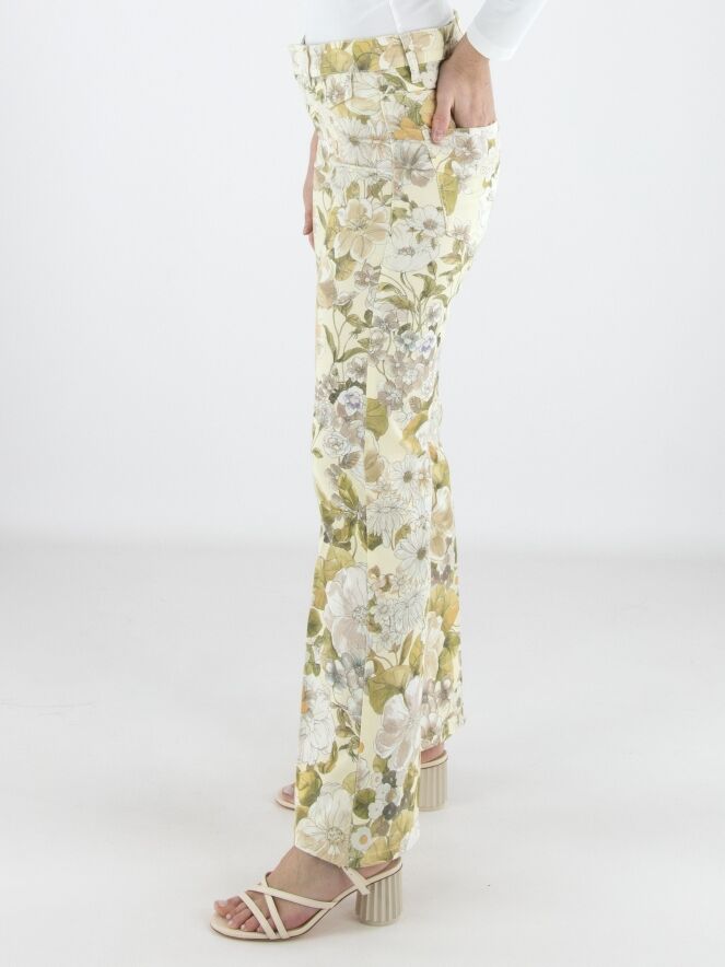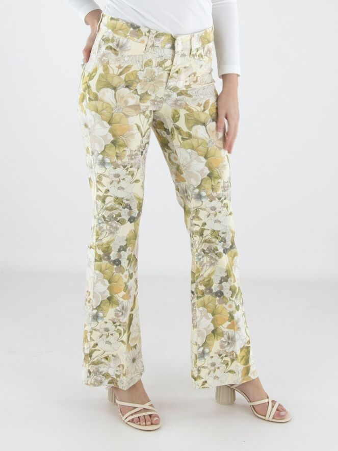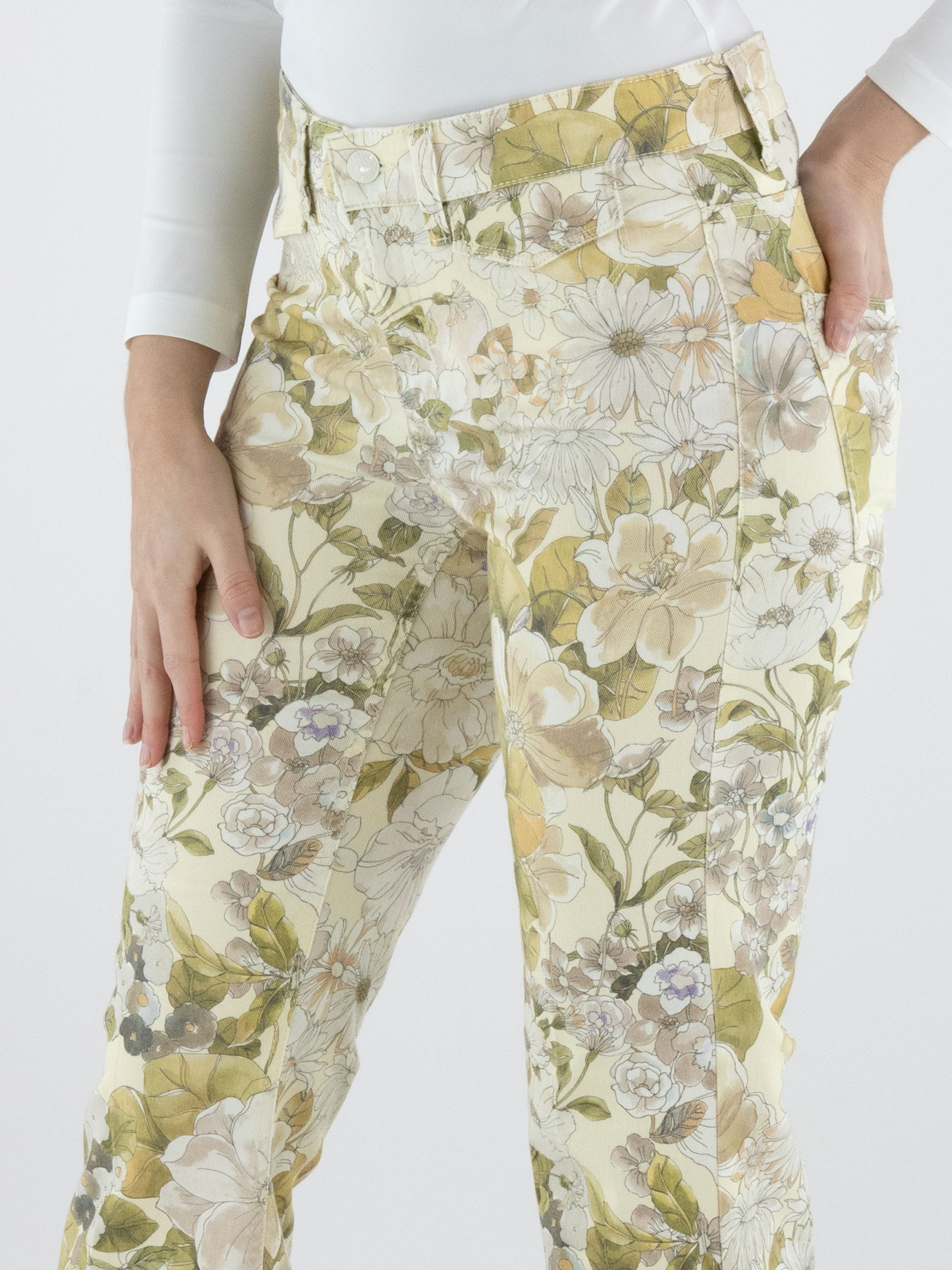Jeans van Cambio in een verfijnde bloemenprint met meerdere pasteltinten olijfgroen en taupe op een vanillekleurige achtergrond. Net onder de tailleband zijn twee decoratieve zakjes met omslag verwerkt, wat het ontwerp een speels en vrouwelijk accent geeft. In het midden van de pijpen is een ingestreken plooi aangebracht voor een elegante en slanke uitstraling. Deze exclusieve designerjeans kan op 30 graden worden gewassen.