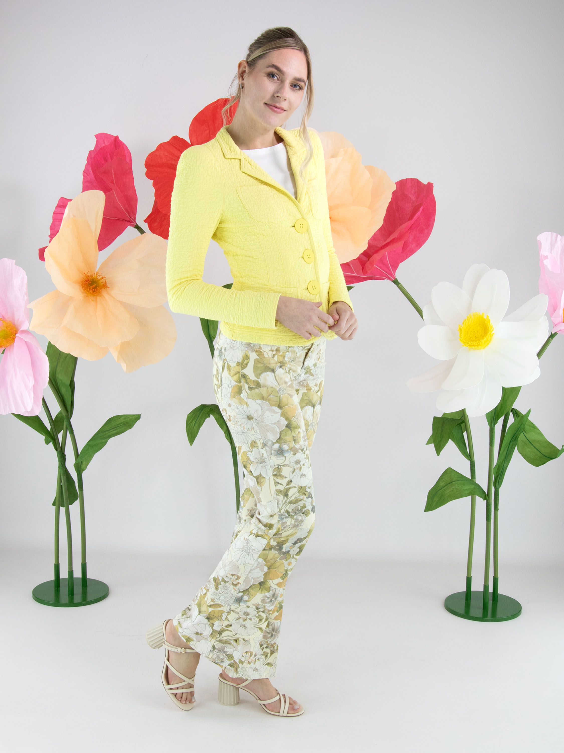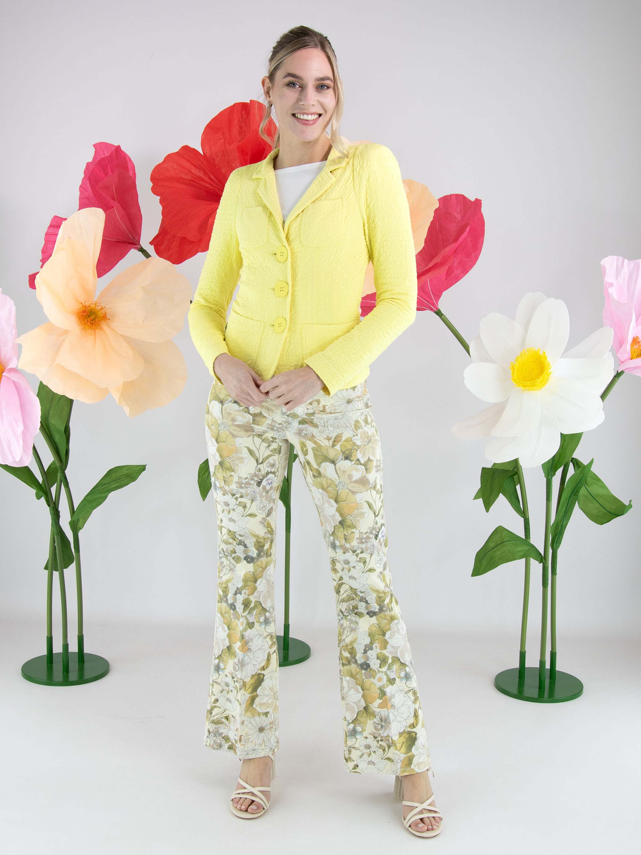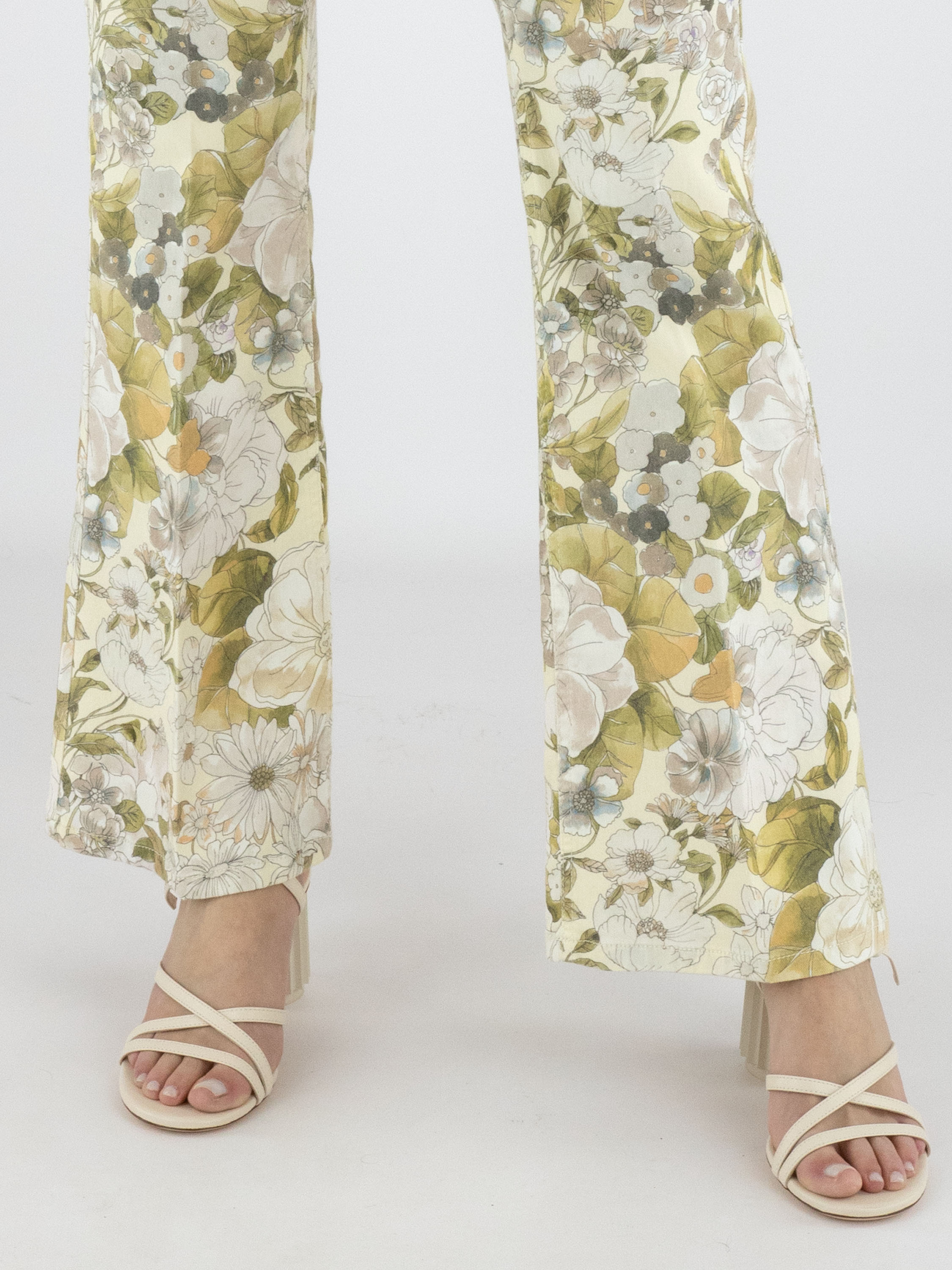 Jeans van Cambio in een verfijnde bloemenprint met meerdere pasteltinten olijfgroen en taupe op een vanillekleurige achtergrond. Net onder de tailleband zijn twee decoratieve zakjes met omslag verwerkt, wat het ontwerp een speels en vrouwelijk accent geeft. In het midden van de pijpen is een ingestreken plooi aangebracht voor een elegante en slanke uitstraling. Deze exclusieve designerjeans kan op 30 graden worden gewassen.