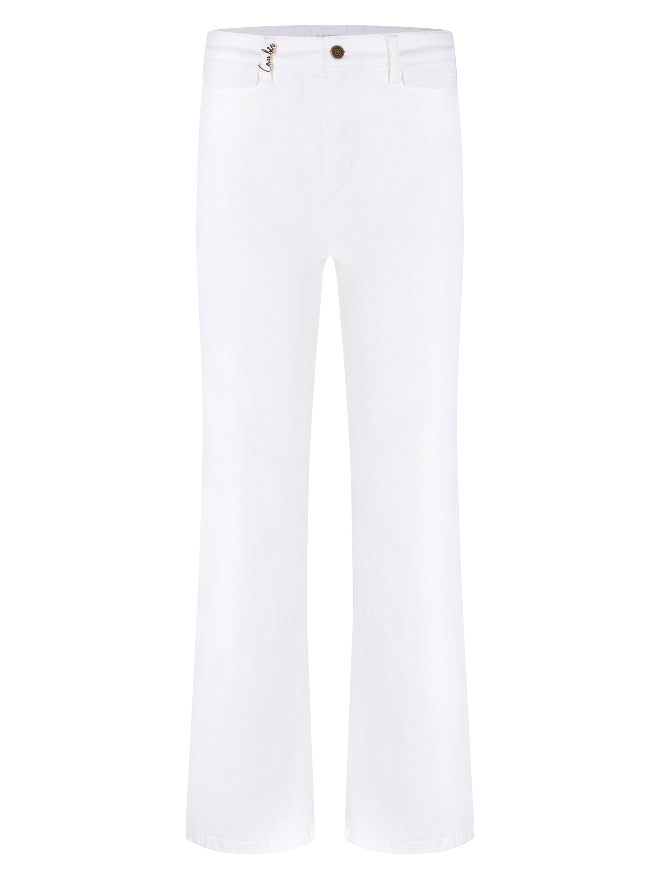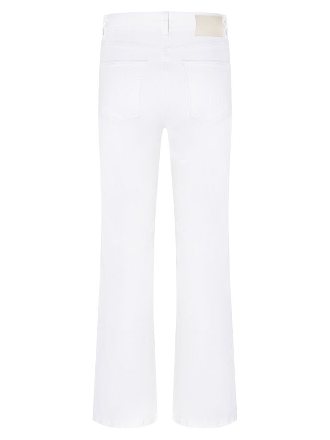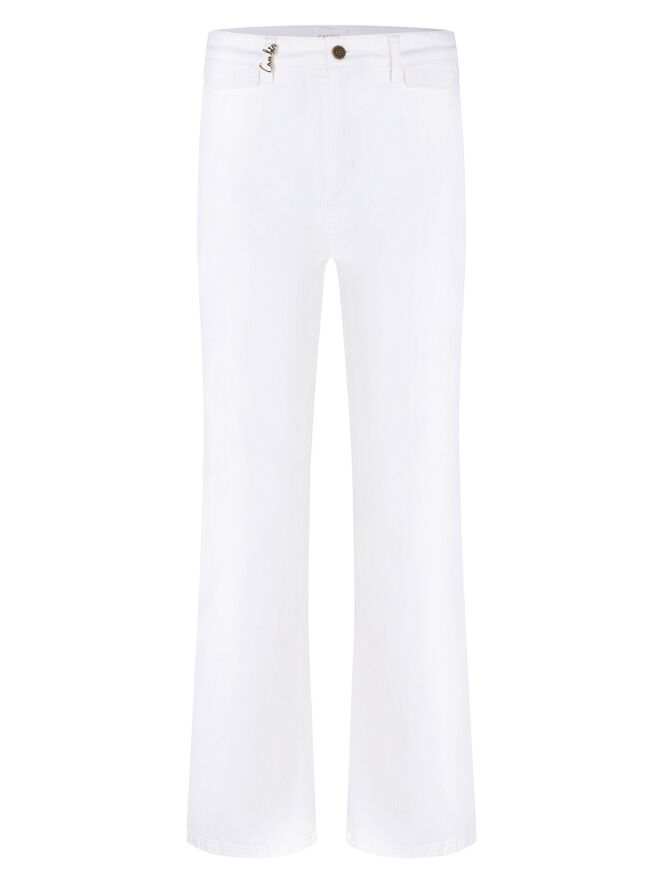 Jeans van Cambio in een frisse witte tint. Onder de tailleband zijn twee kleine decoratieve zakken met een omslag verwerkt, wat het ontwerp een speels en verfijnd detail geeft. Vanaf de knieën lopen de pijpen licht wijd uit, wat zorgt voor een elegante en moderne lijn. Deze jeans kan op 30 graden worden gewassen.