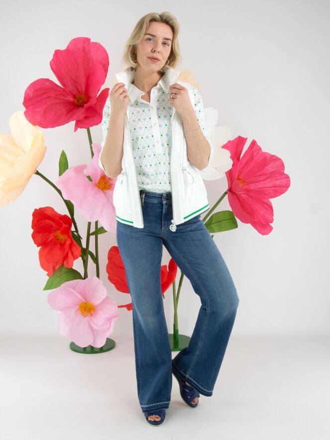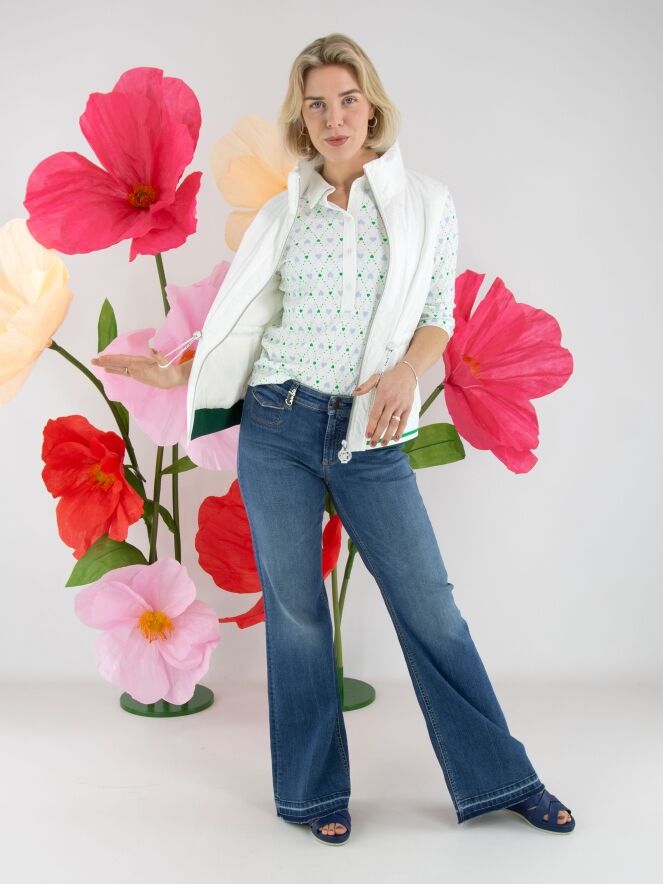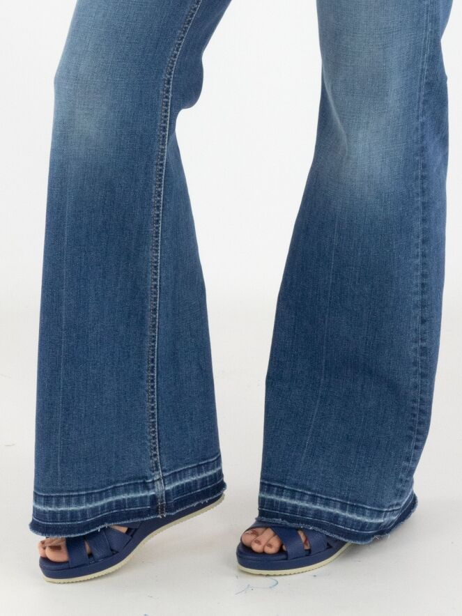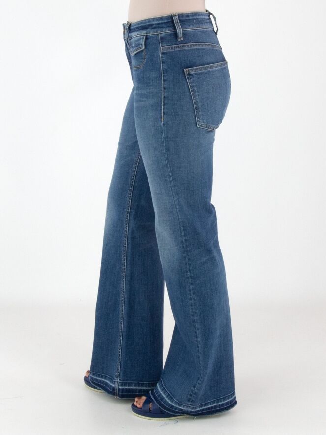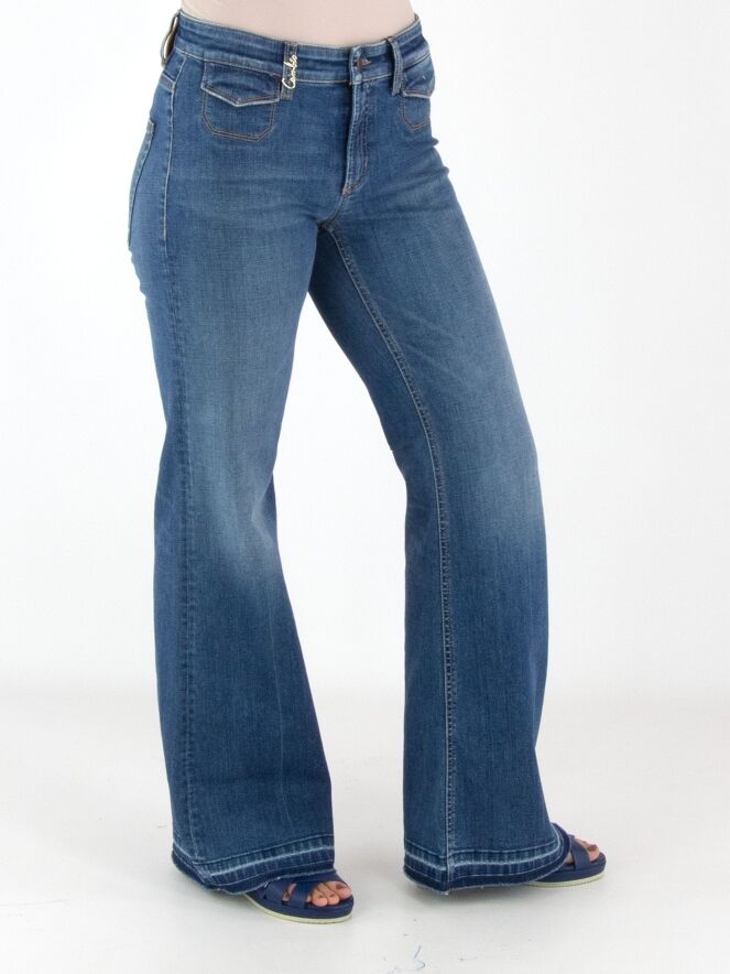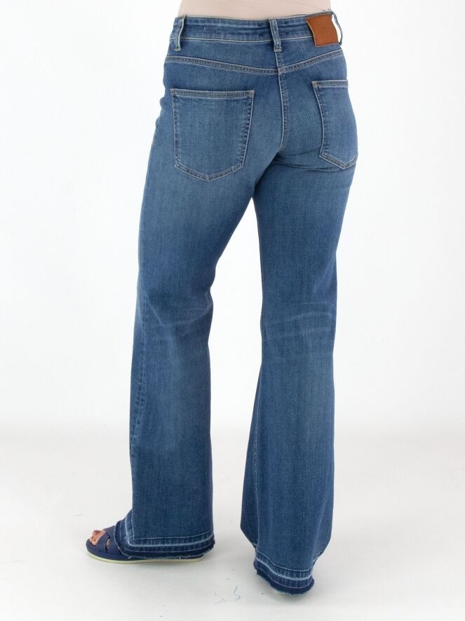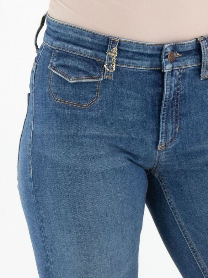 Een jeans van Cambio in een basic jeanskleur. Onder de tailleband zijn twee kleine decoratieve zakken met een omslag verwerkt. Vanaf de knieën lopen de pijpen licht wijd uit. Aan de onderkant zijn langs de rand enkele gebleekte strepen zichtbaar. Deze jeans kan op 30 graden worden gewassen.