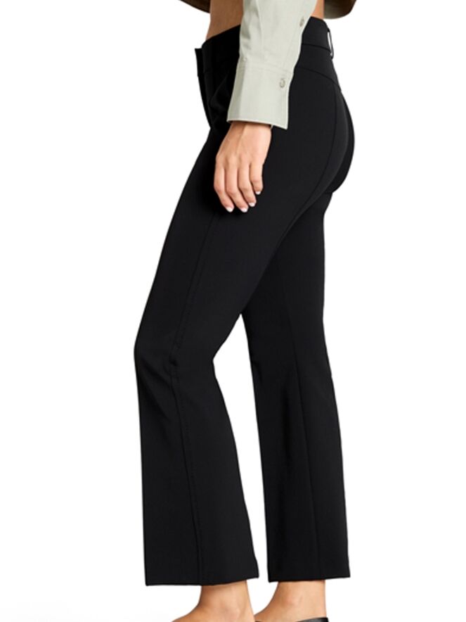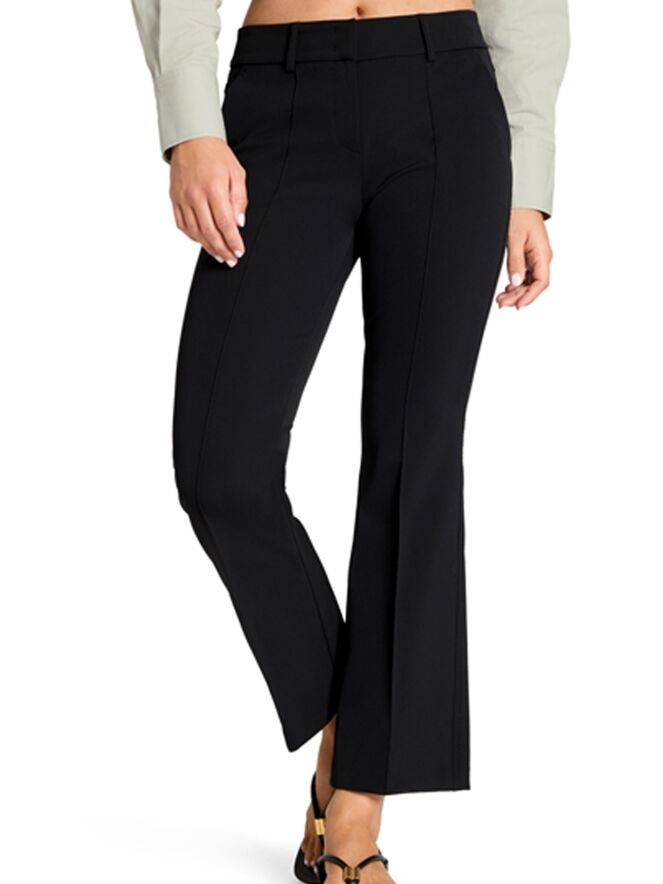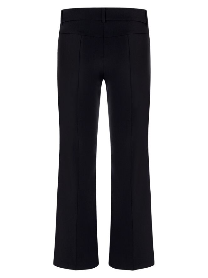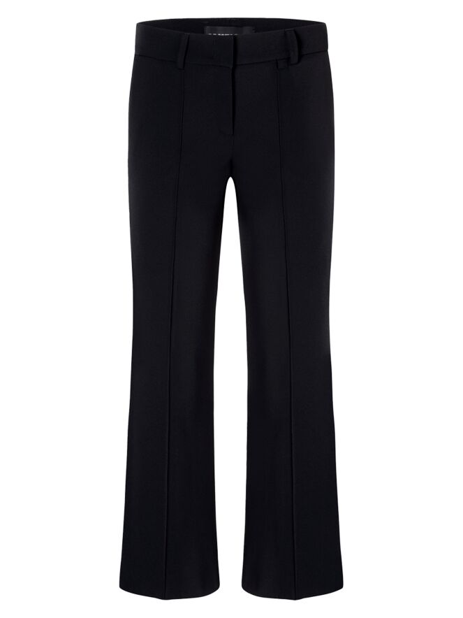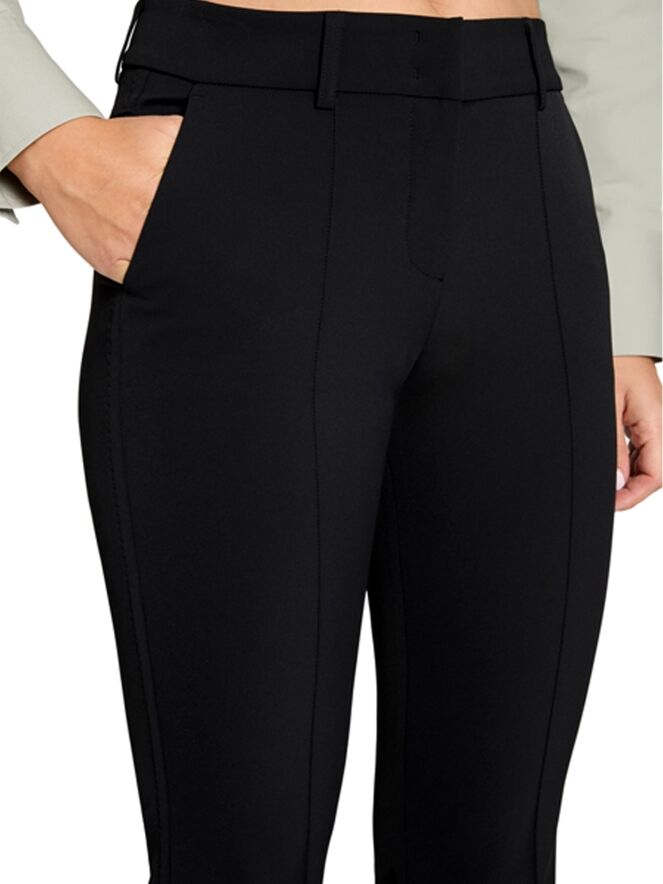 Een broek van Cambio in de kleur zwart. In het midden van de pijpen loopt een omgekeerde stiknaad. Langs de zijkanten is een decoratieve zwarte bies met een ton sur ton stiknaad. De broek heeft steekzakken en mag op de hand worden gewassen.