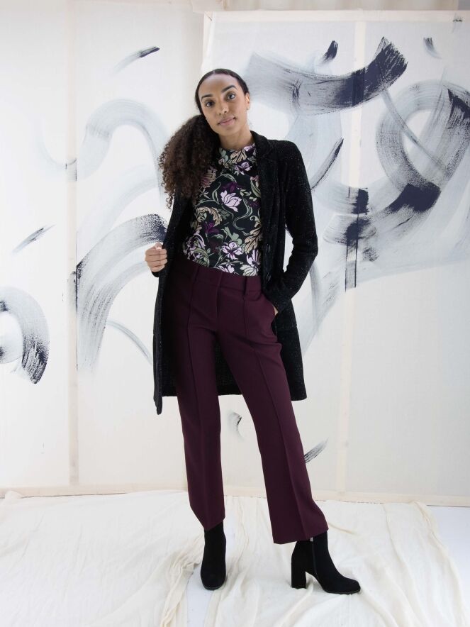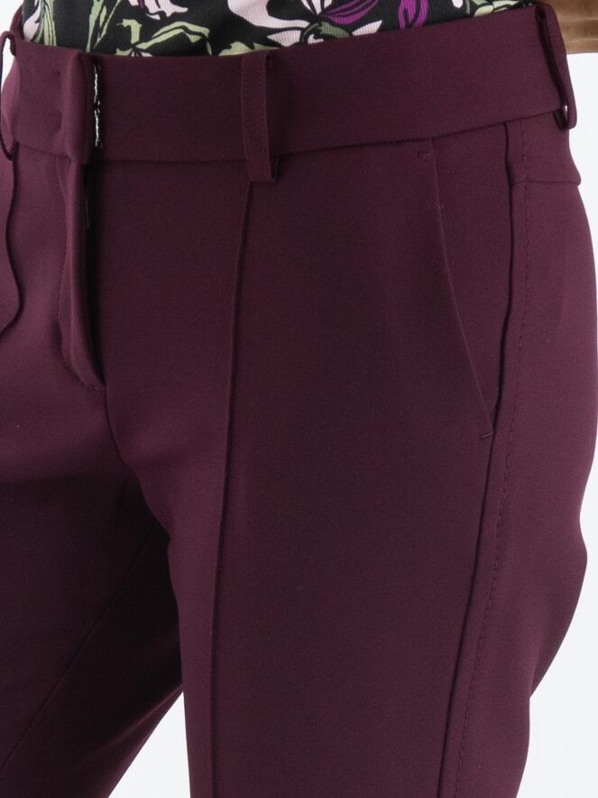 Een broek van Cambio in de kleur bordeauxrood. Langs de zijkanten is een decoratieve stiknaad. In het midden van de pijpen is tevens een stiknaad. De broek heeft steekzakken en mag op 30 graden worden gewassen.