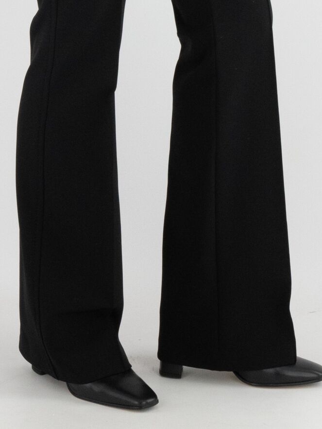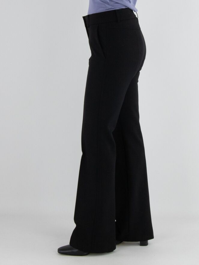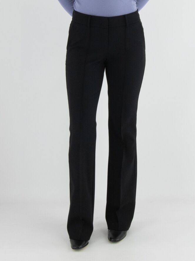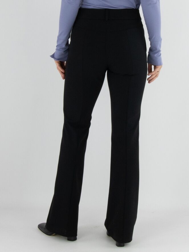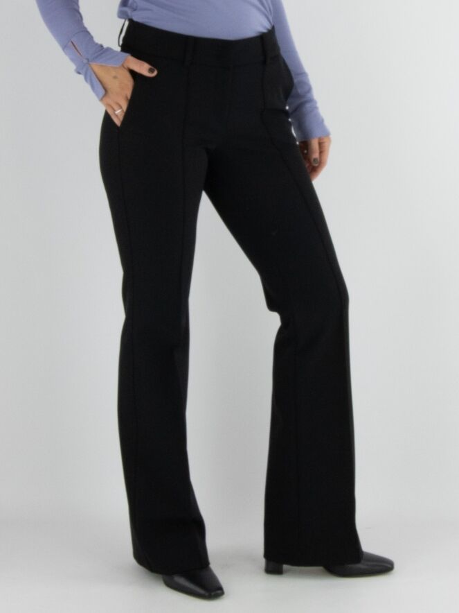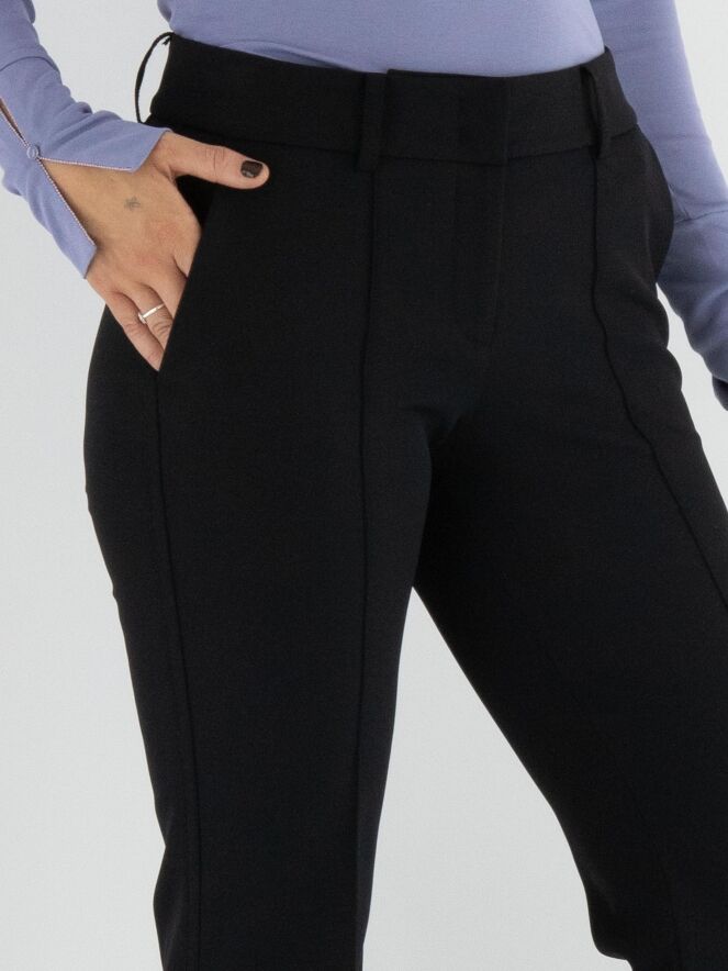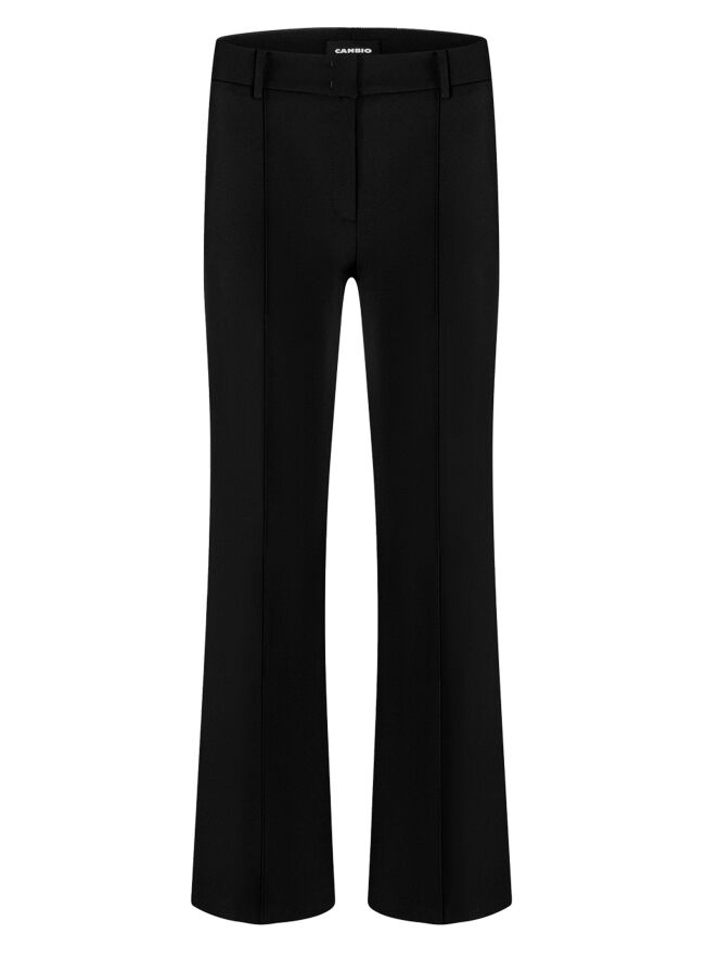 Een broek van Cambio in de kleur zwart. In het midden van de pijpen loopt een stiknaad. Langs de buitenzijde van de zijkanten is een decoratieve stikdraad verwerkt. De broek heeft steekzakken en mag op 30 graden worden gewassen.