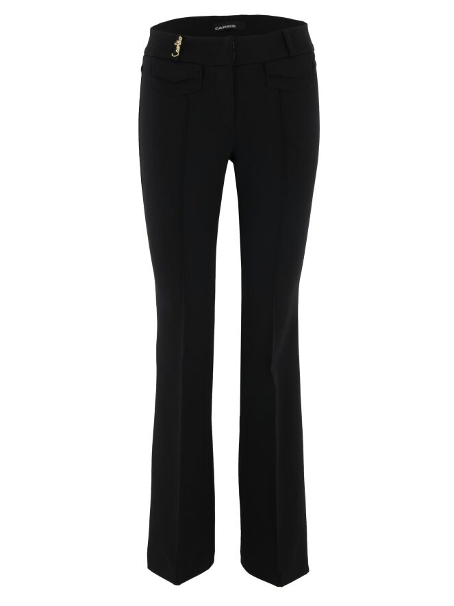 Een broek van Cambio in de kleur zwart. In het midden van de pijpen is een stiknaad. Onder de tailleband zijn twee decoratieve zakjes geplaatst. De broek heeft steekzakken en mag op 30 graden worden gewassen.