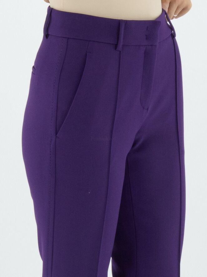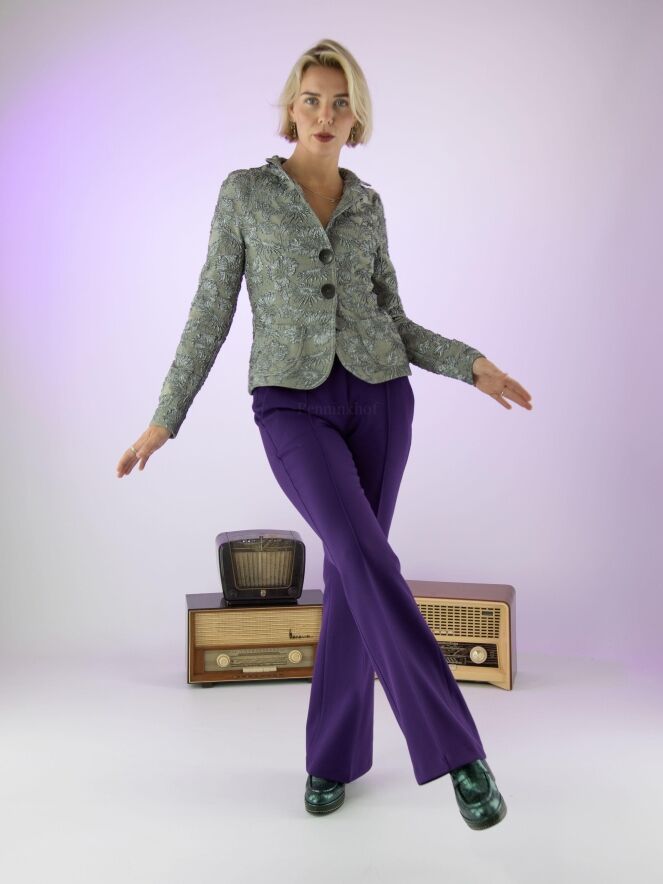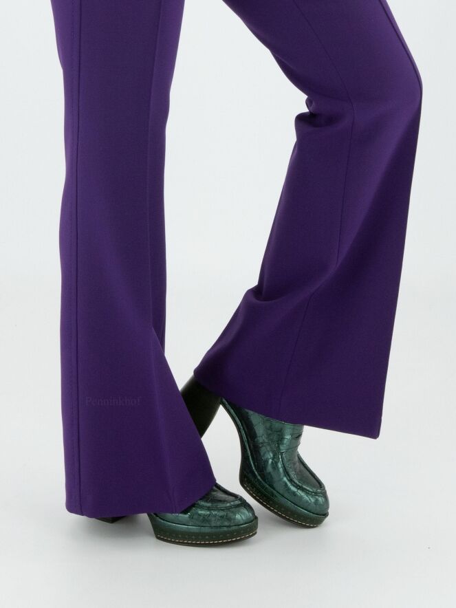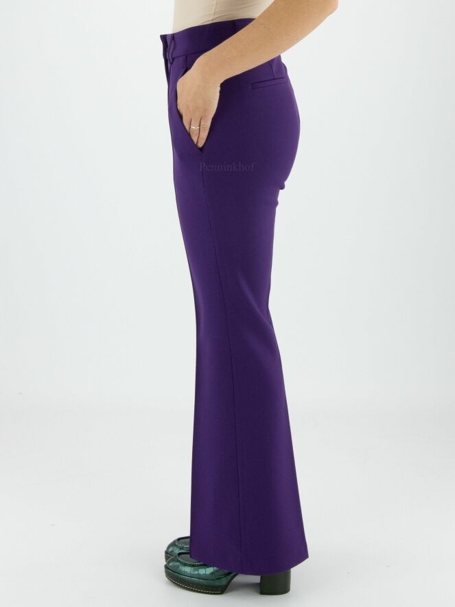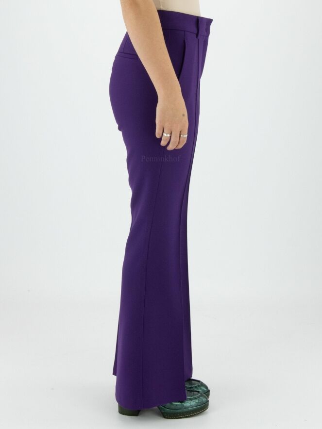 Een flared broek van Cambio in de kleur paars. De broek heeft steekzakken en in het midden van de pijpen is een stiknaad. Aan de zijkanten is een decoratieve "ton sur ton" stiknaad. Deze broek mag op 30 graden worden gewassen.