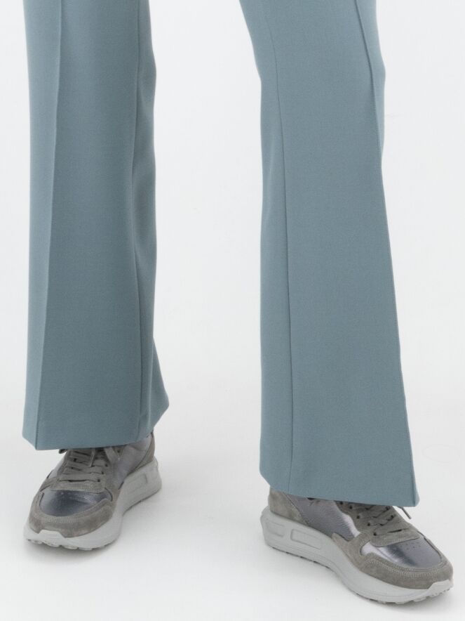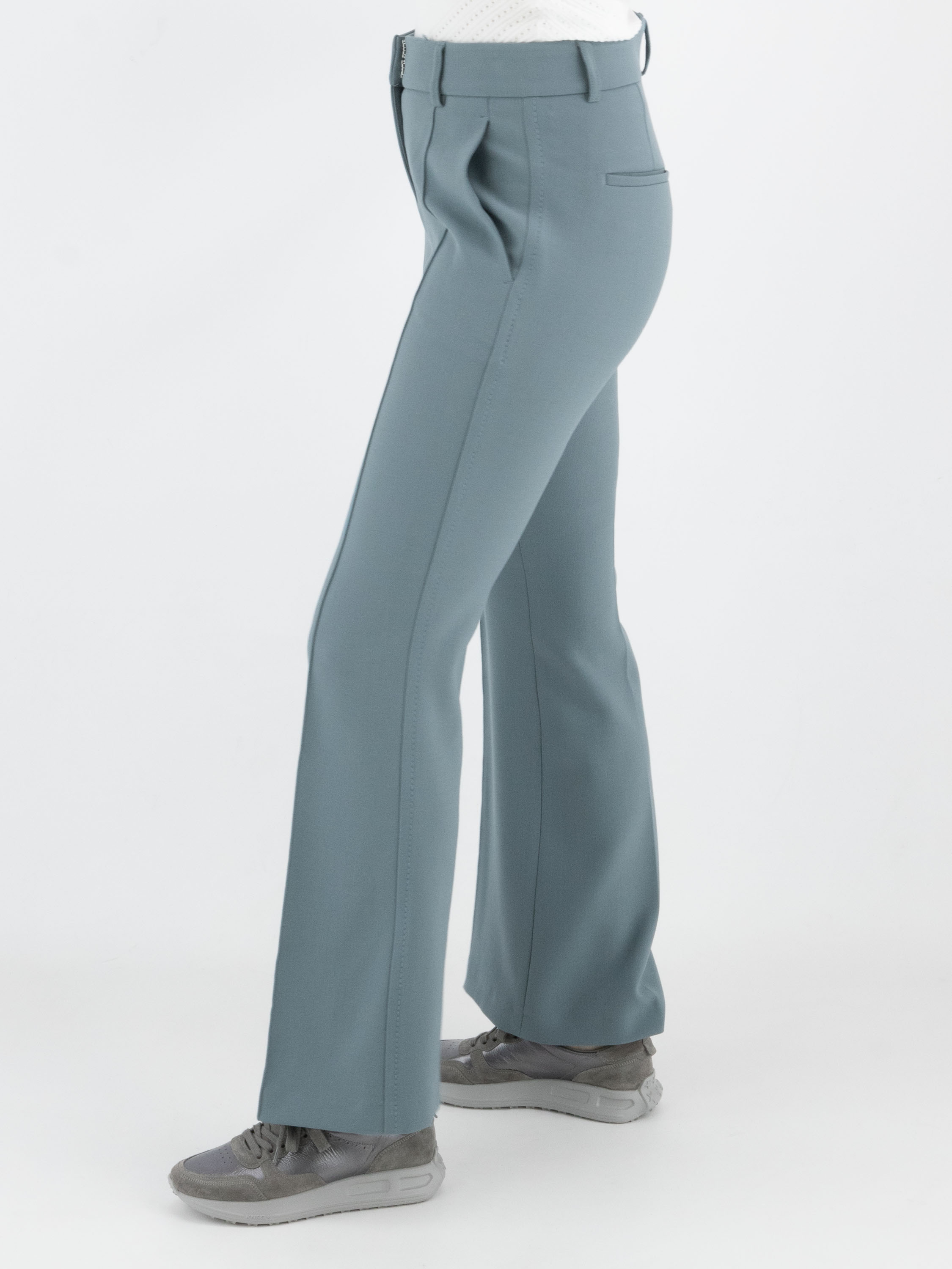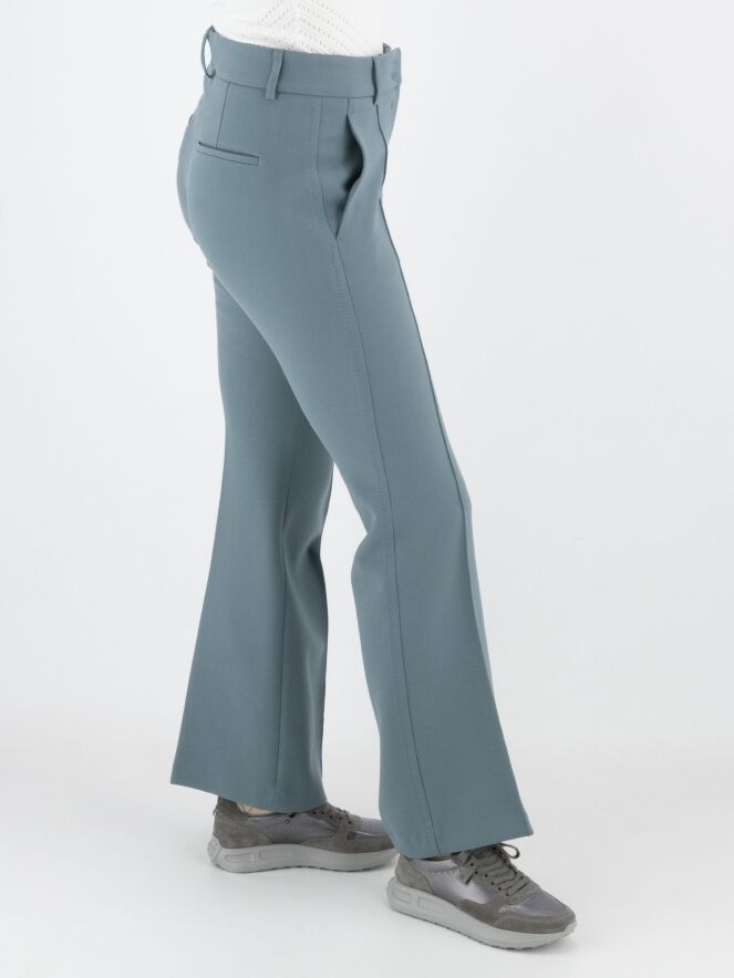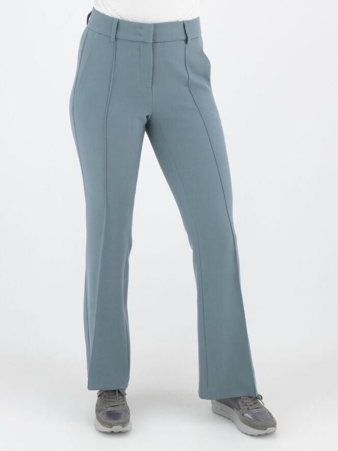 Een flared broek van Cambio in een zachte petrolblauwe kleur. De broek heeft steekzakken en in het midden van de pijpen is een stiknaad. Aan de zijkanten is een decoratieve ton sur ton stiknaad. Deze broek mag op 30 graden worden gewassen.