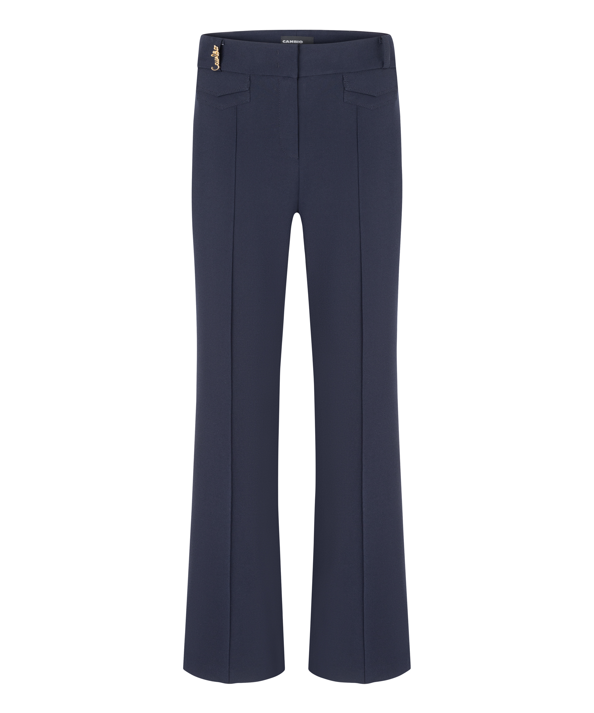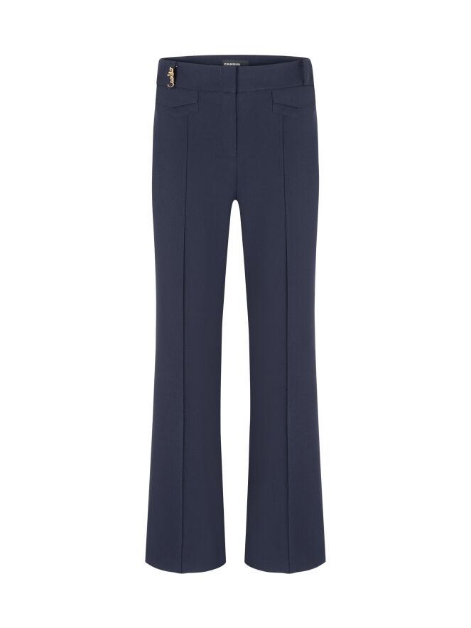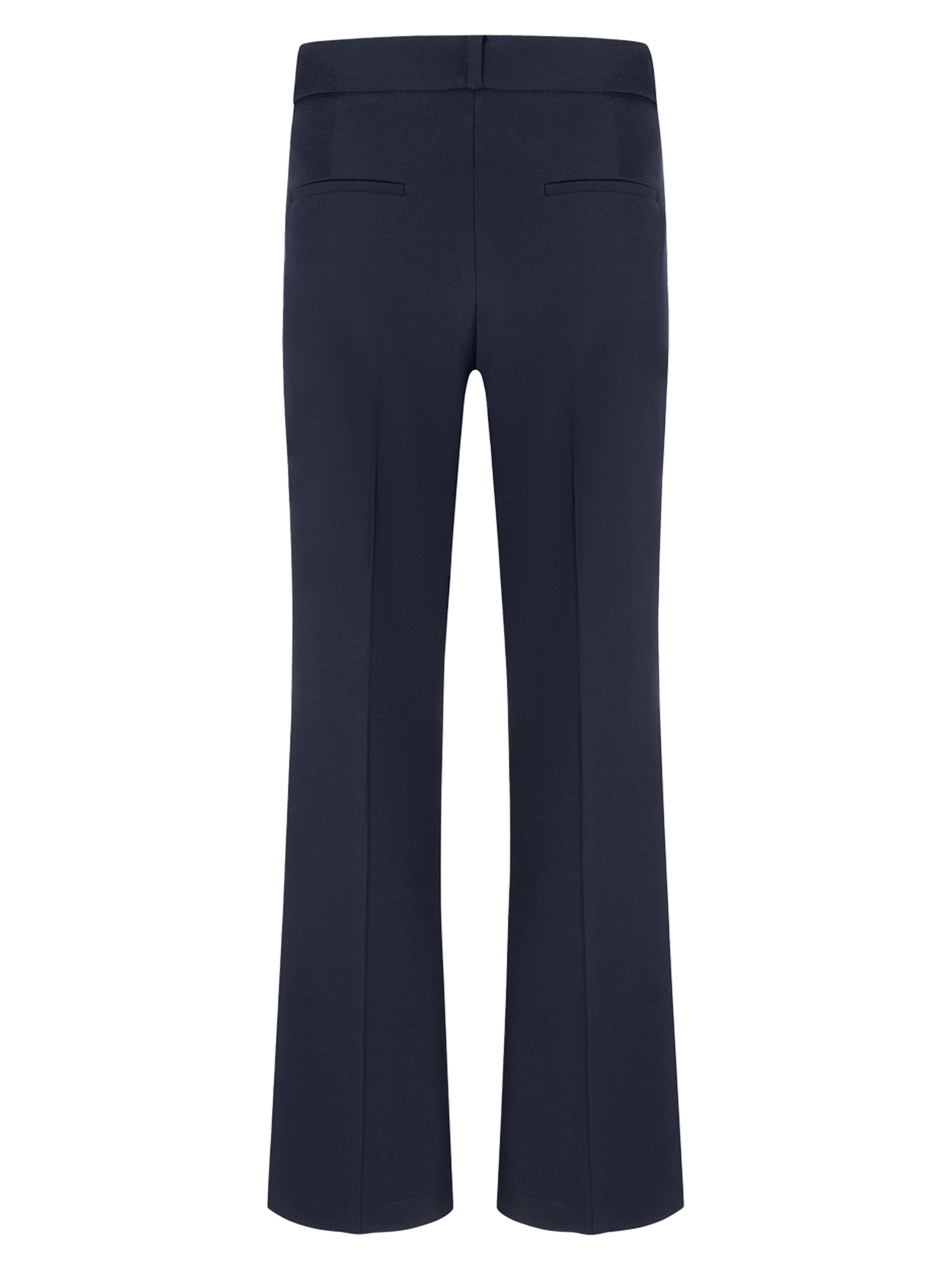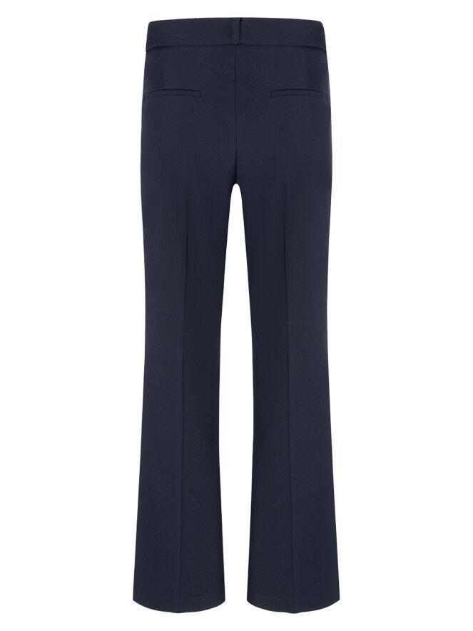Een flared broek in de kleur marineblauw. Langs de zijkanten is een decoratieve stiknaad. In het midden van de pijpen is een omgekeerde stiknaad. Onder de elastische tailleband zijn twee kleine zakjes met een omslag. Deze broek mag op 30 graden worden gewassen.