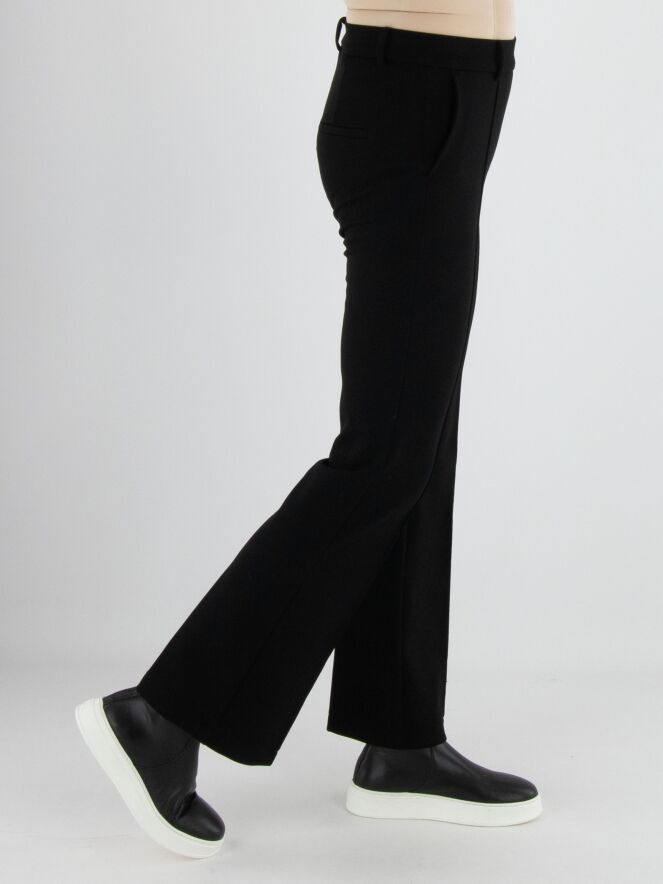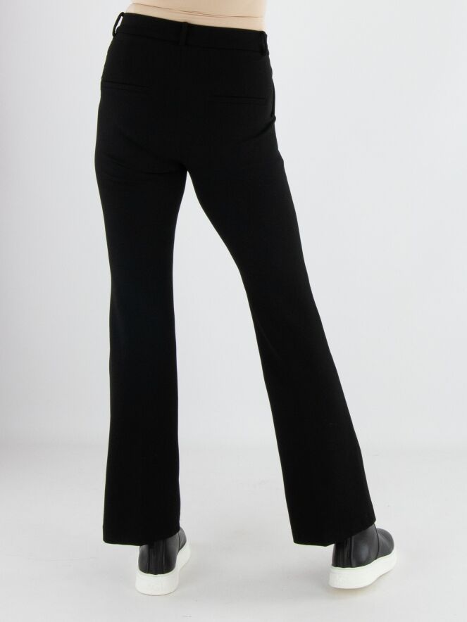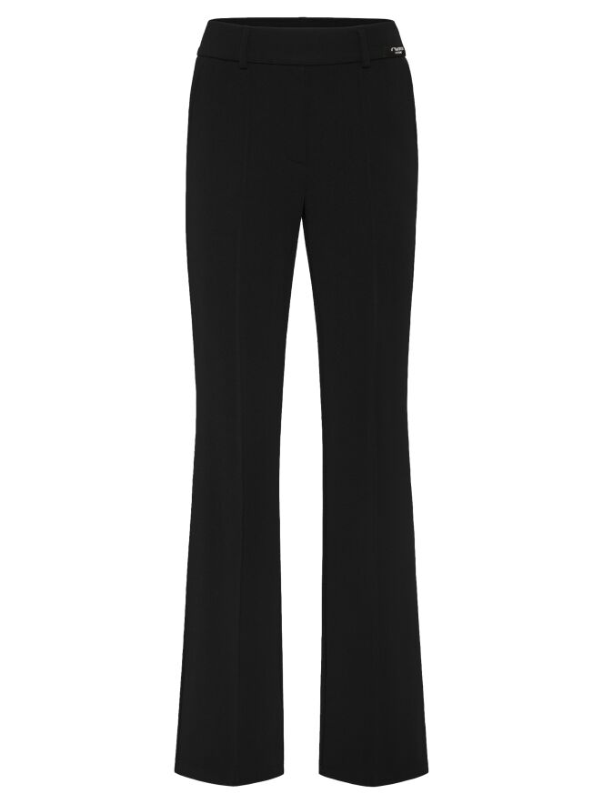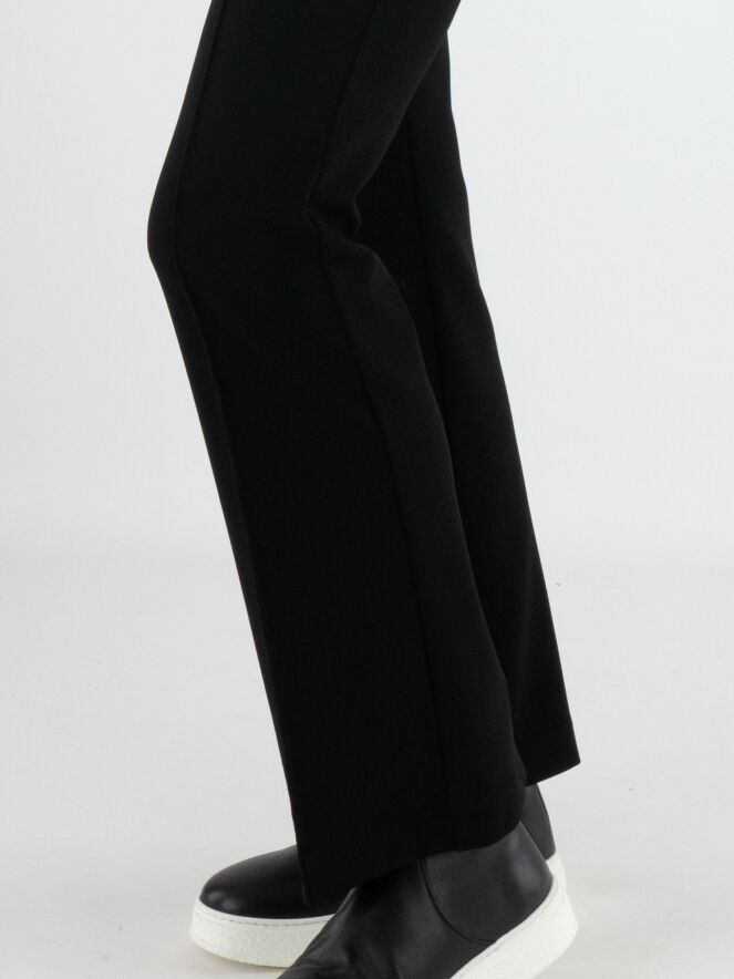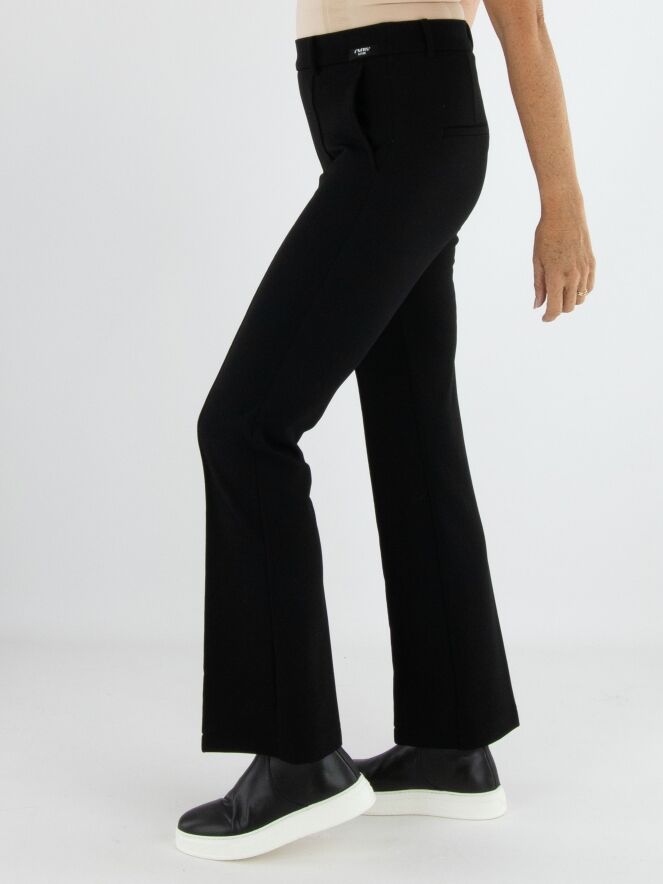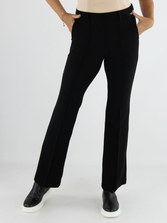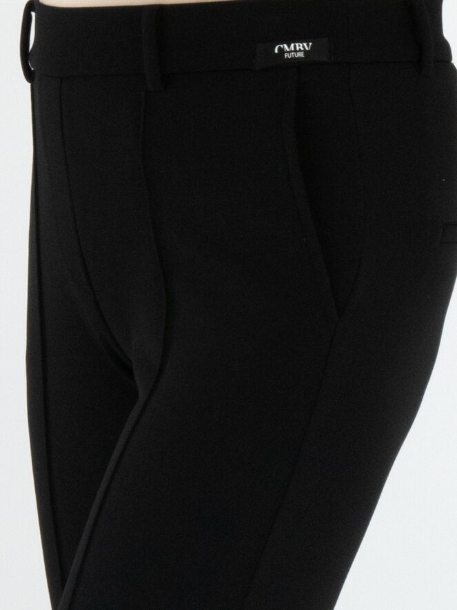 Een broek van Cambio in de kleur zwart. In de taille is de band elastisch. In het midden van de pijpen is een omgekeerde stiknaad. De broek heeft steekzakken en mag met de hand worden gewassen.