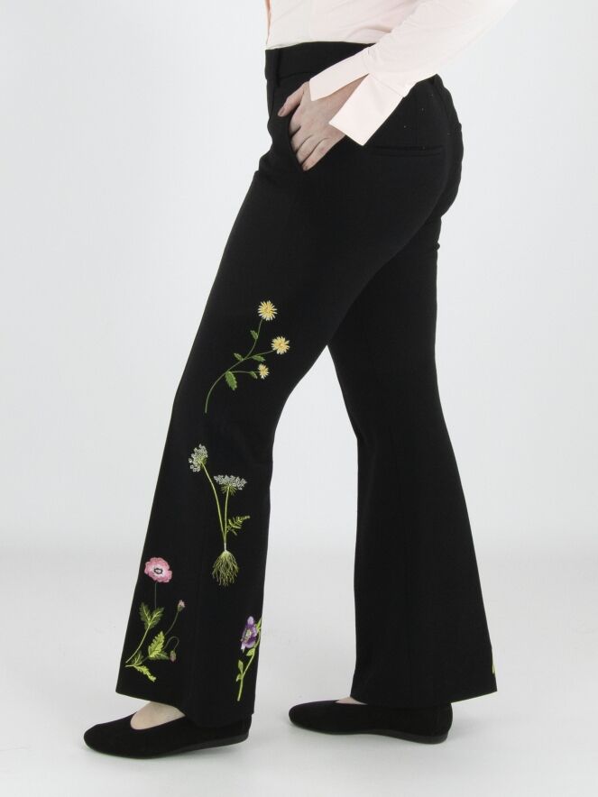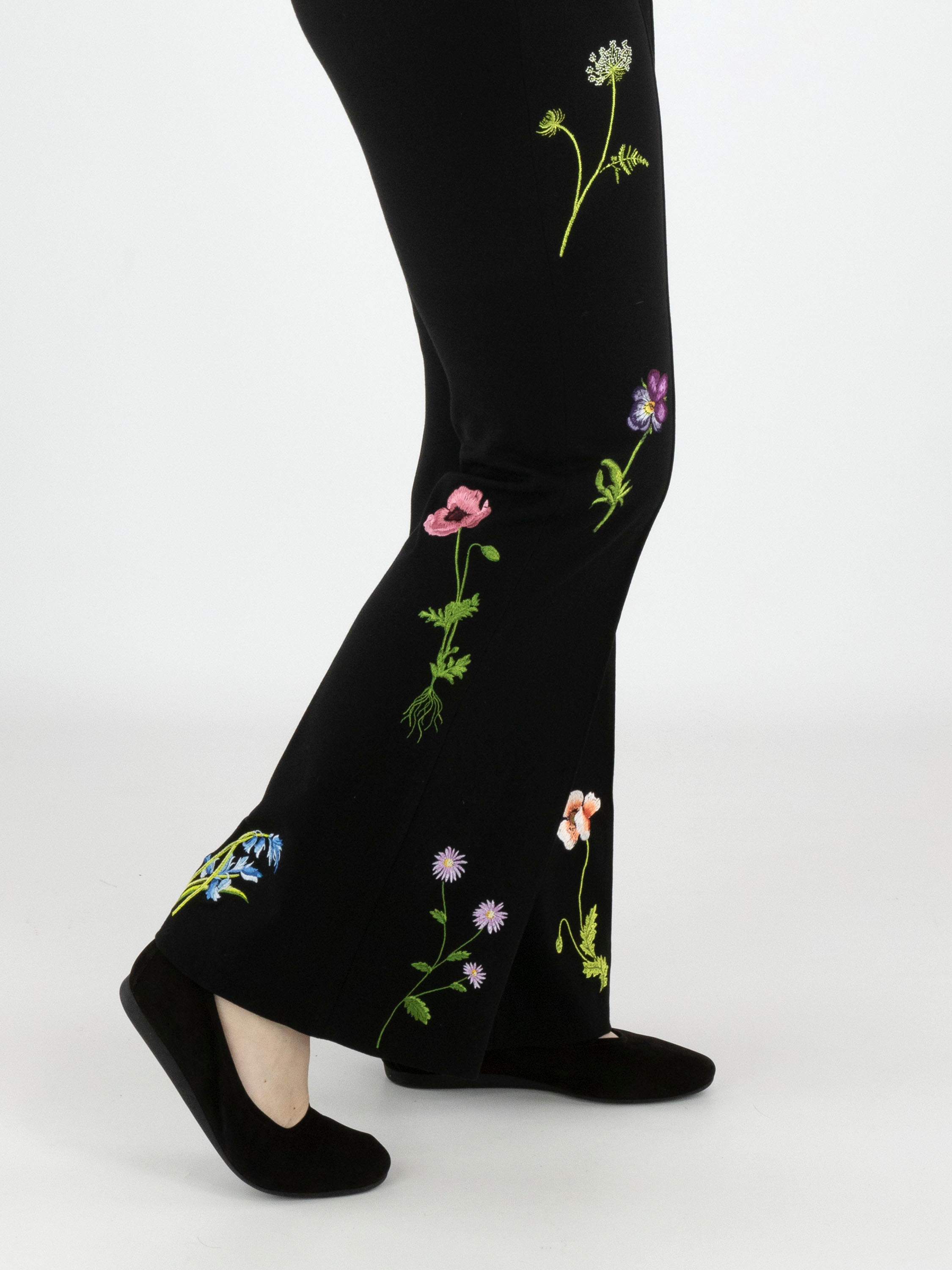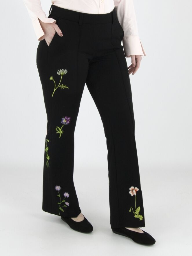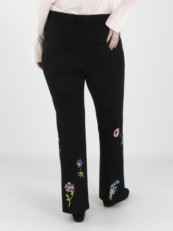 Een broek van Cambio in de kleur zwart met op de pijpen meerdere frisse bloemen geborduurd. In de taille is een elastische band. In het midden van de pijpen is een omgekeerde stiknaad. De broek heeft steekzakken en mag op de hand worden gewassen.