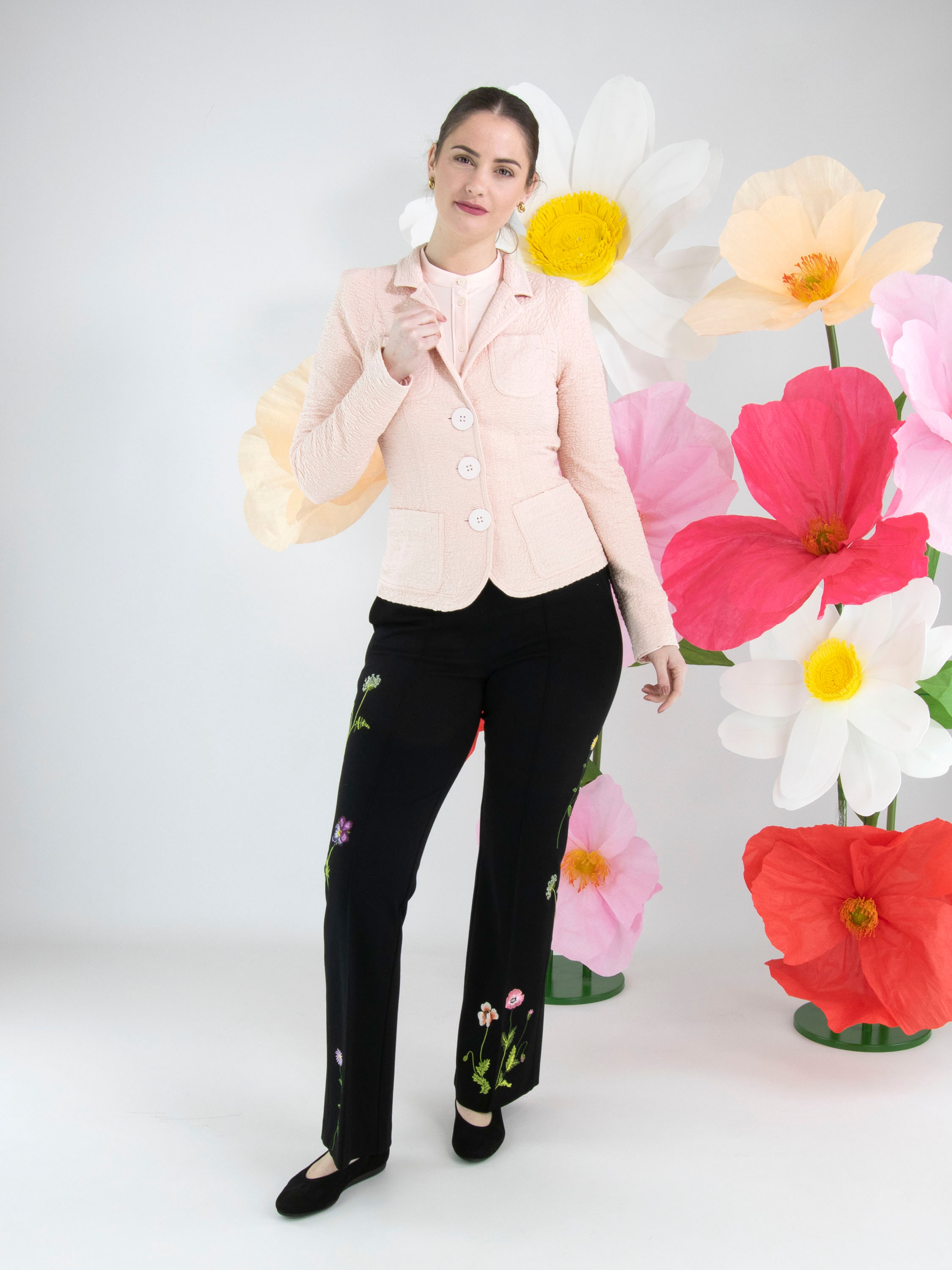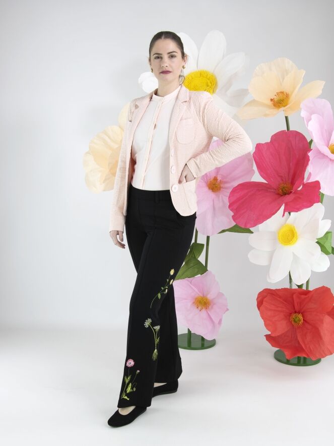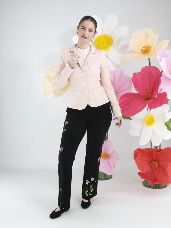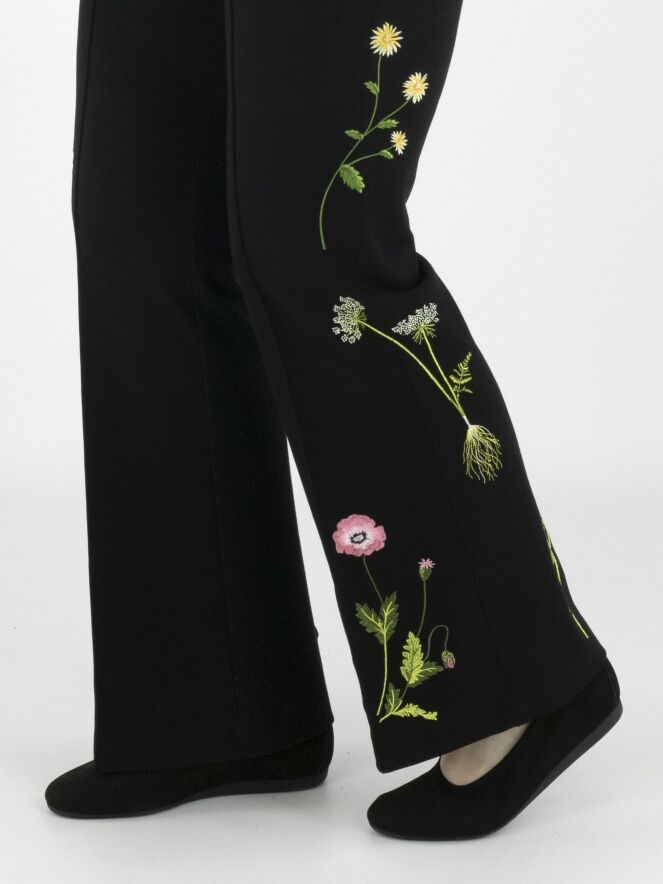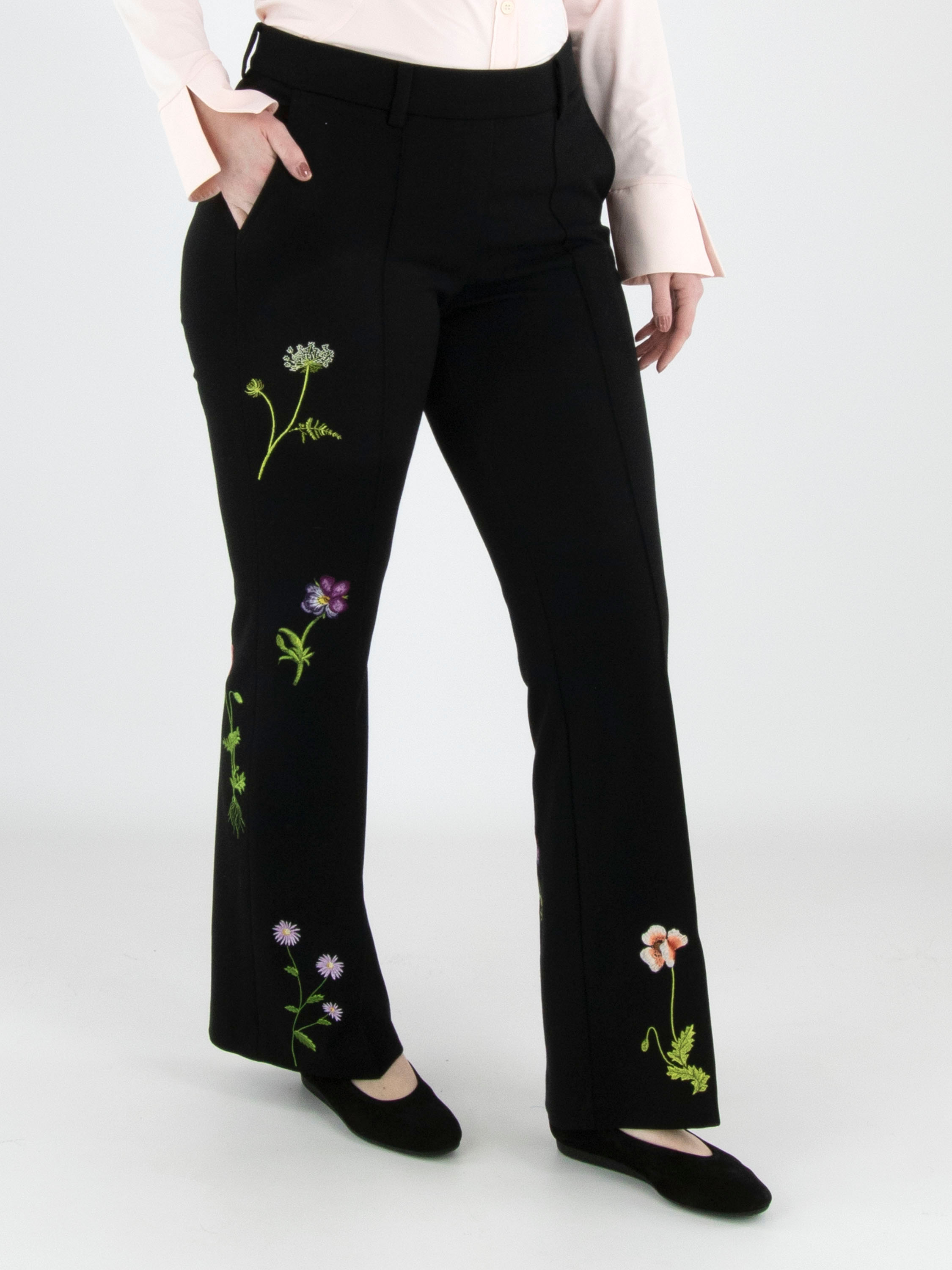 Een broek van Cambio in de kleur zwart met op de pijpen meerdere frisse bloemen geborduurd. In de taille is een elastische band. In het midden van de pijpen is een omgekeerde stiknaad. De broek heeft steekzakken en mag op de hand worden gewassen.