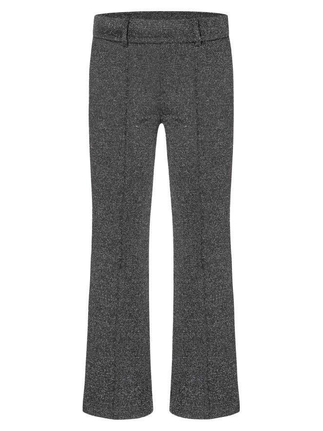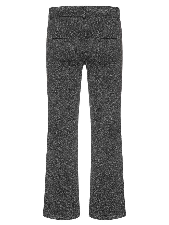 Een flared broek van Cambio in de kleur zwart, met een subtiele zilverdraad door de stof die een glinsterend effect geeft. In het midden van de pijpen loopt een omgekeerde stiknaad. De broek heeft steekzakken en kan met de hand worden gewassen.