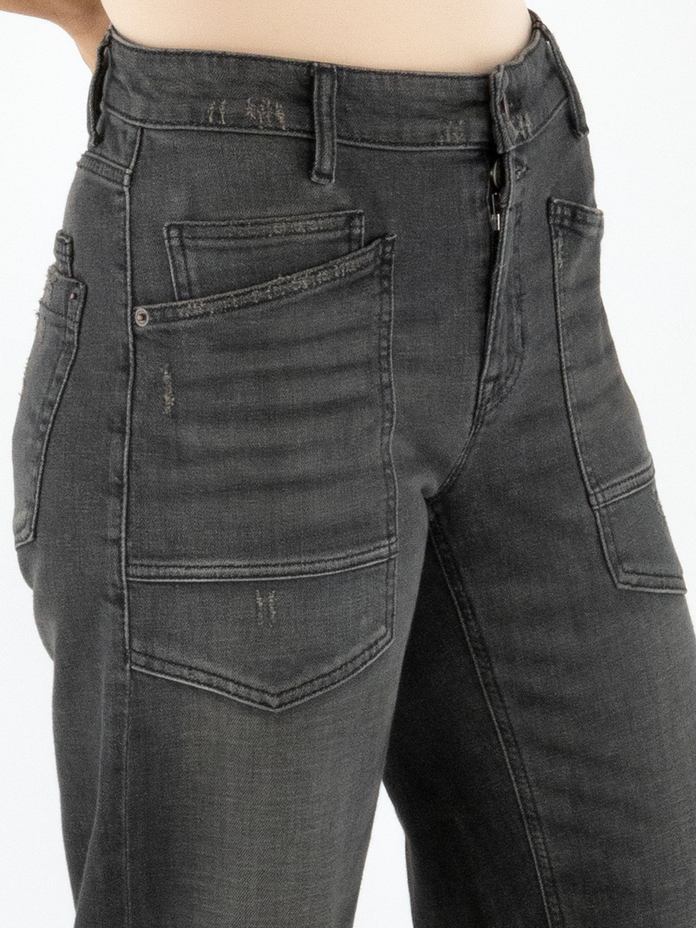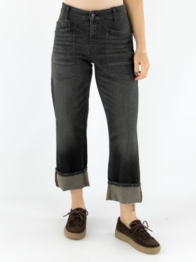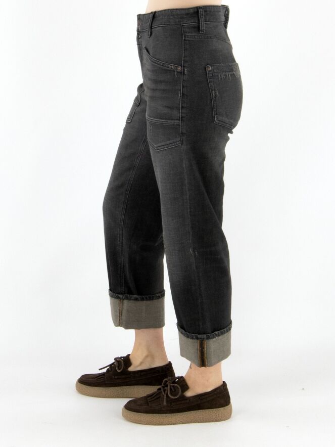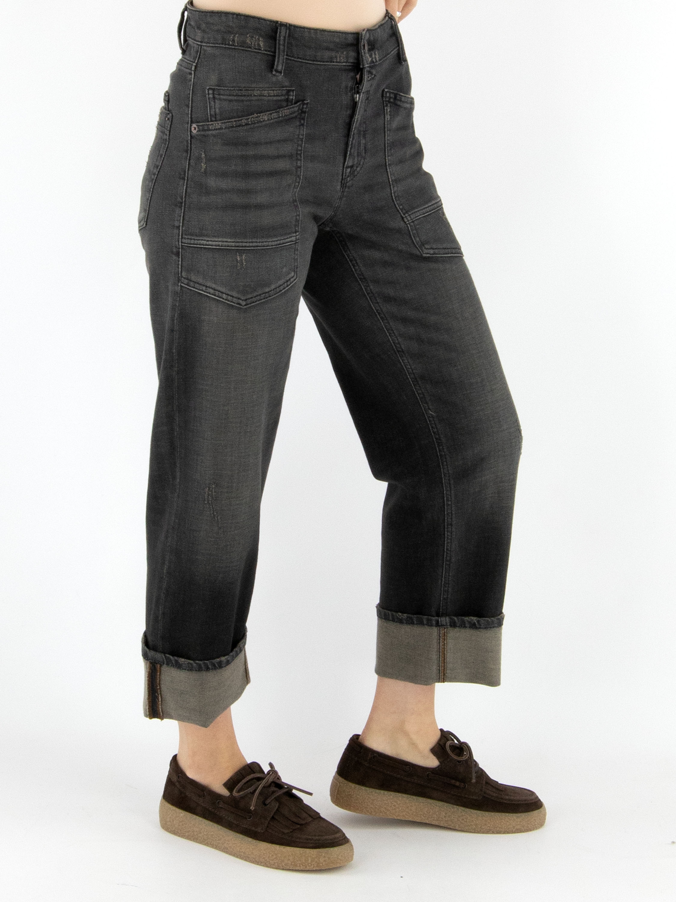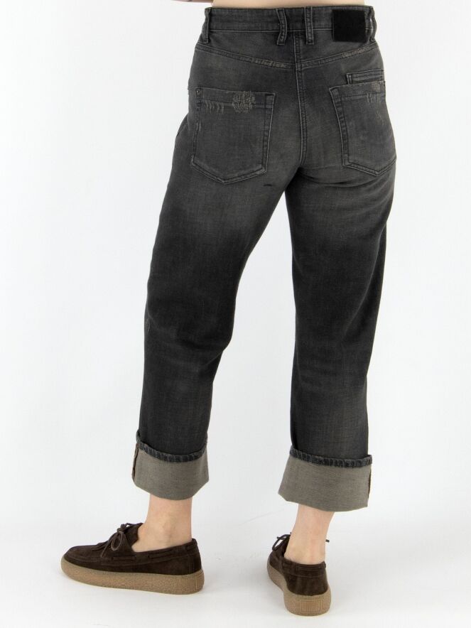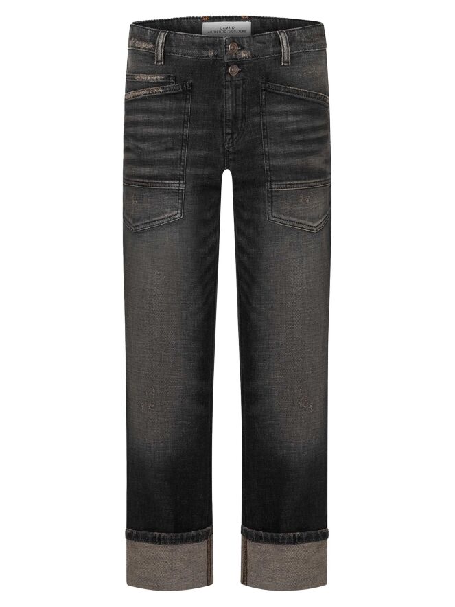 Een stoere used jeans van Cambio in een donkergrijze kleur. Boven de ritssluiting bevindt zich een dubbele knoopsluiting. De jeans is uitgevoerd in een 5-pocket model met verlaagde zakken waarvan de randen diagonaal zijn gesneden. Aan de onderzijde van de pijpen is een brede omslag aangebracht, wat zorgt voor een nonchalante uitstraling. Deze jeans kan op 30 graden worden gewassen.