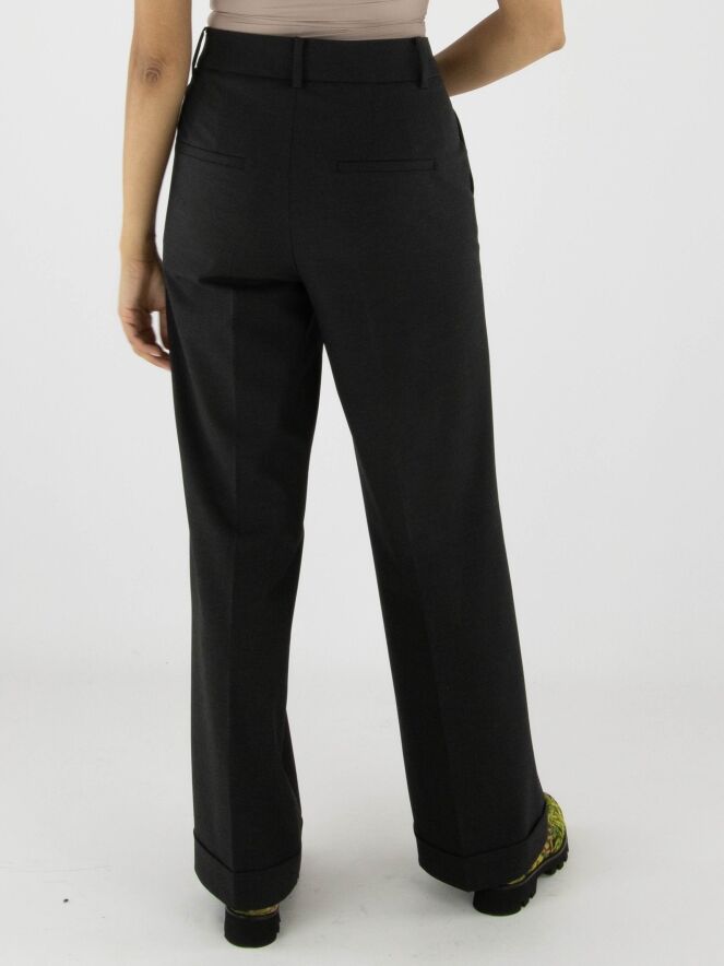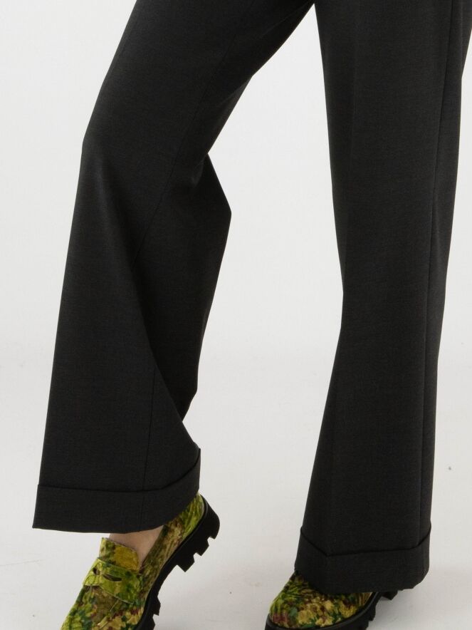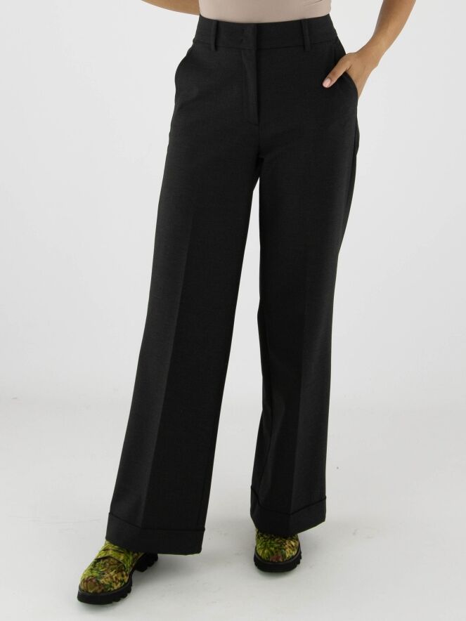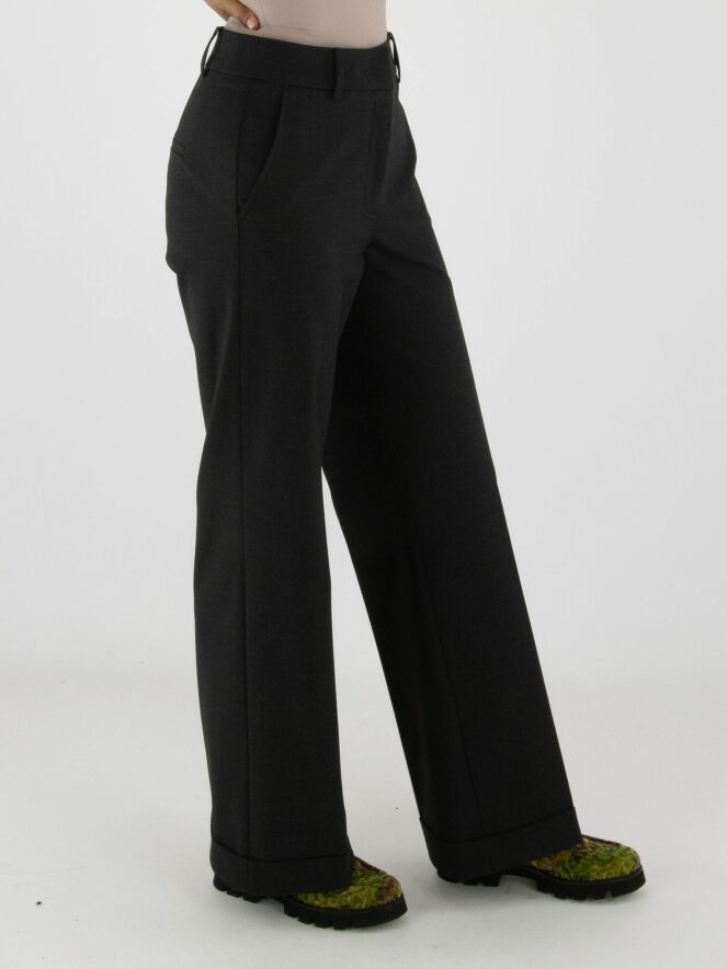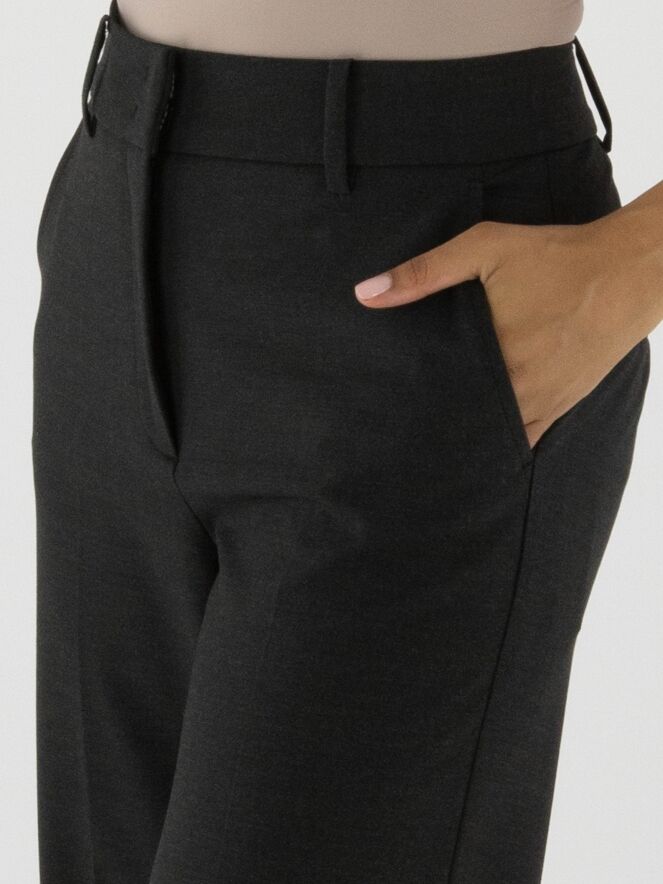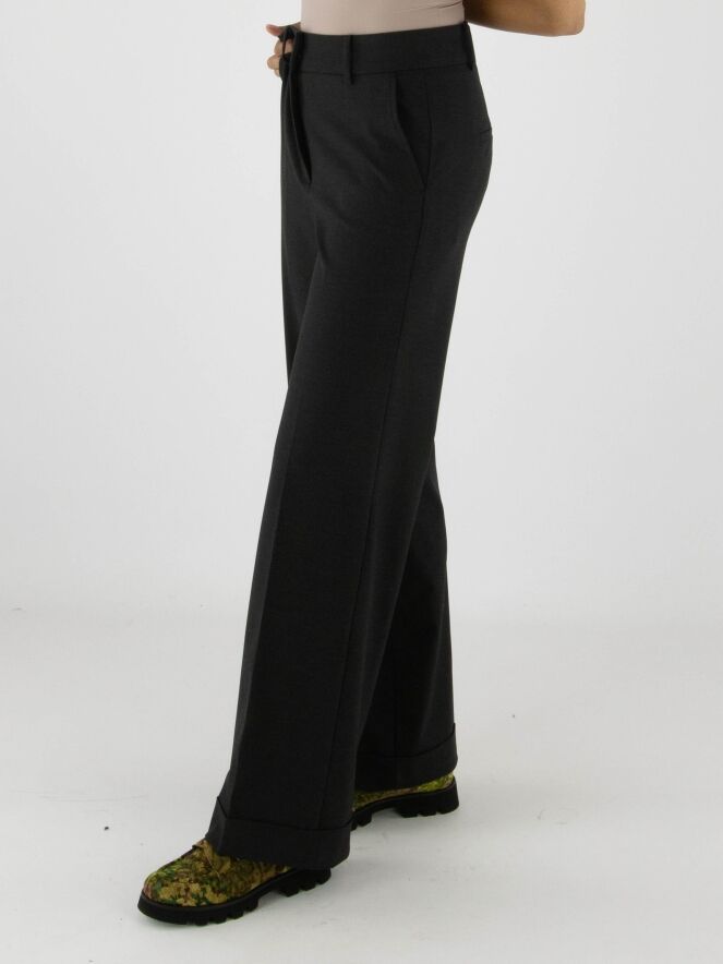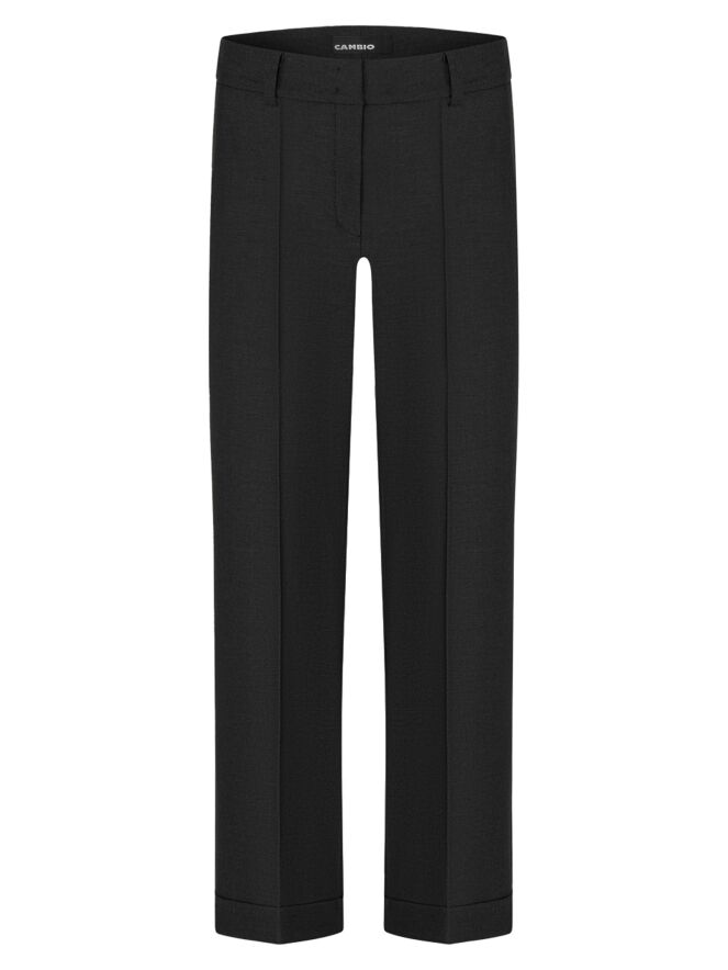 Een broek van Cambio in de kleur antracietgrijs. In het midden van de pijpen is een ingestreken plooi. De broek heeft steekzakken en is recht gesneden. Deze broek mag op 30 graden worden gewassen.