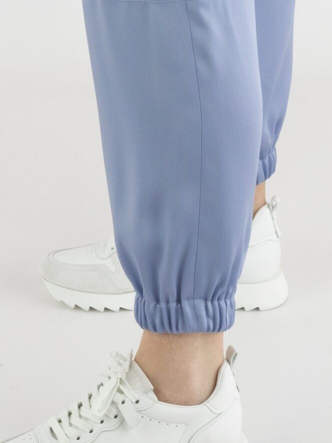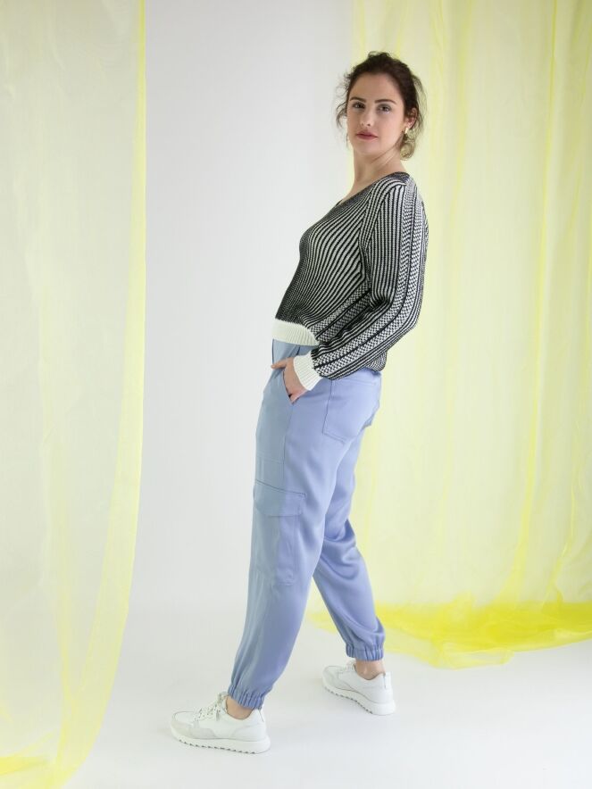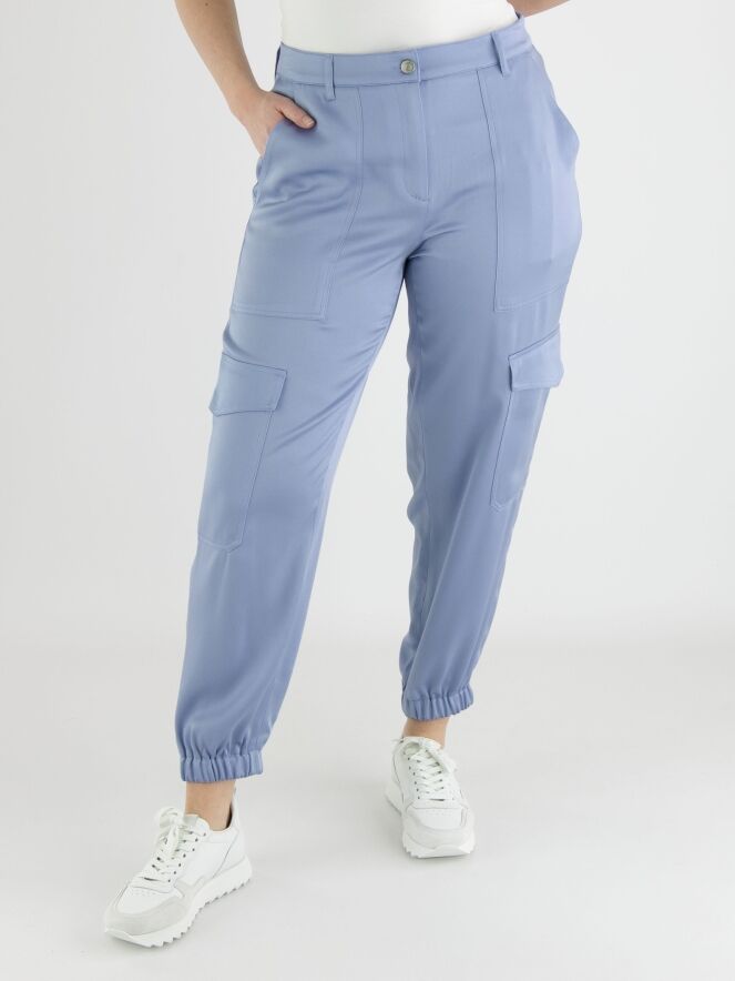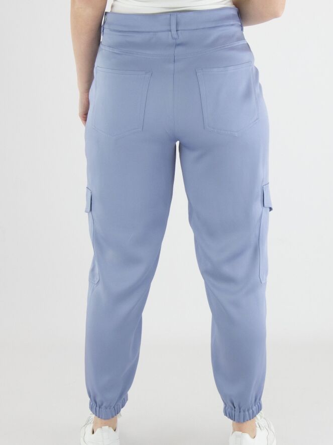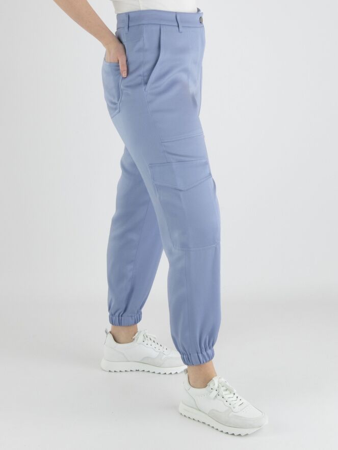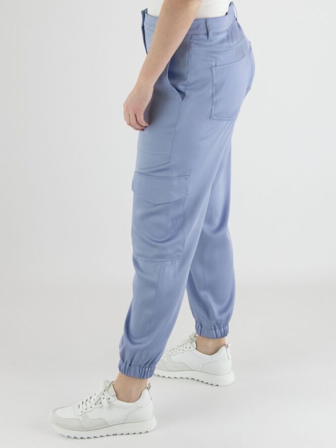 Een mat satijnen cargo broek van Cambio in een lavendel blauwe kleur. Aan de onderkant is een fijn geplooide elastieken boord. De broek heeft steekzakken en mag op de hand worden gewassen.