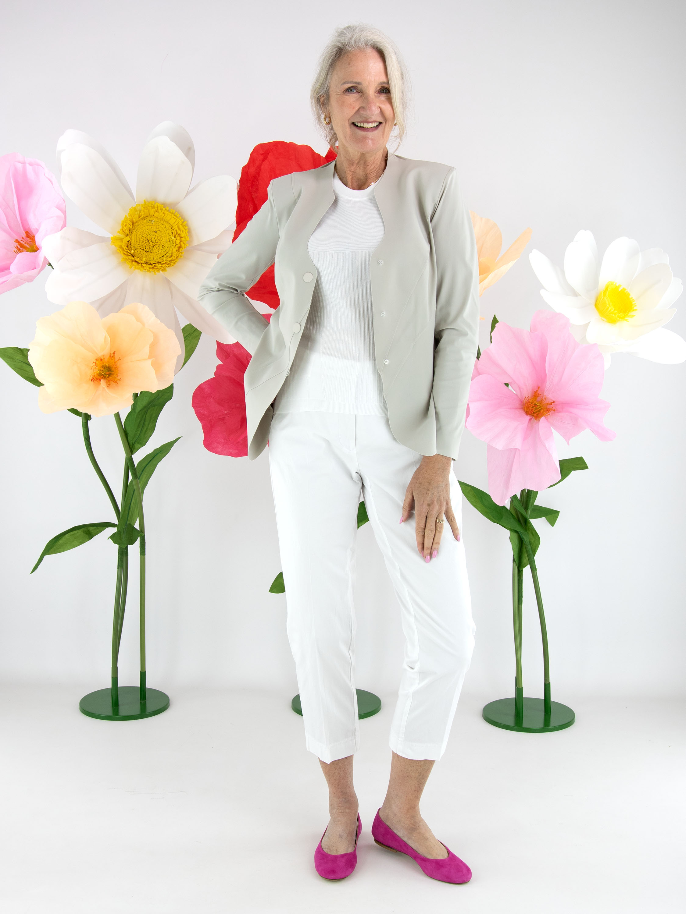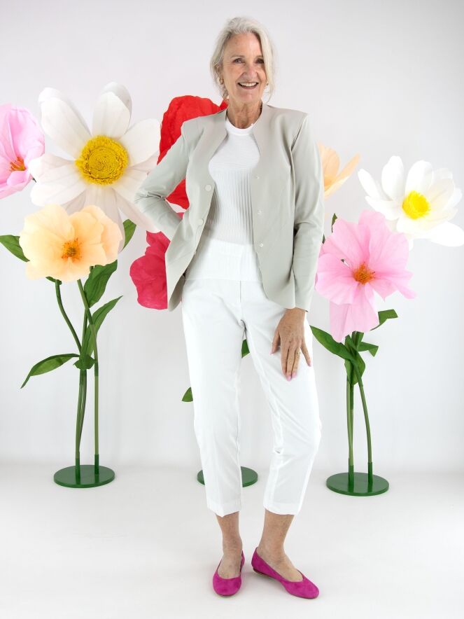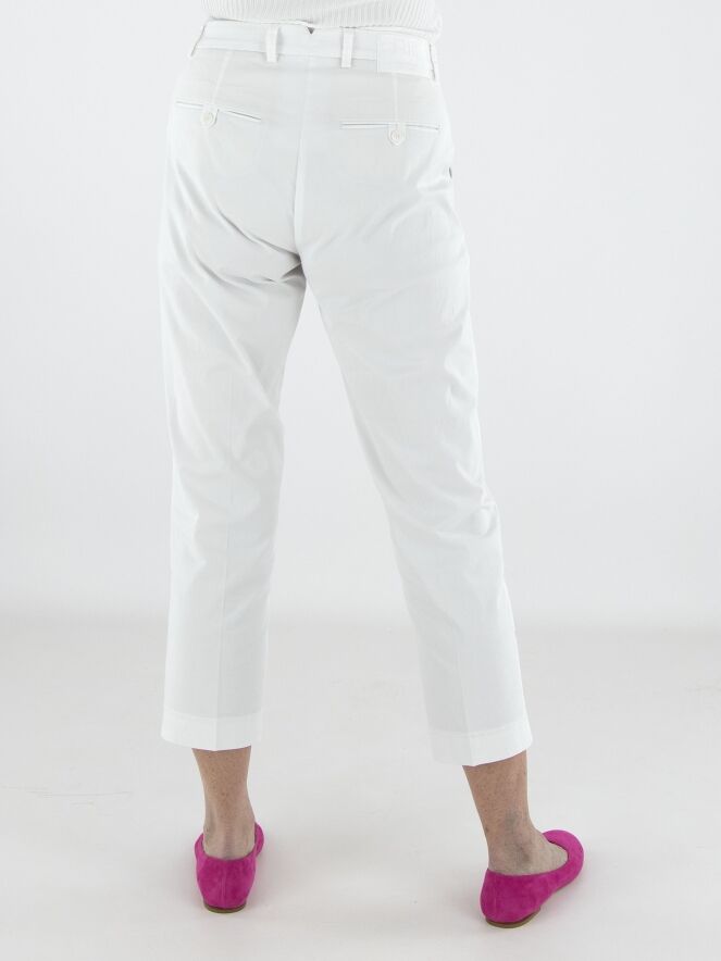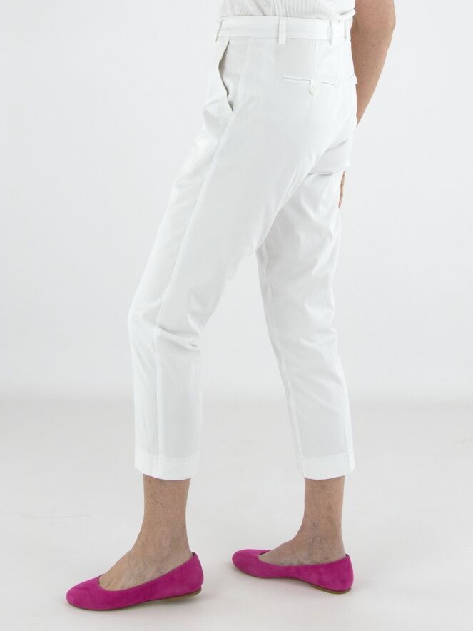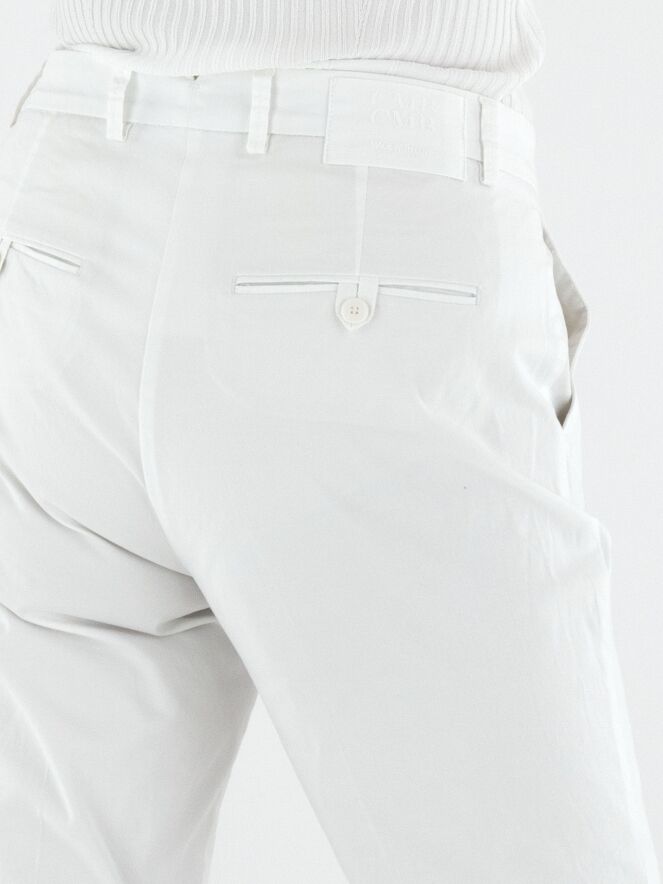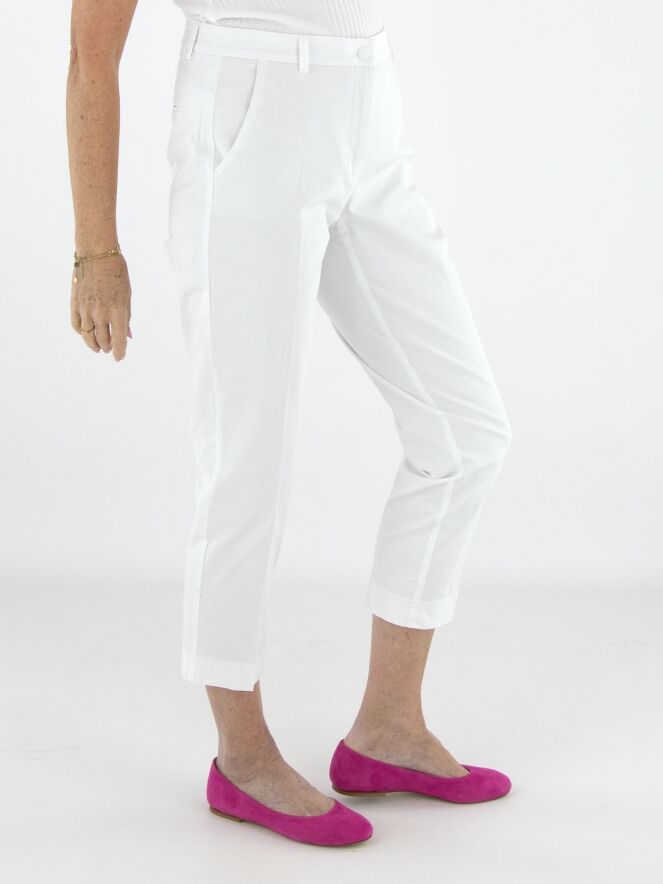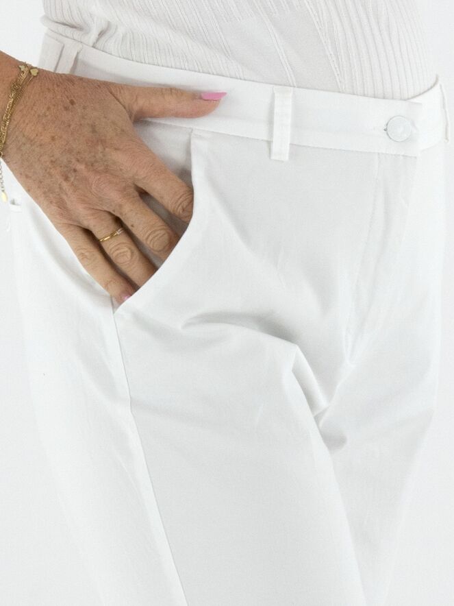 Broek van Cambio in een frisse witte tint. In het midden van de pijpen is een ingestreken plooi aangebracht, wat zorgt voor een verfijnde en tijdloze uitstraling. De broek is voorzien van steekzakken en kan op 30 graden worden gewassen.