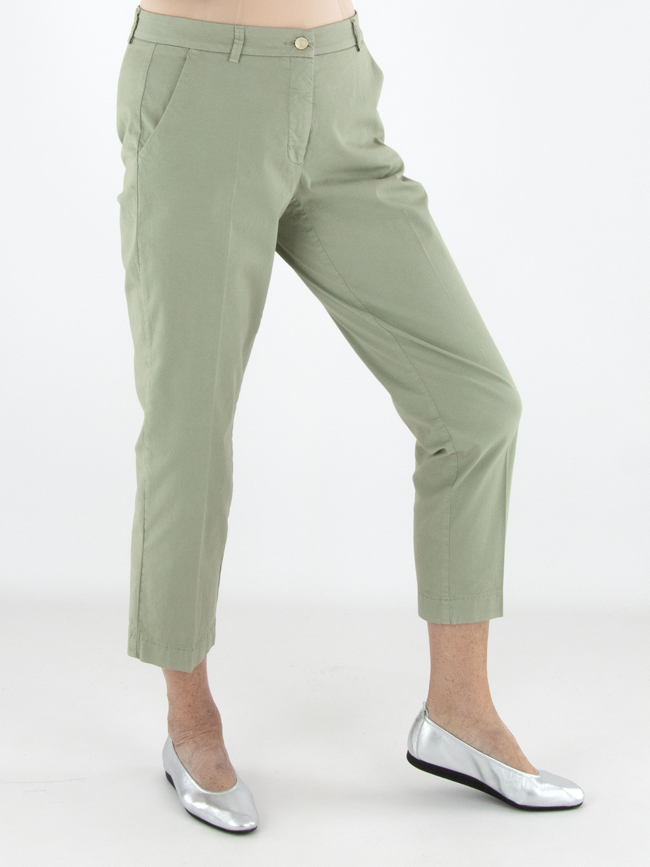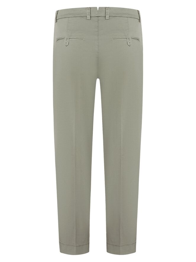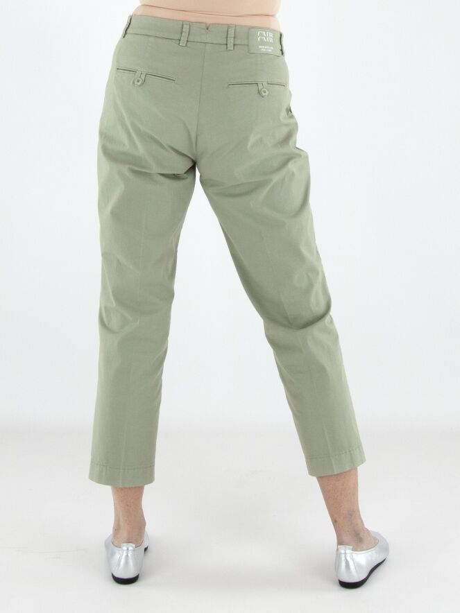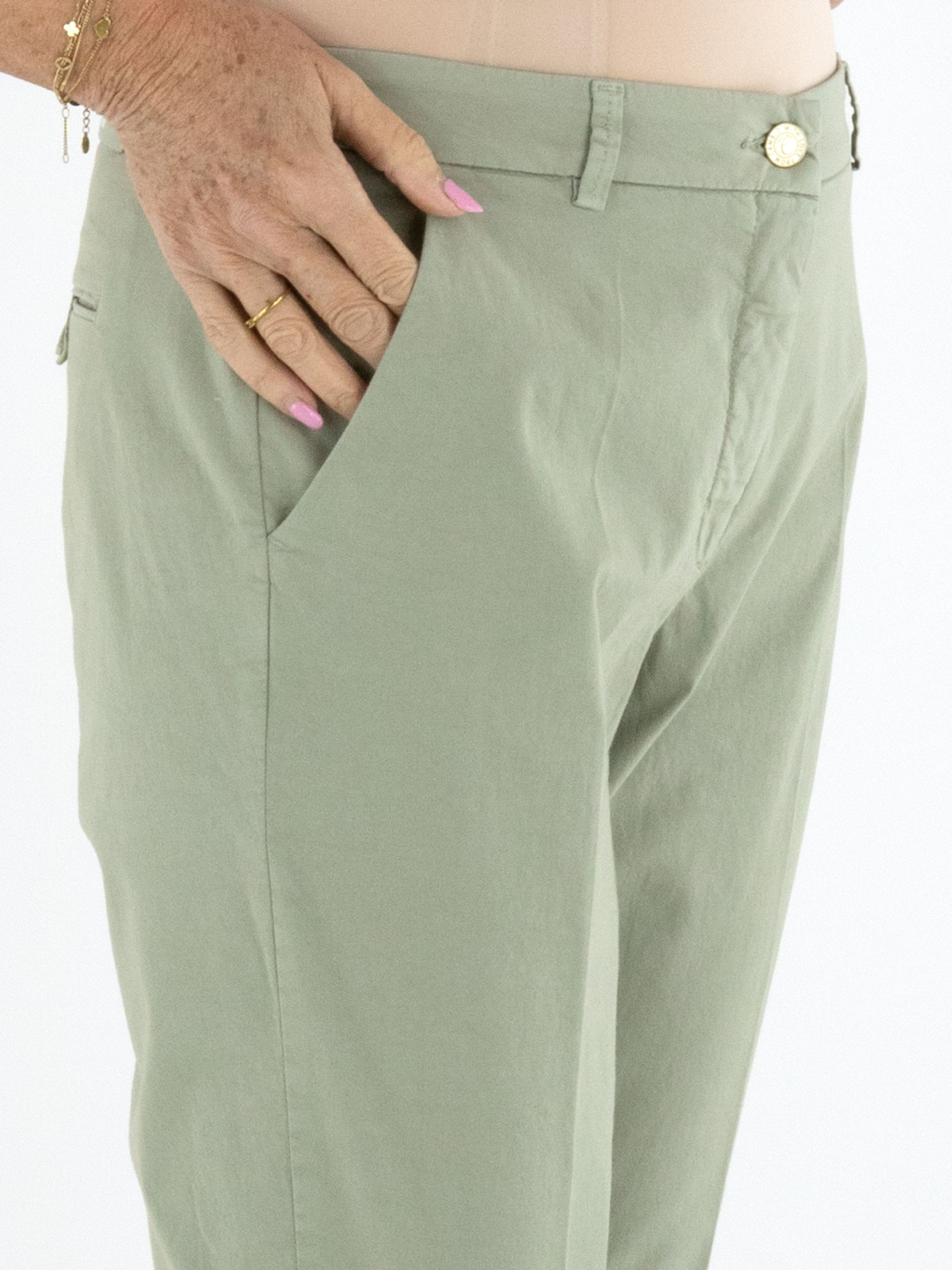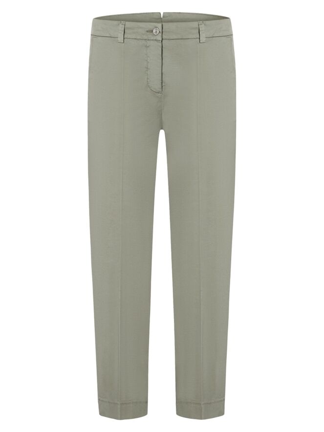 Broek van Cambio in een zachte olijfgroene tint. In het midden van de pijpen is een ingestreken plooi aangebracht, wat zorgt voor een verfijnde en tijdloze uitstraling. De broek is voorzien van steekzakken en kan op 30 graden worden gewassen.