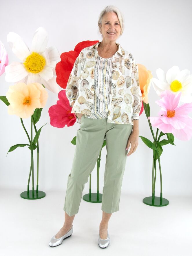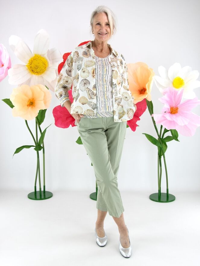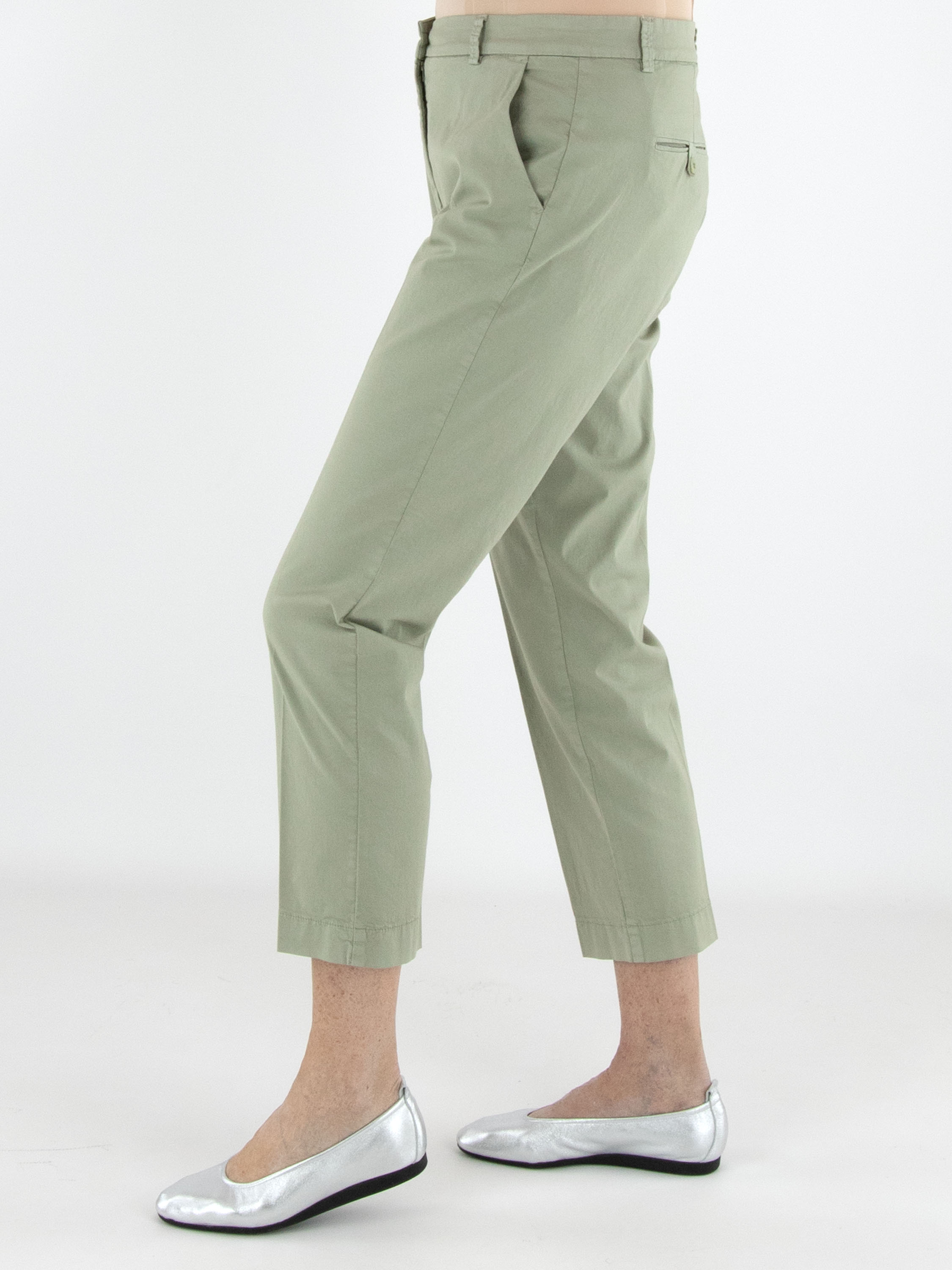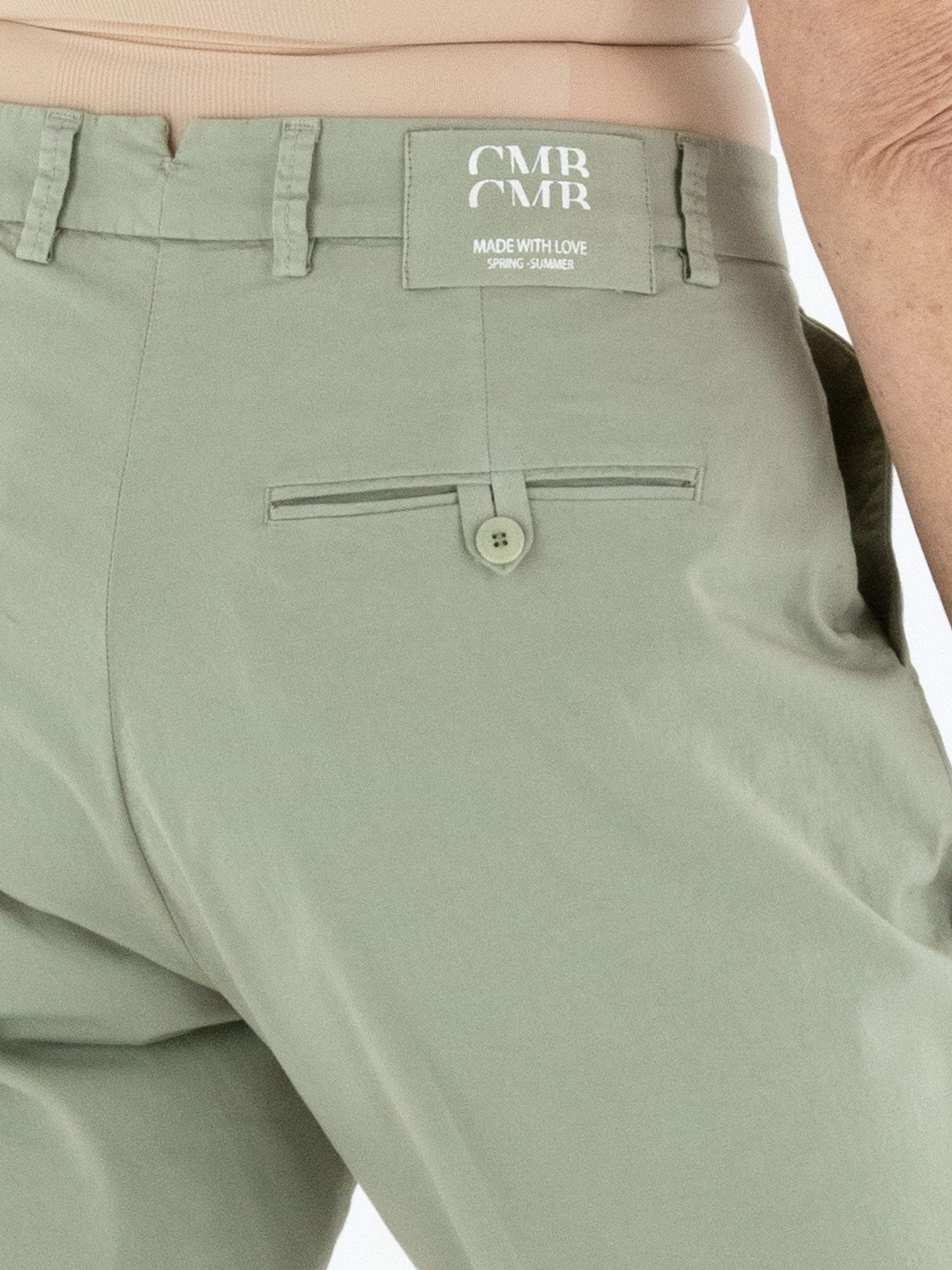 Broek van Cambio in een zachte olijfgroene tint. In het midden van de pijpen is een ingestreken plooi aangebracht, wat zorgt voor een verfijnde en tijdloze uitstraling. De broek is voorzien van steekzakken en kan op 30 graden worden gewassen.