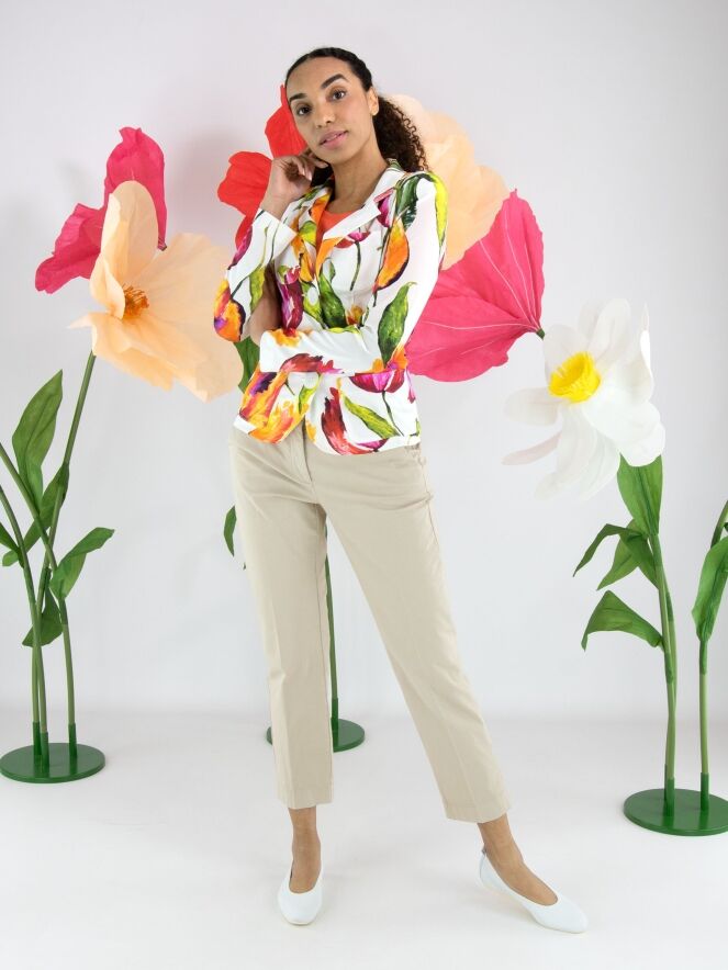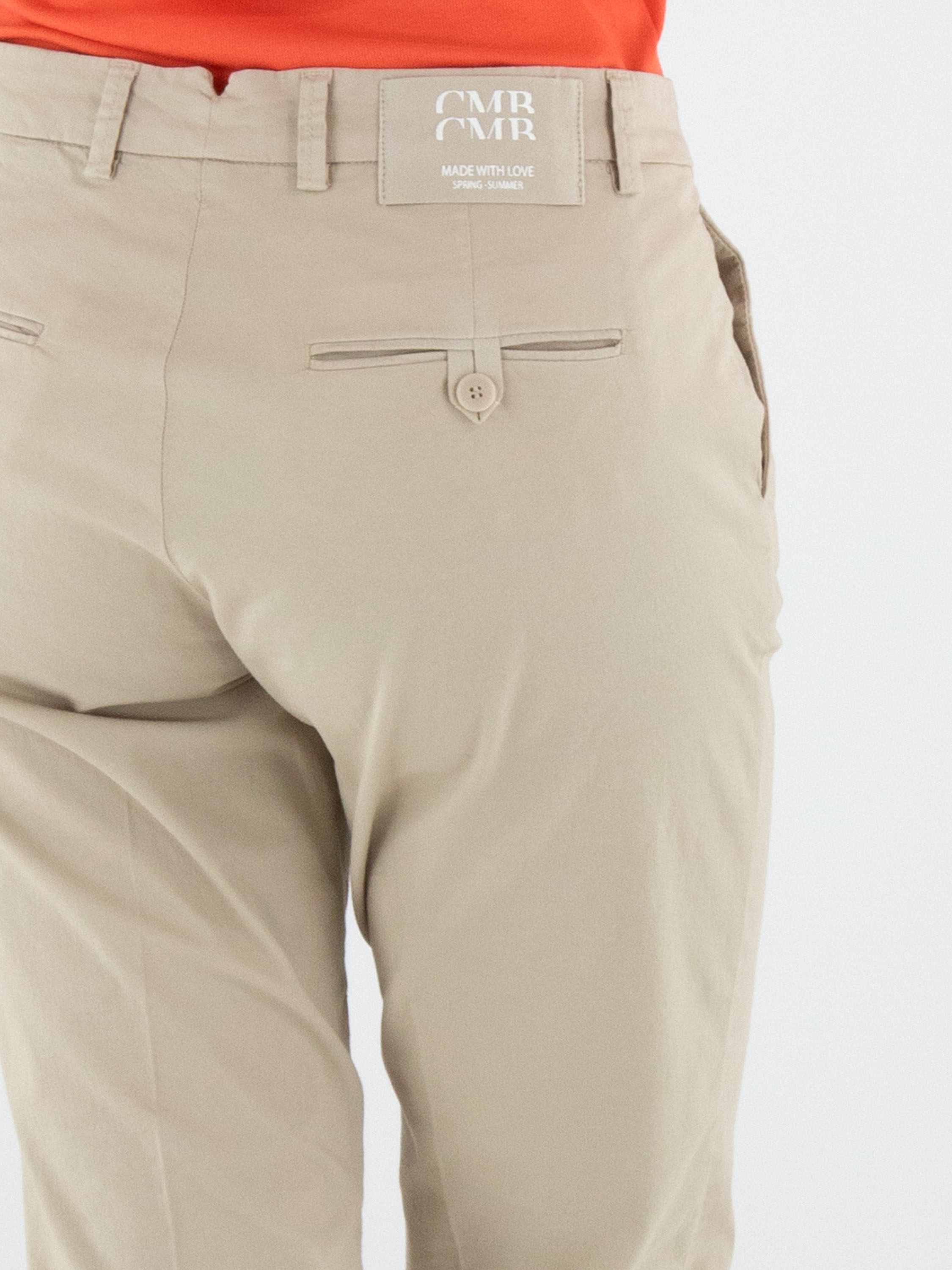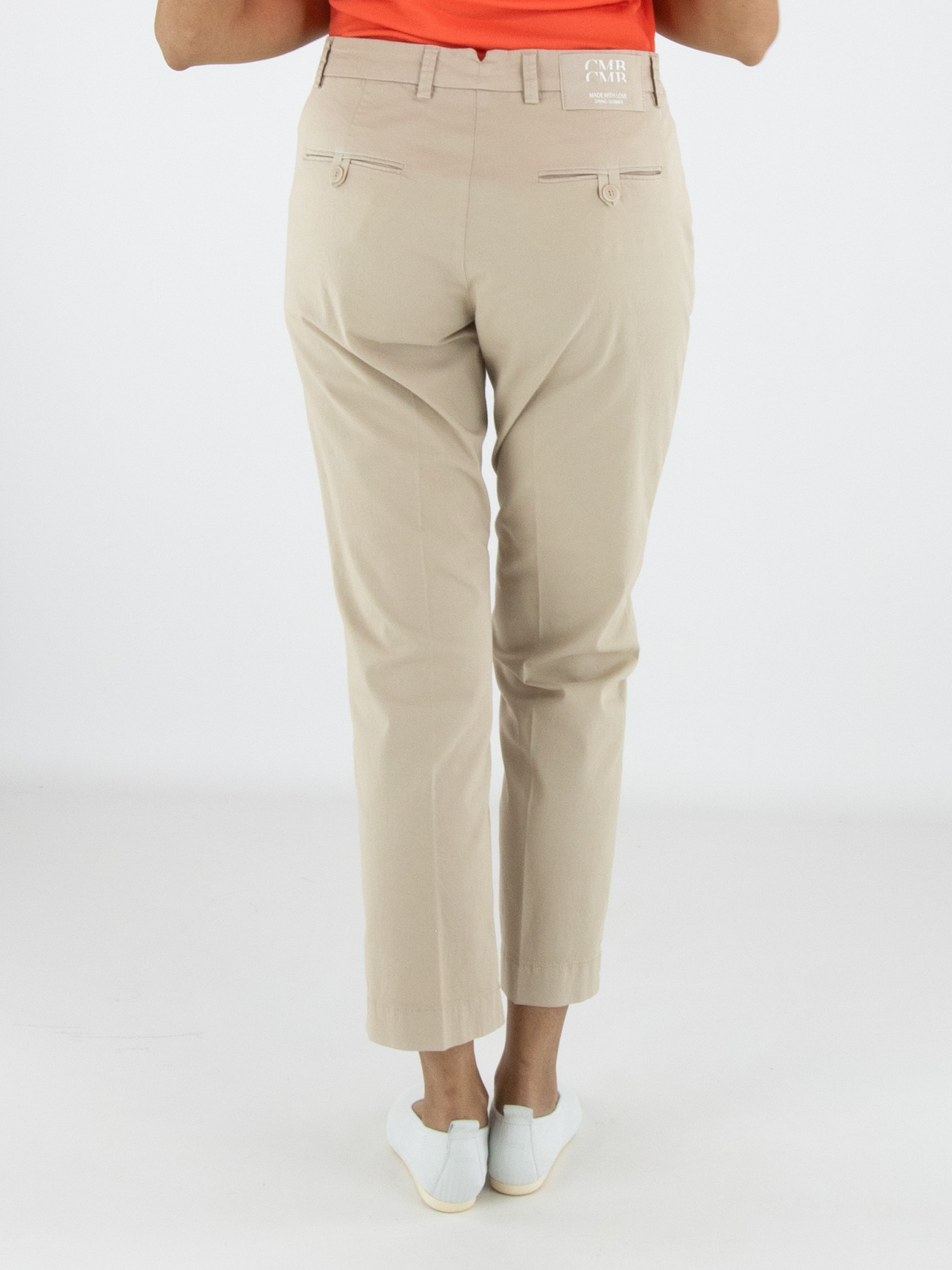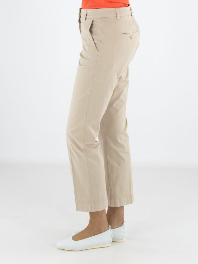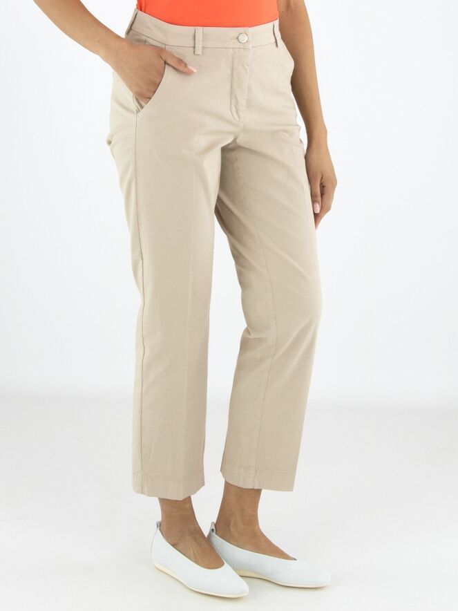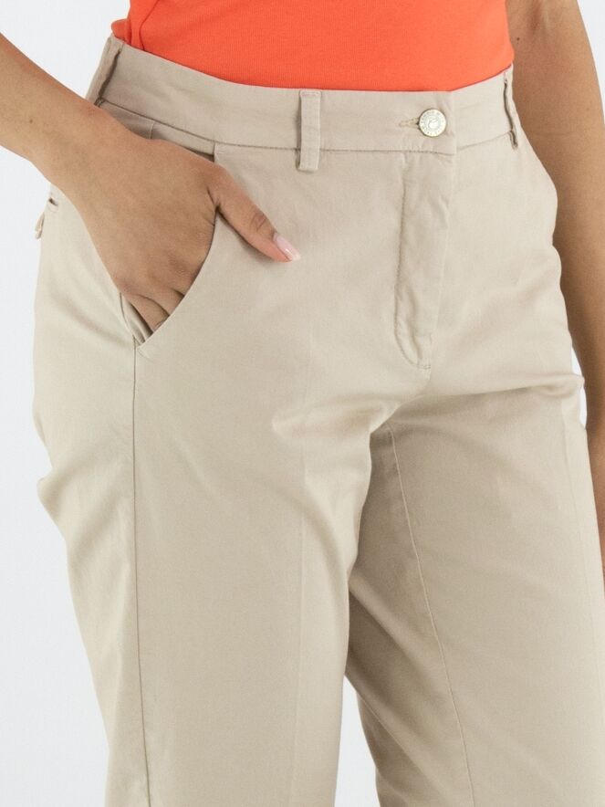Broek van Cambio in een elegante zandkleur. In het midden van de pijpen is een ingestreken plooi aangebracht, wat zorgt voor een verfijnde en tijdloze uitstraling. De broek is voorzien van steekzakken en kan op 30 graden worden gewassen.