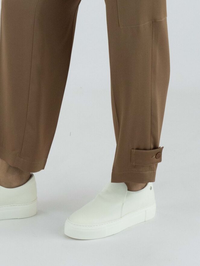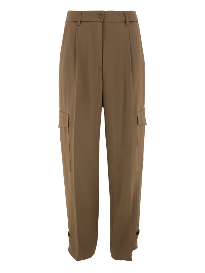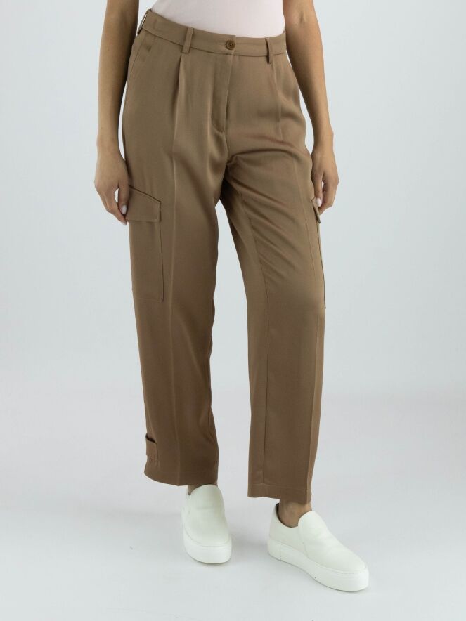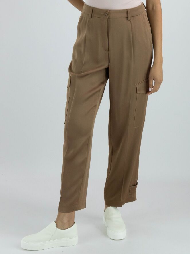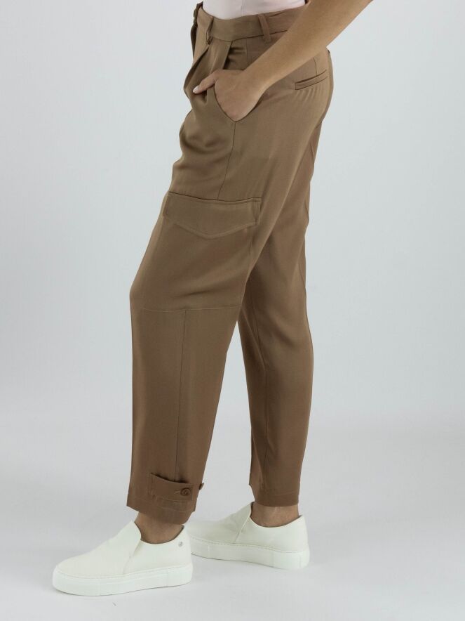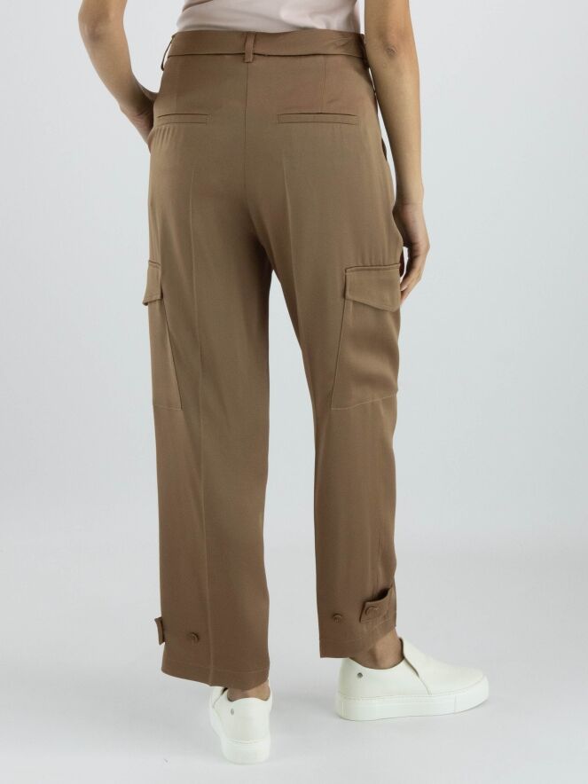 Een luxe mat satijnen cargo broek van Cambio in de kleur goud. De broek heeft steekzakken en in het midden van de pijpen is een ingestreken plooi. Aan de onderkant van de pijpen is een decoratieve gesp waarmee de pijpen iets smaller kunnen worden gemaakt. Deze broek mag op de hand worden gewassen.