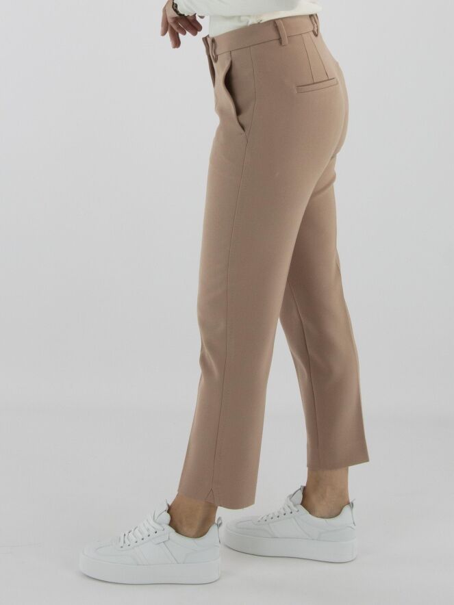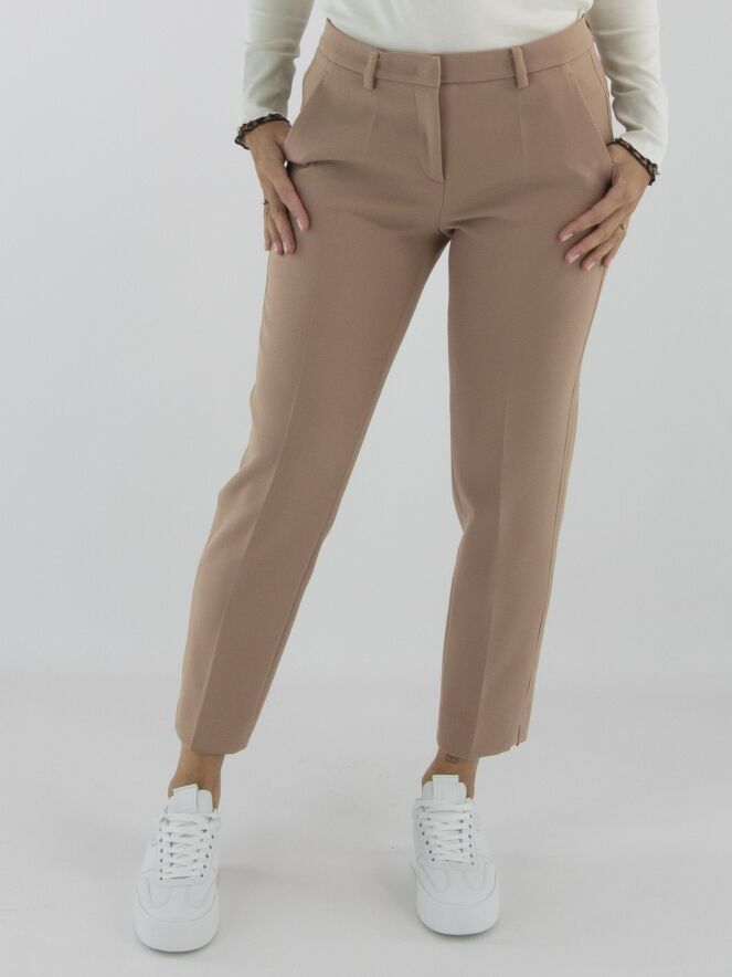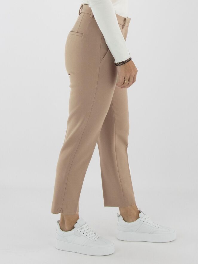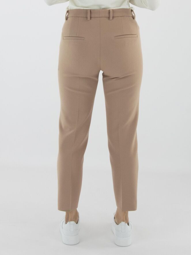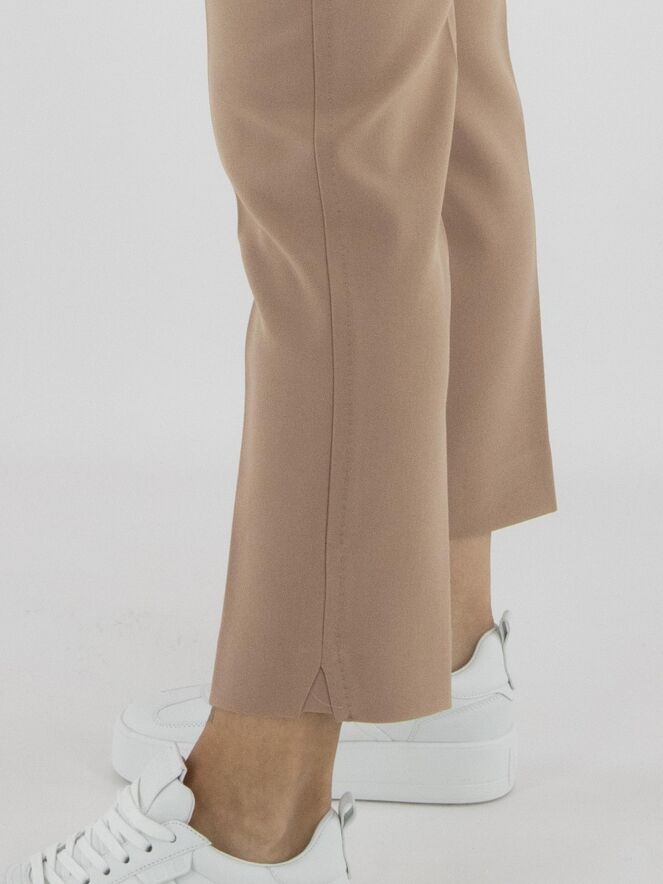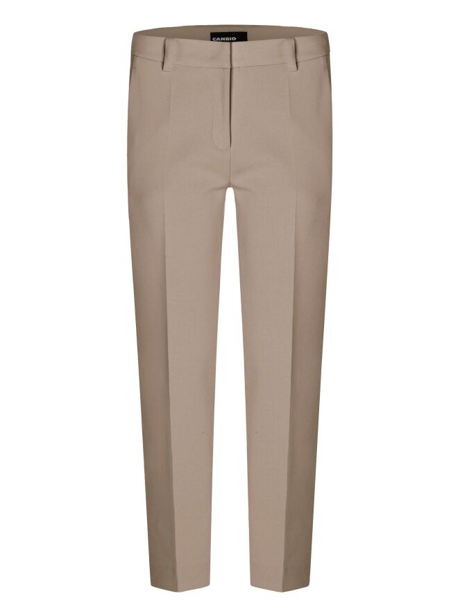 Een broek van Cambio in klassiek camel. Deze elegante damesbroek is voorzien van steekzakken en een ingestreken plooi midden over de pijpen, wat zorgt voor een slanke en tijdloze uitstraling. Voor langdurig draagplezier wordt aangeraden de broek met de hand te wassen.