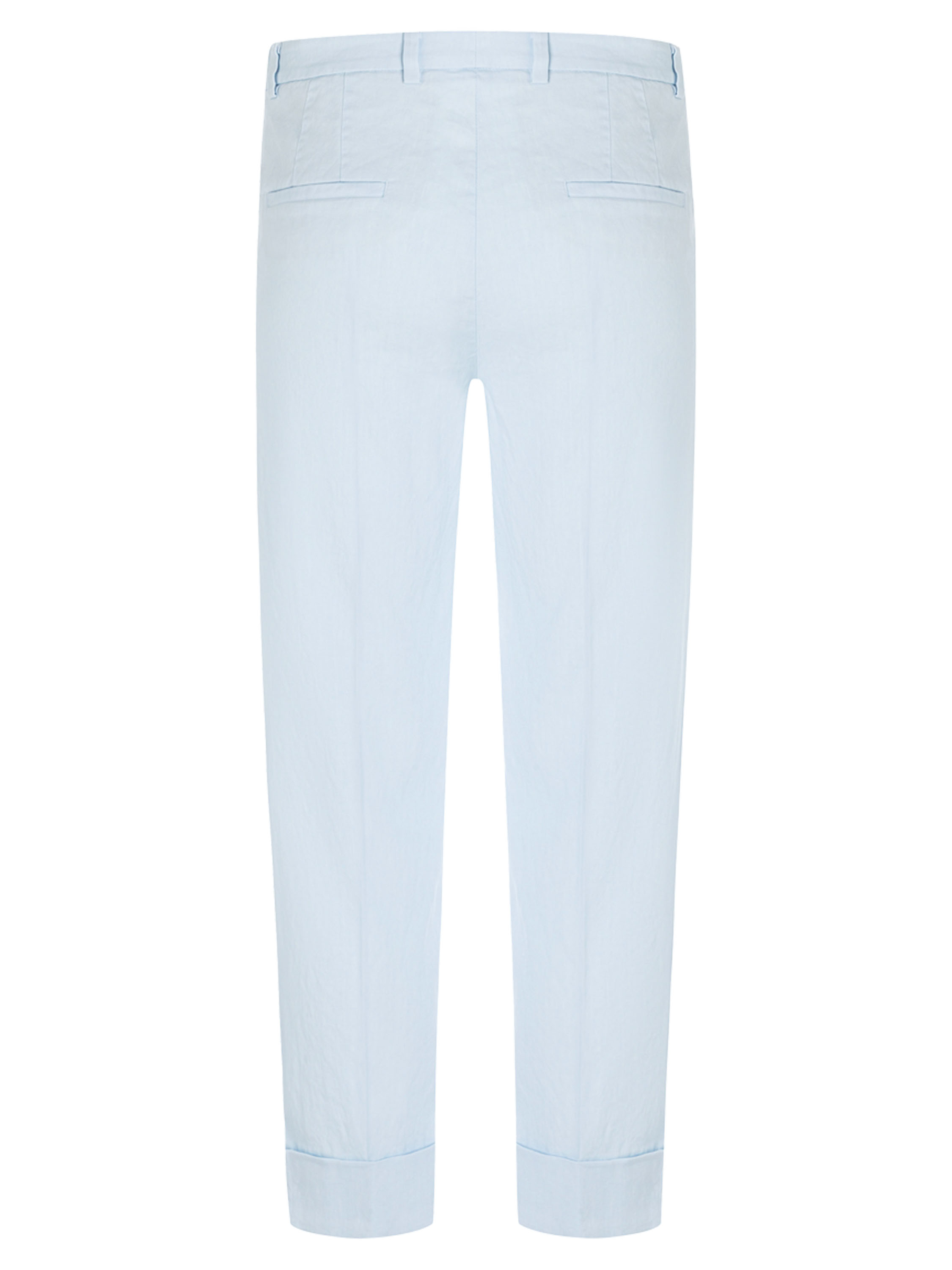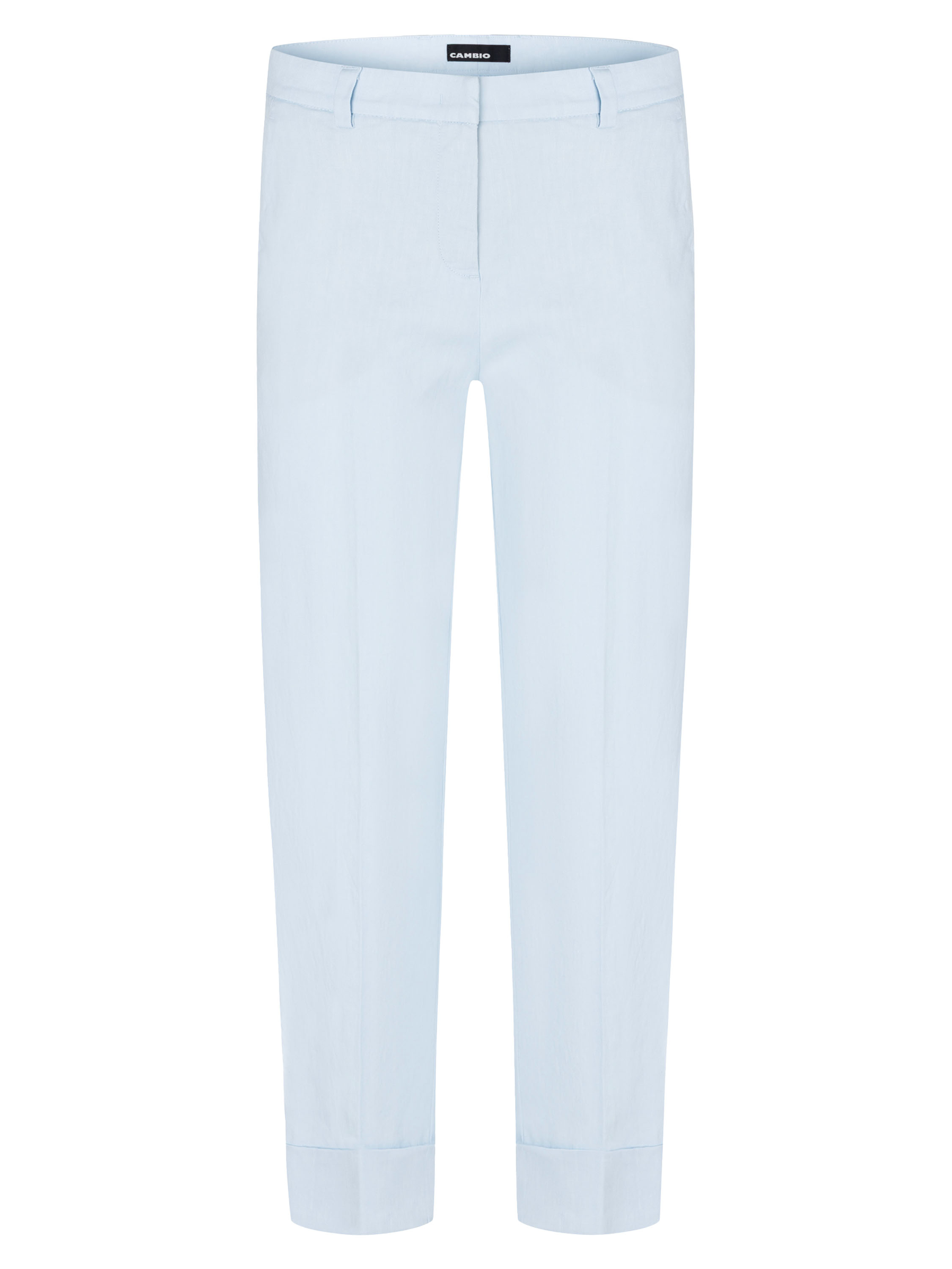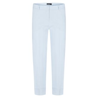Broek van Cambio in een zachte pastel lichtblauwe tint. In het midden van de pijpen is een ingestreken plooi aangebracht, wat zorgt voor een elegante en verfijnde uitstraling. De brede omslag aan de onderzijde van de pijpen geeft het model een moderne en eigentijdse touch. De broek is voorzien van steekzakken en kan met de hand worden gewassen.